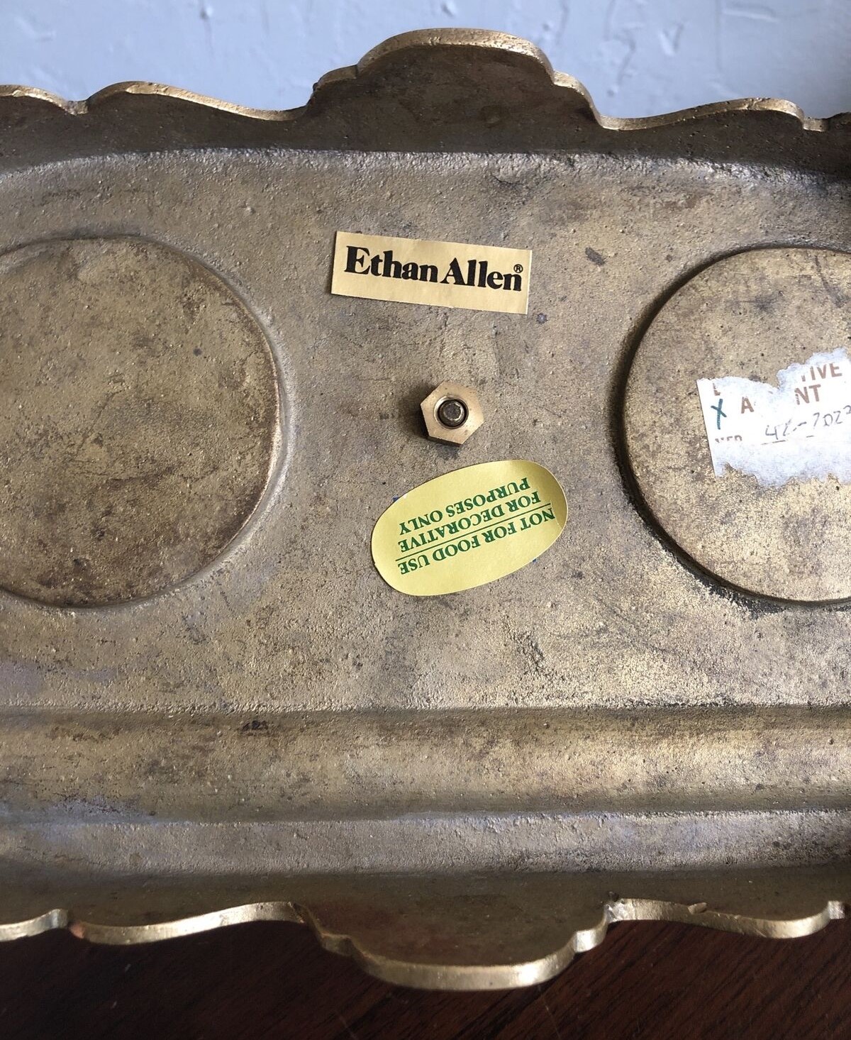 The seller of this Ethan Allen brass double inkstand left the original labels on, advertising this modern production to be used in decorating. Some sellers remove the labels, selling it as “vintage”.
