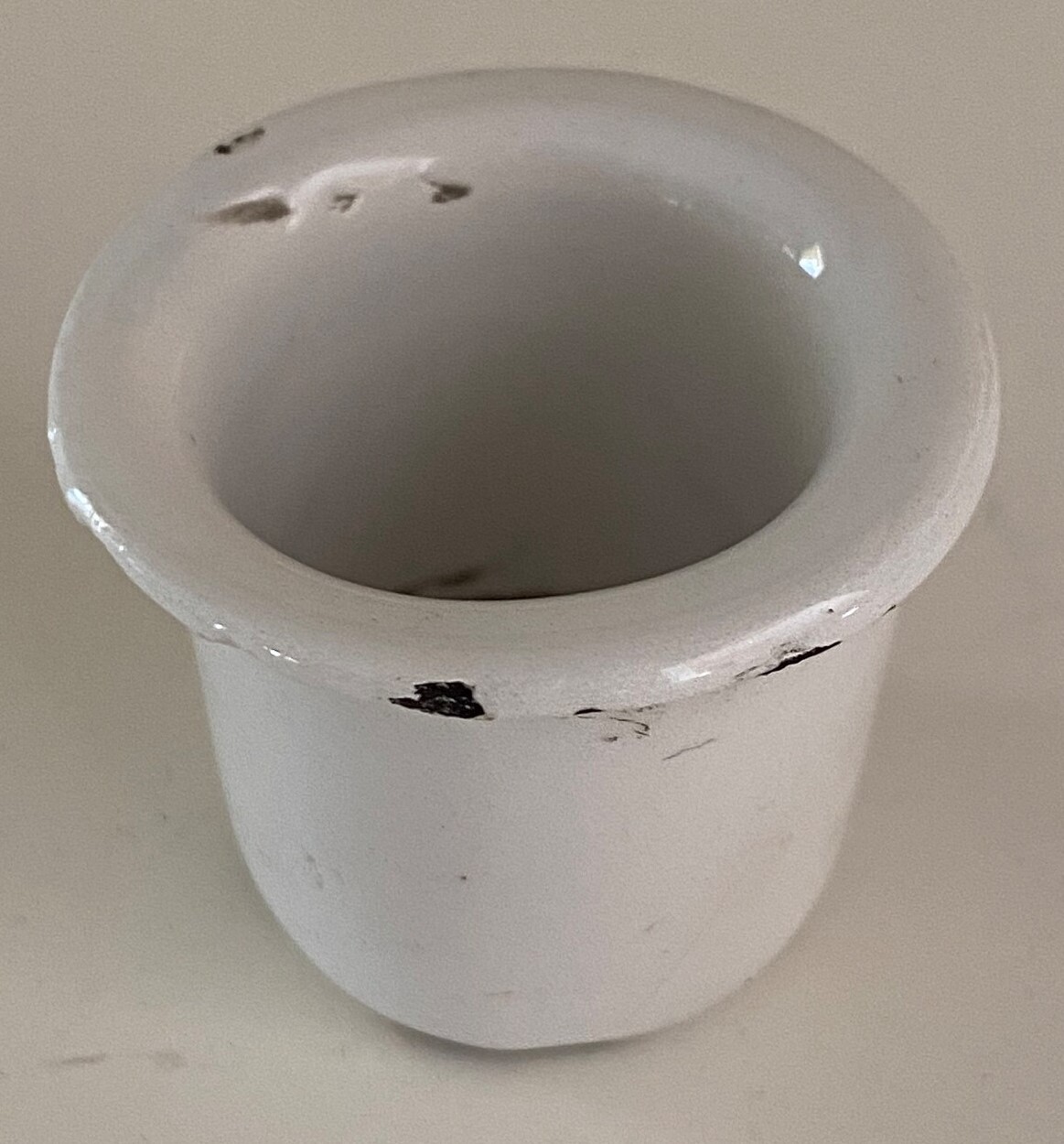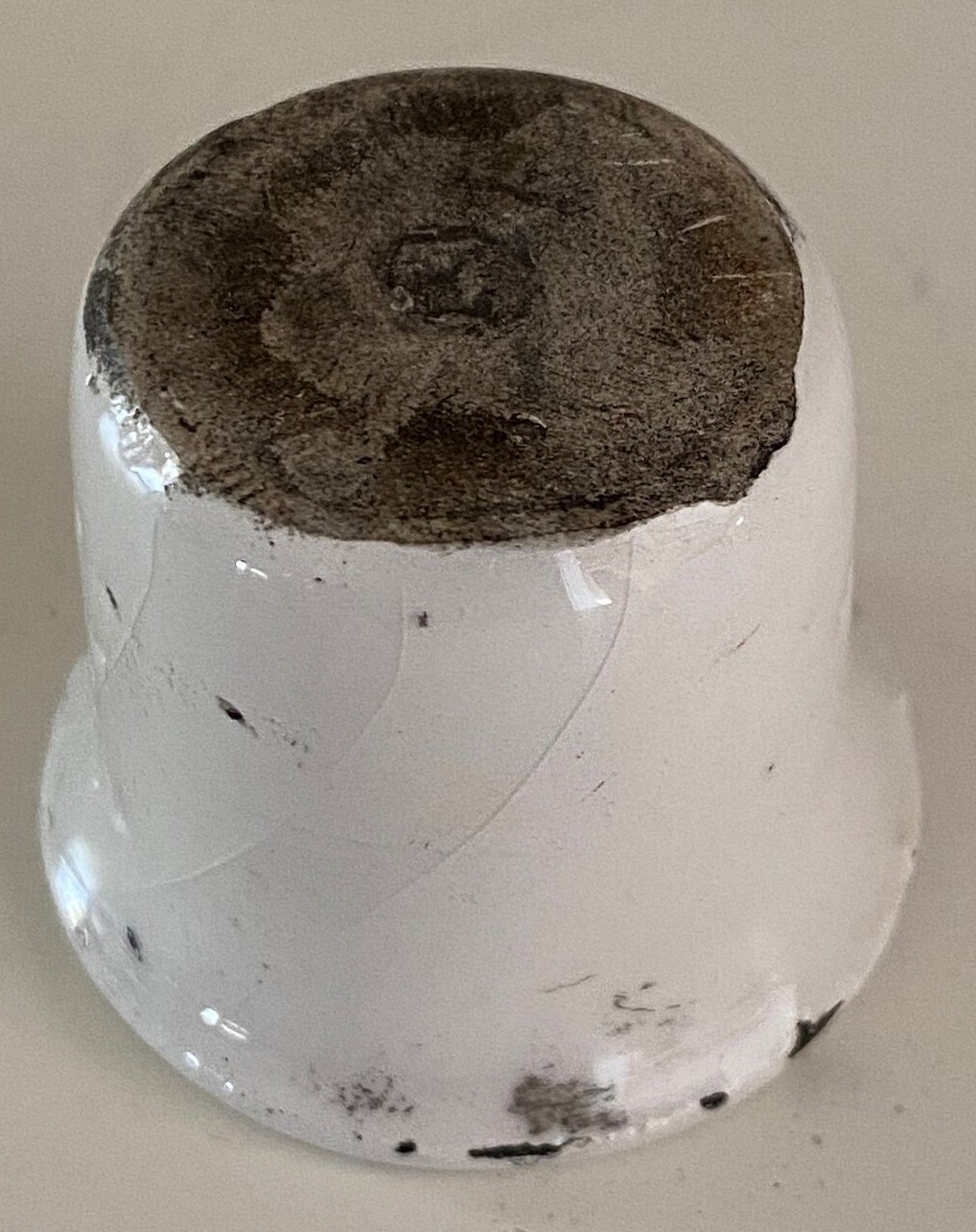 Its ubiquitous presence concerns me. The hinge is clunky. It does have a nonmetal insert that is porcelain coated. I’ve seen one example with a sticker affixed showing “Made in Italy”. The maker’s mark – “MOD. BREVET.” – is large with the letters askew. This is not the style of an antique mark. All of this points to a more modern manufacture.