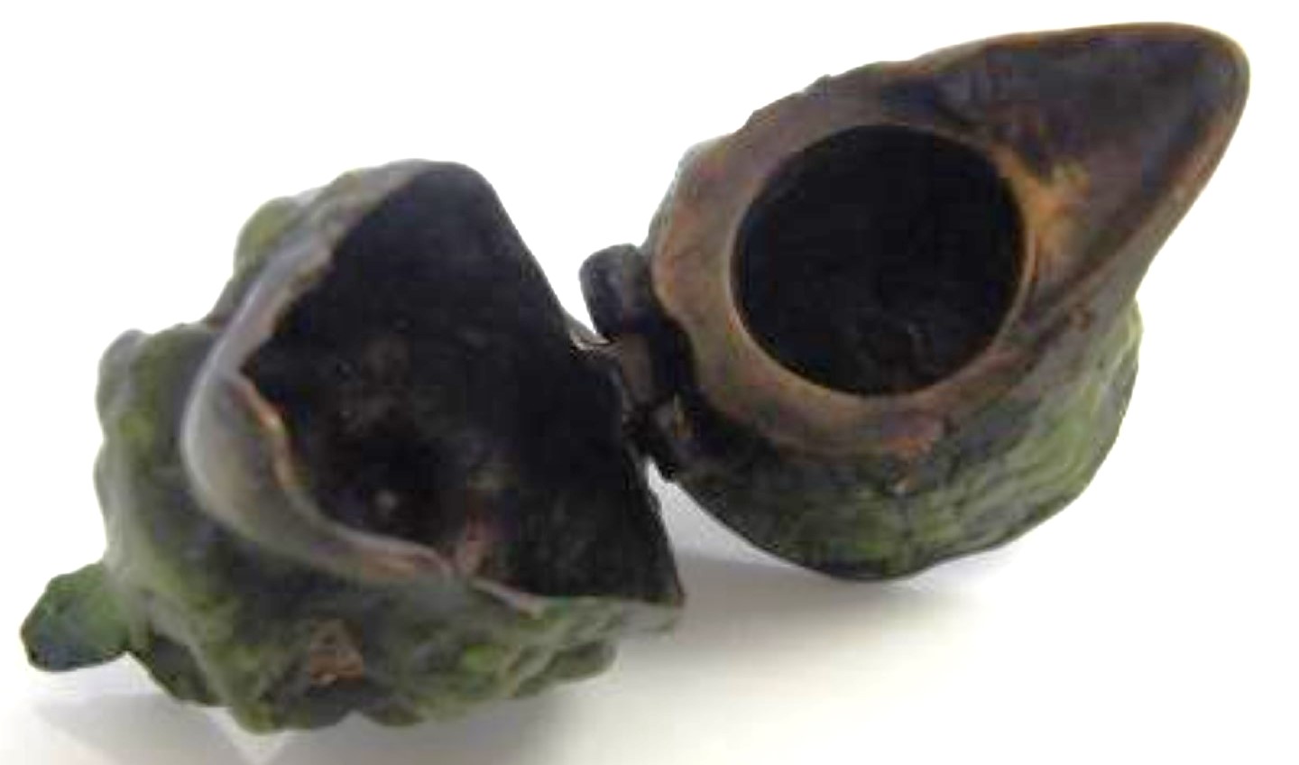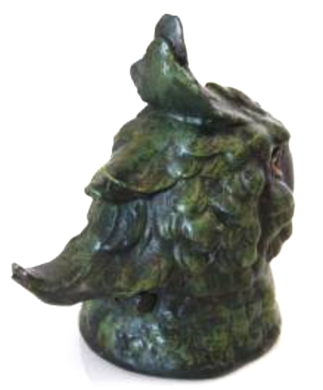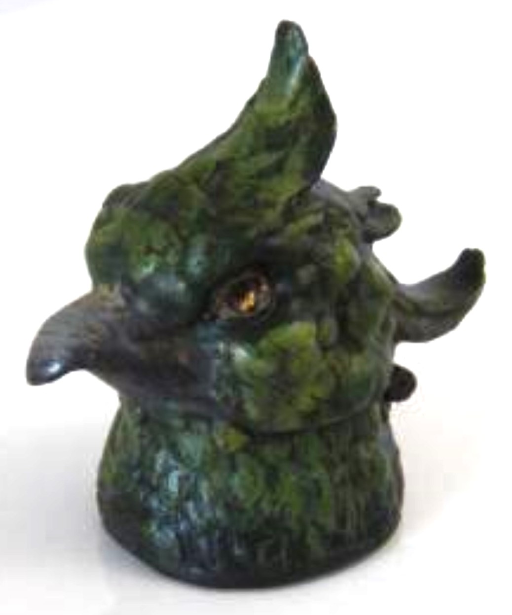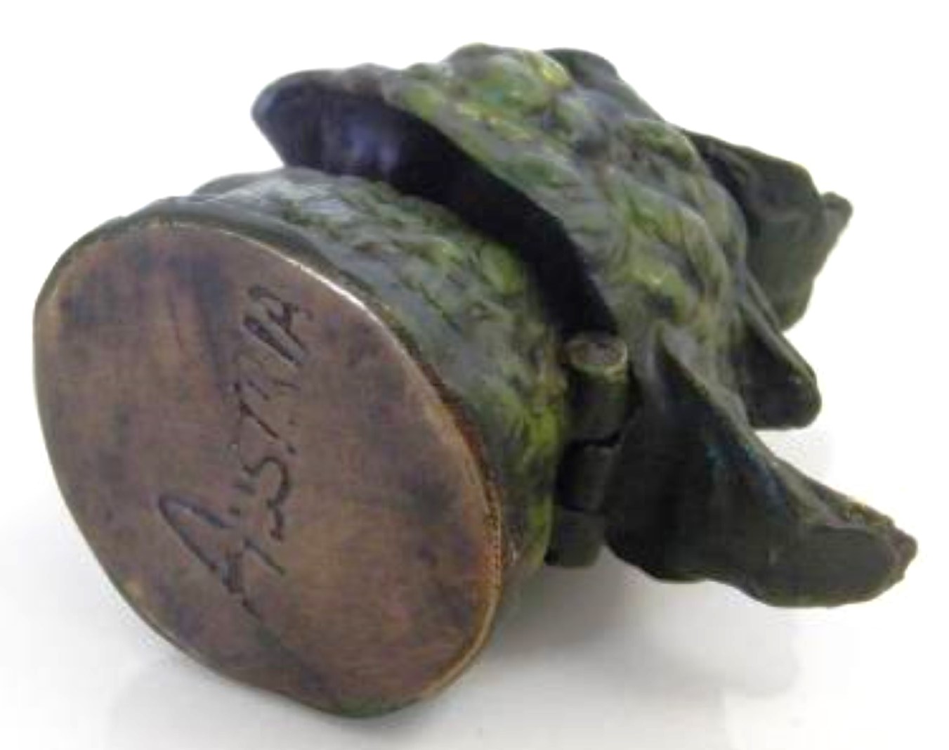 This cold painted bronze parrot head appears to be a newer production. In recent years these parrots have shown up online with some frequency. Most, like this one, do not have an insert. If one has an insert, it’s ill-fitting. The hinge, like many of these modern bronze pieces, is heavy and protruding. The piece is marked “Austria” in large letters. This does not seem authentic. The inkwell is top-heavy. Open the top and the piece falls over.
