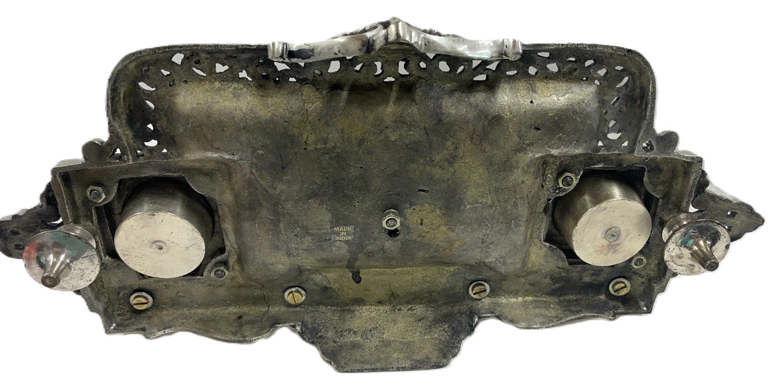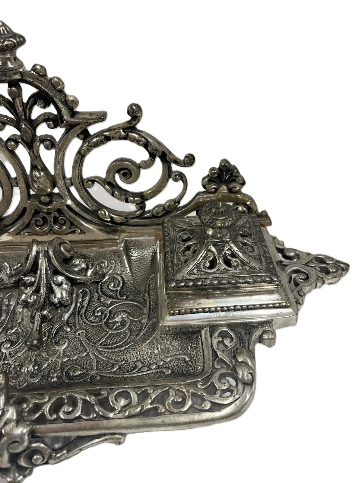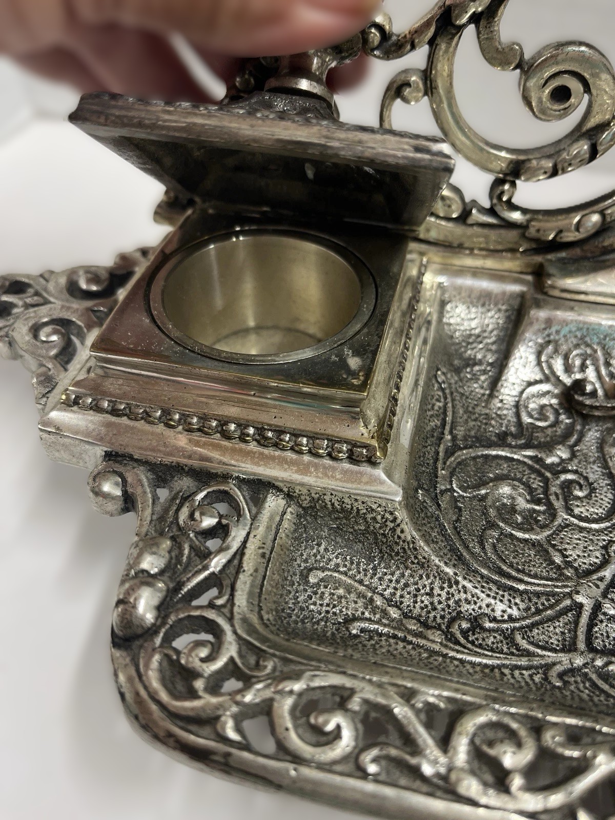 This silver-toned double inkstand is a contemporary decorative piece rather than a functional antique. While it utilizes “Rococo Revival” style elements, its materials and construction techniques are characteristic of modern mass production.