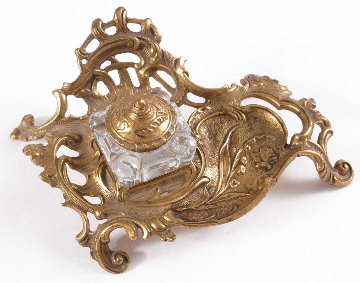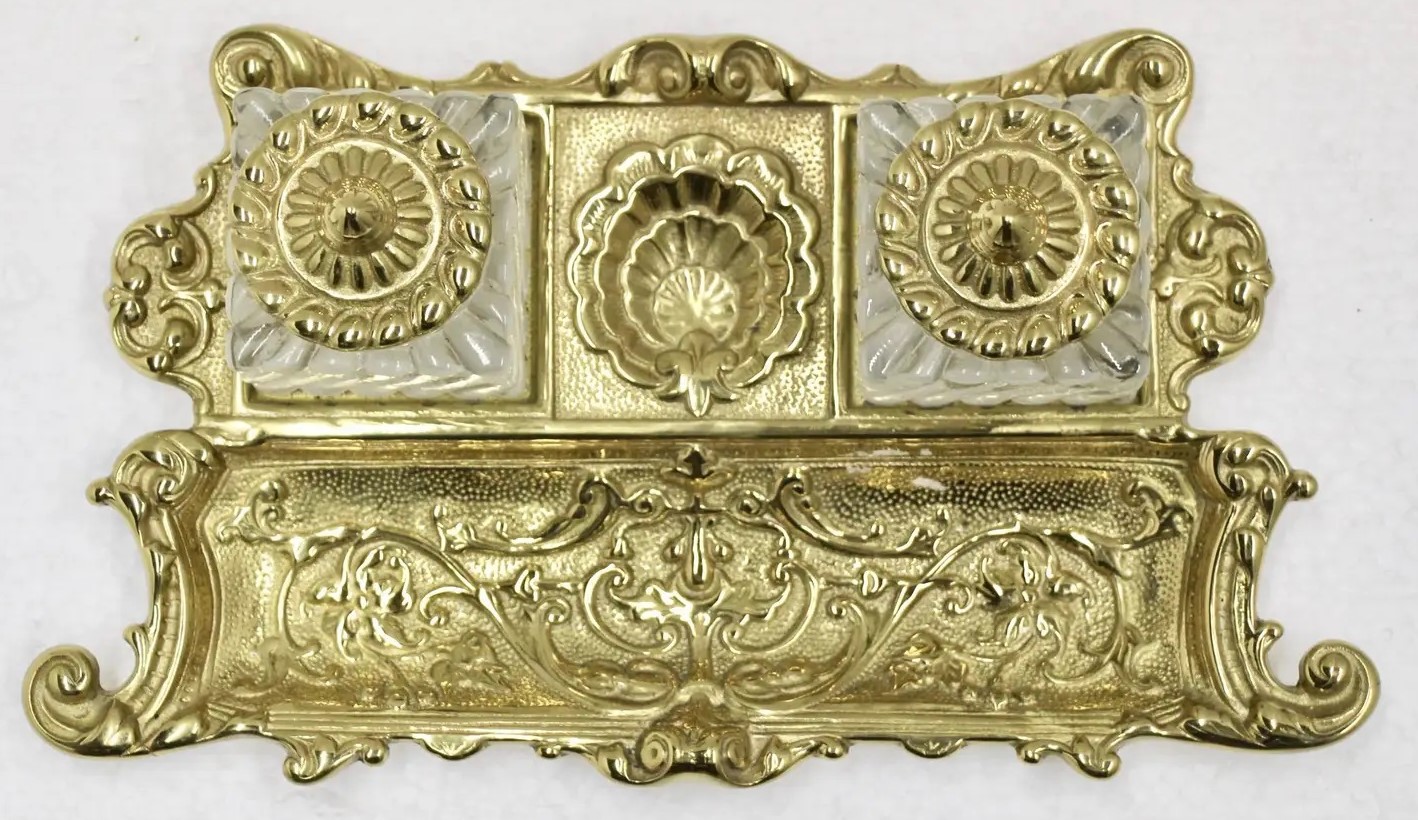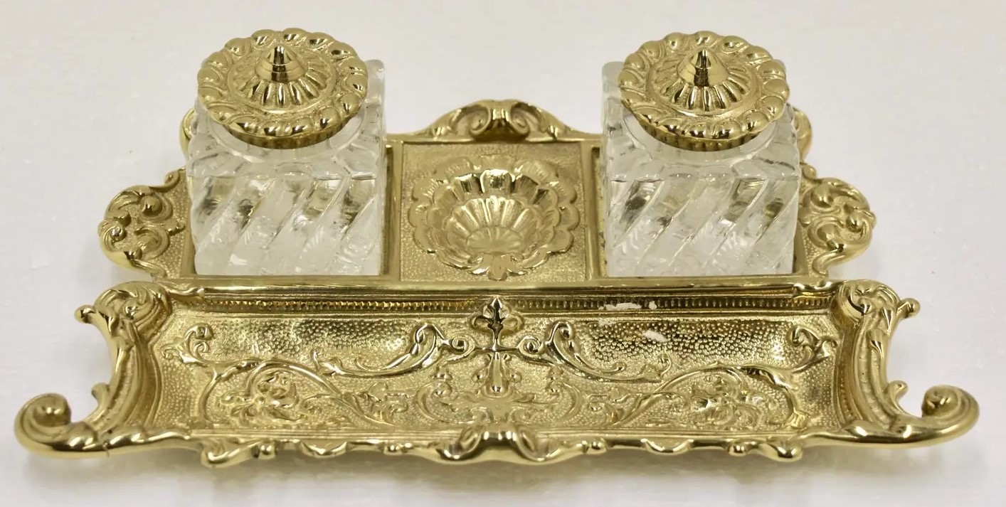 Virginia Metalcrafters made pieces for the Colonial Williamsburg restoration. The company closed in 2005 after being in business over 100 years. Their inkwells and inkstands are marked “VM”, and have been on the market since the 1960’s. They are often found on eBay and other sales / auction sites.