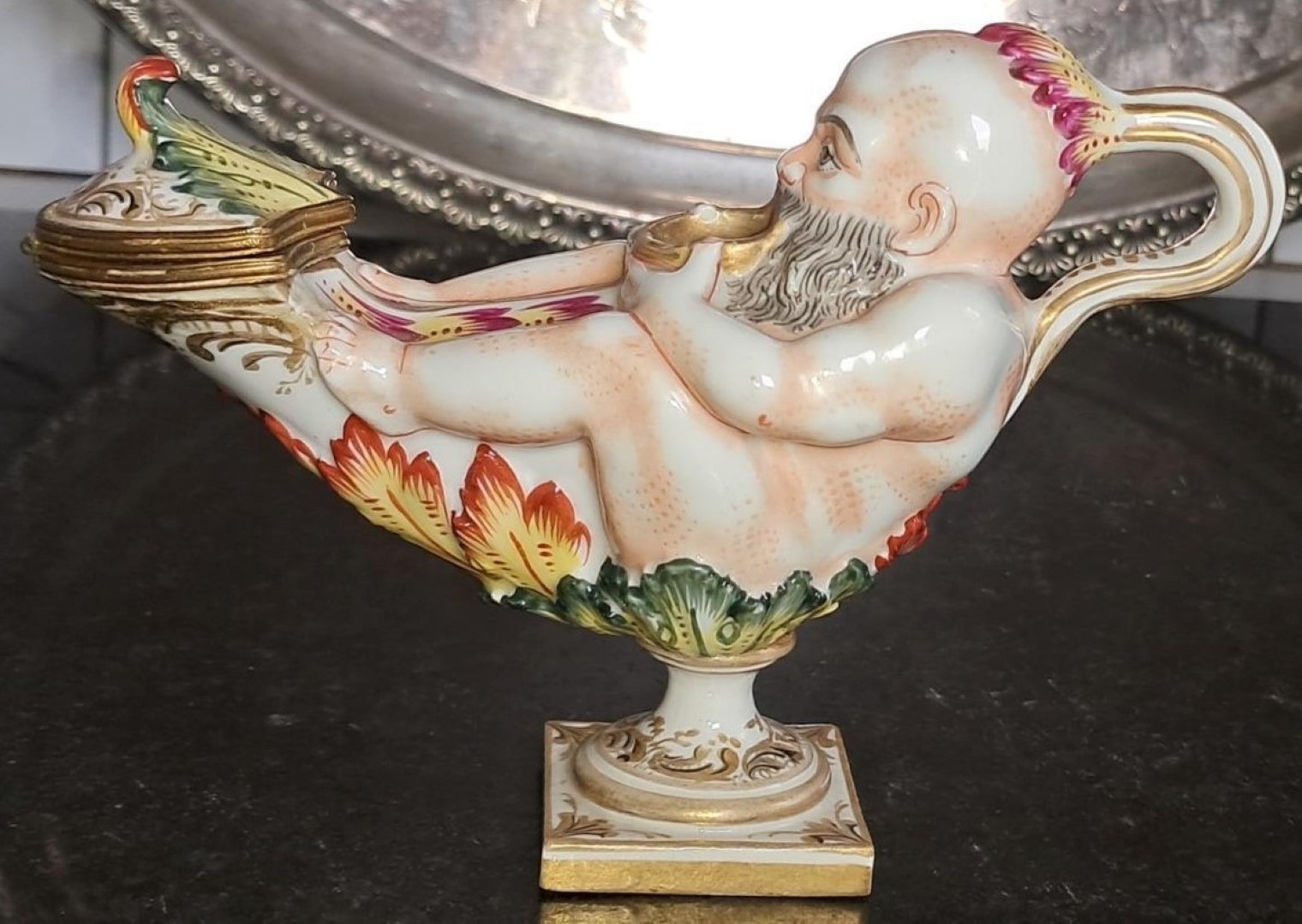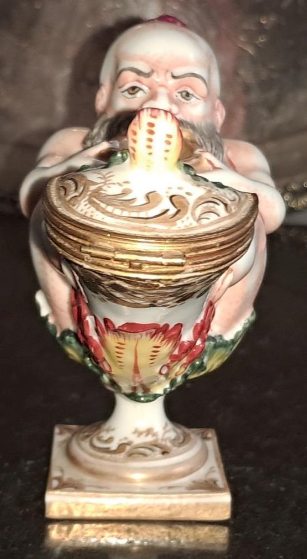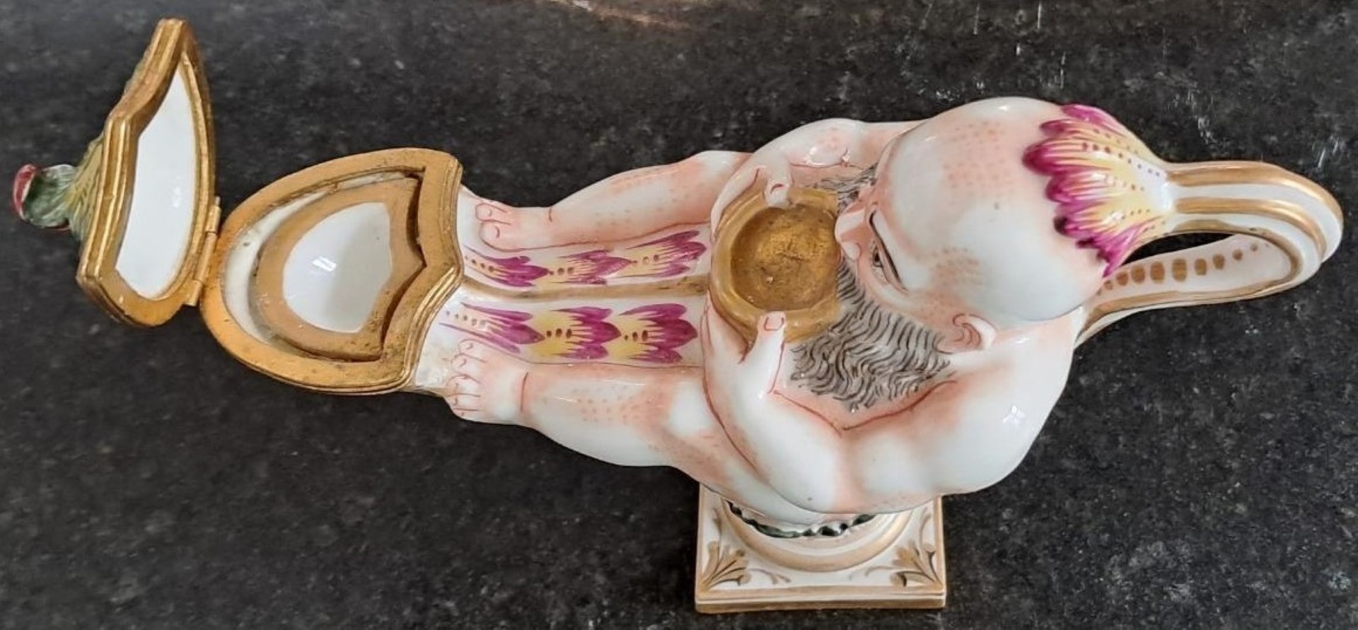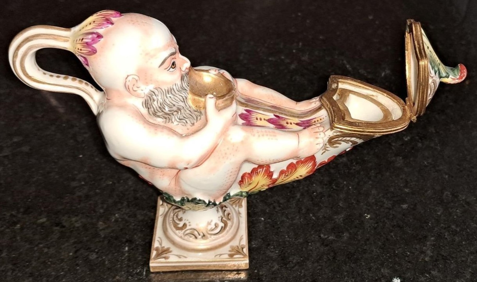 A 19th century Italian Capodimonte porcelain inkwell modelled as a genie and lamp. Applied gilding and hand painted in polychrome enamels with loop handle and square base. The end of the lamp hinges open to reveal a removable porcelain insert. This Capodimonte piece is marked on the base with a crown over Neopolitan N and dates this to the 19th century.