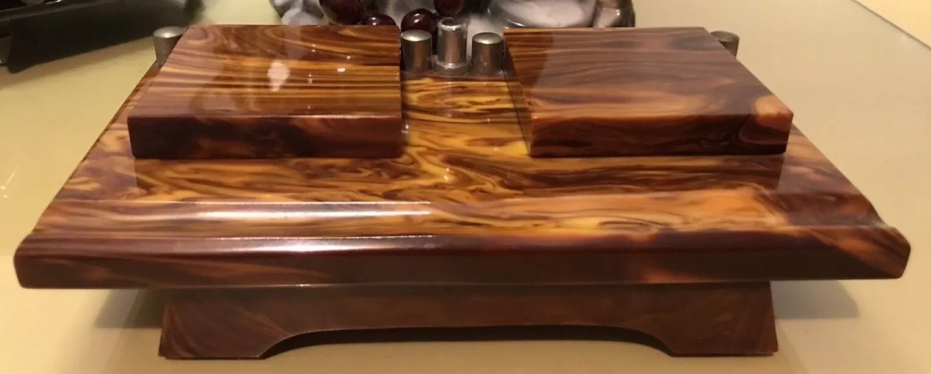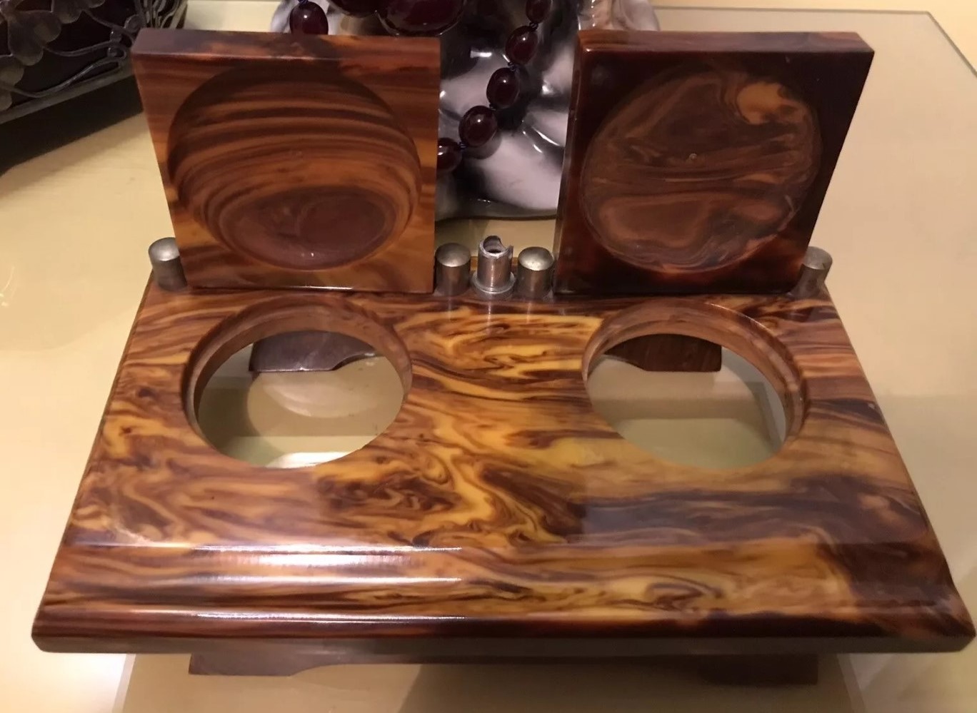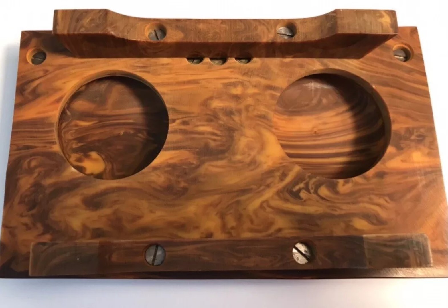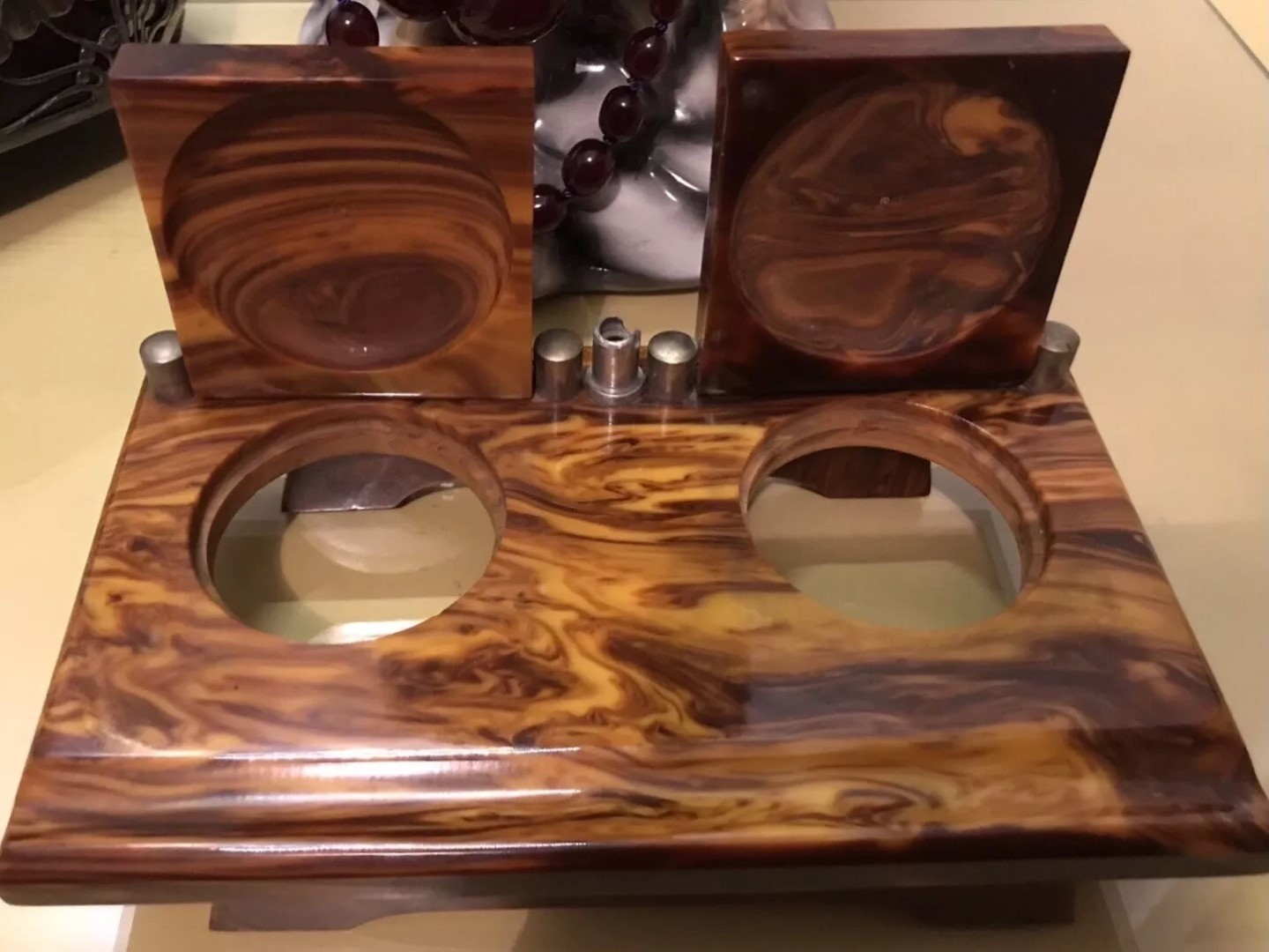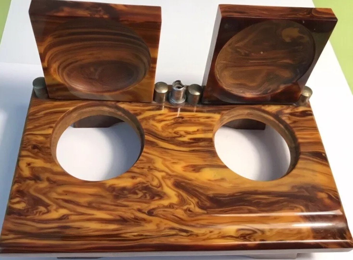 Marbled caramel amber Bakelite double inkstand with pen channel.