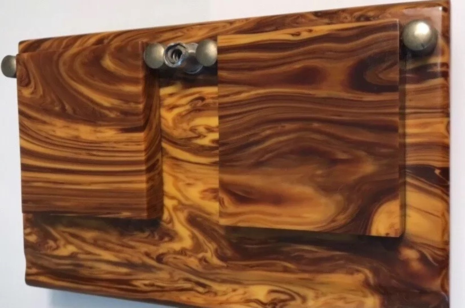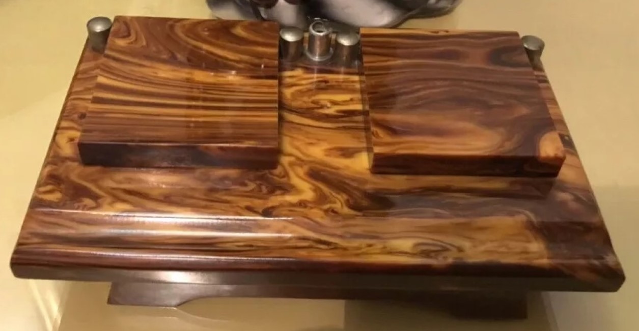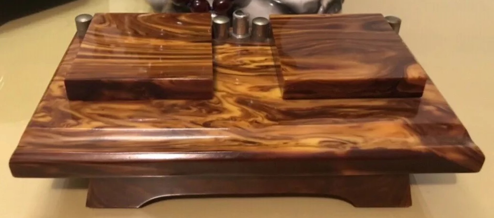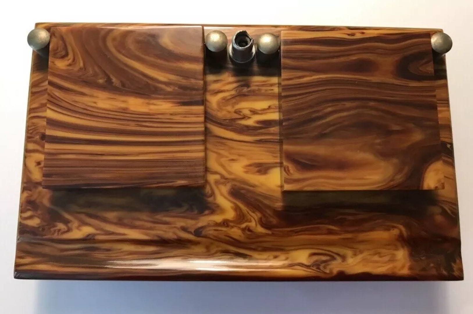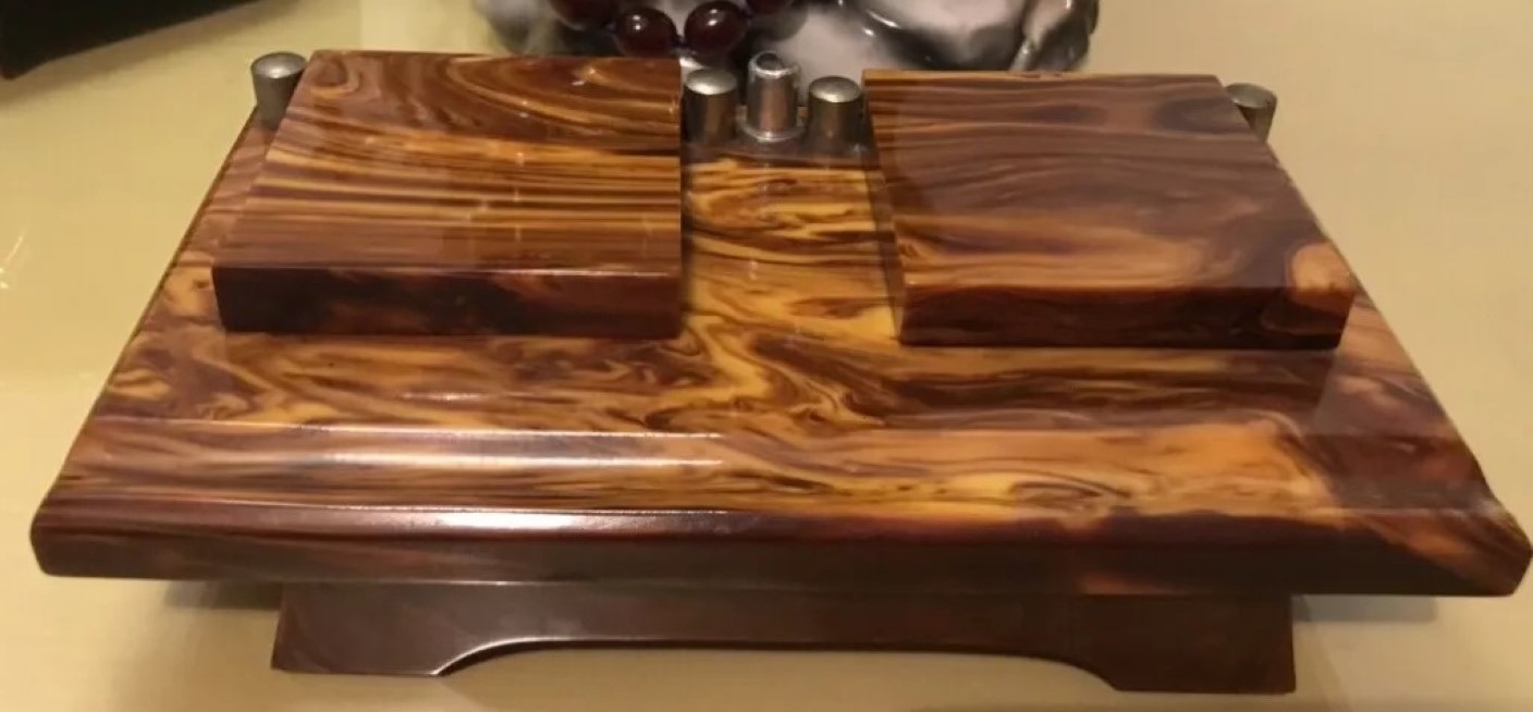 Marbled caramel amber Bakelite double inkstand with pen channel.