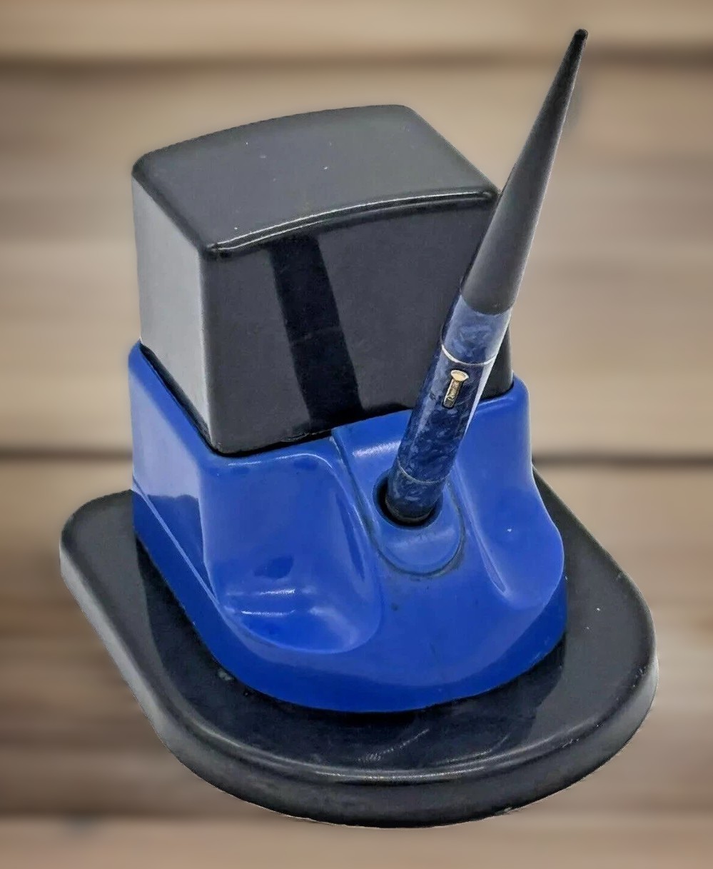 - The Connection: While they were made by different companies, they were likely paired by the original owner in the 1930s because the Lapis Blue celluloid of the pen matches the Cobalt Blue of the stand so perfectly. This kind of “color coordination” was very fashionable in Art Deco office styling.