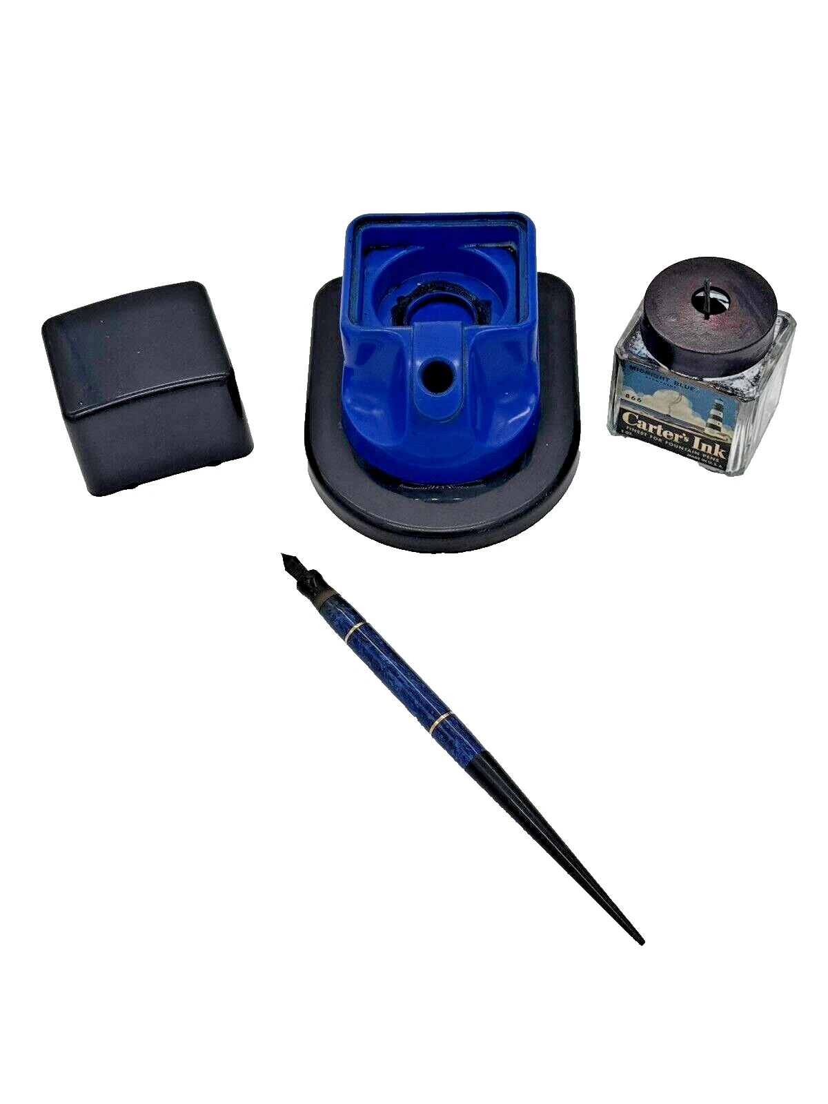 - The “Cube”: One photo shows the square glass Carter’s Midnight Blue ink bottle which fits in the inkstand.