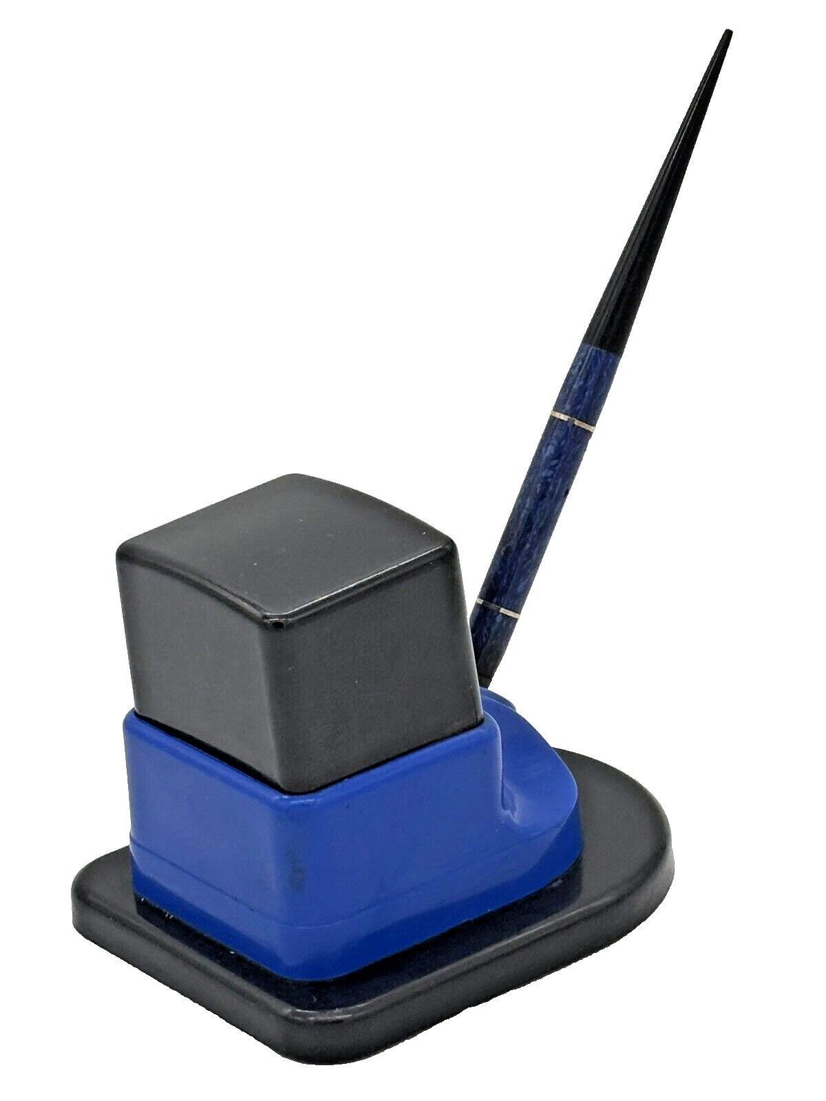 - Function: The stand disguises the utility bottle. The blue base holds the bottle, and the black square cap covers it. The “snout” on the front is a socket designed to hold a desk pen at the perfect angle, keeping the nib airtight so the ink doesn’t dry out.