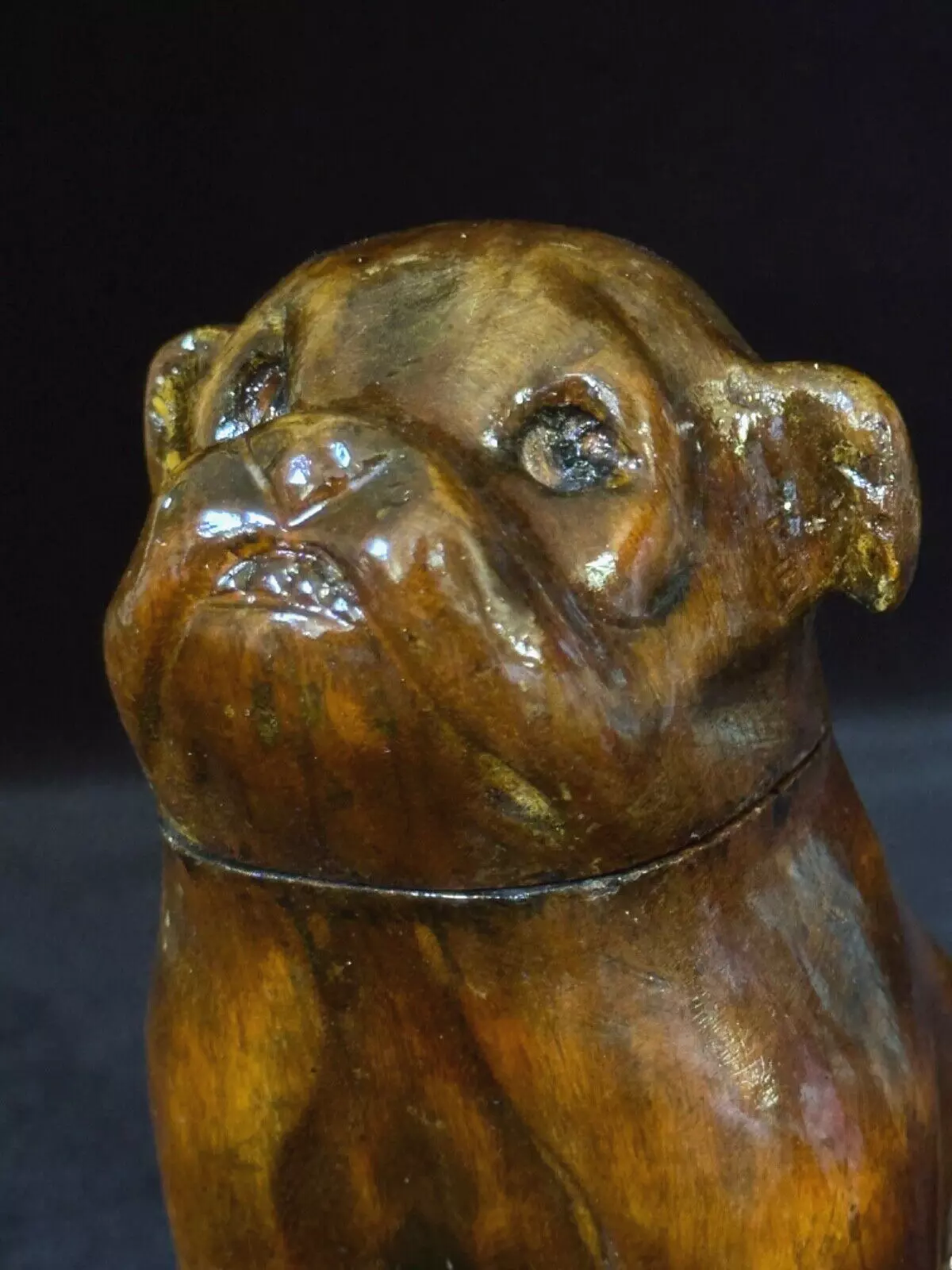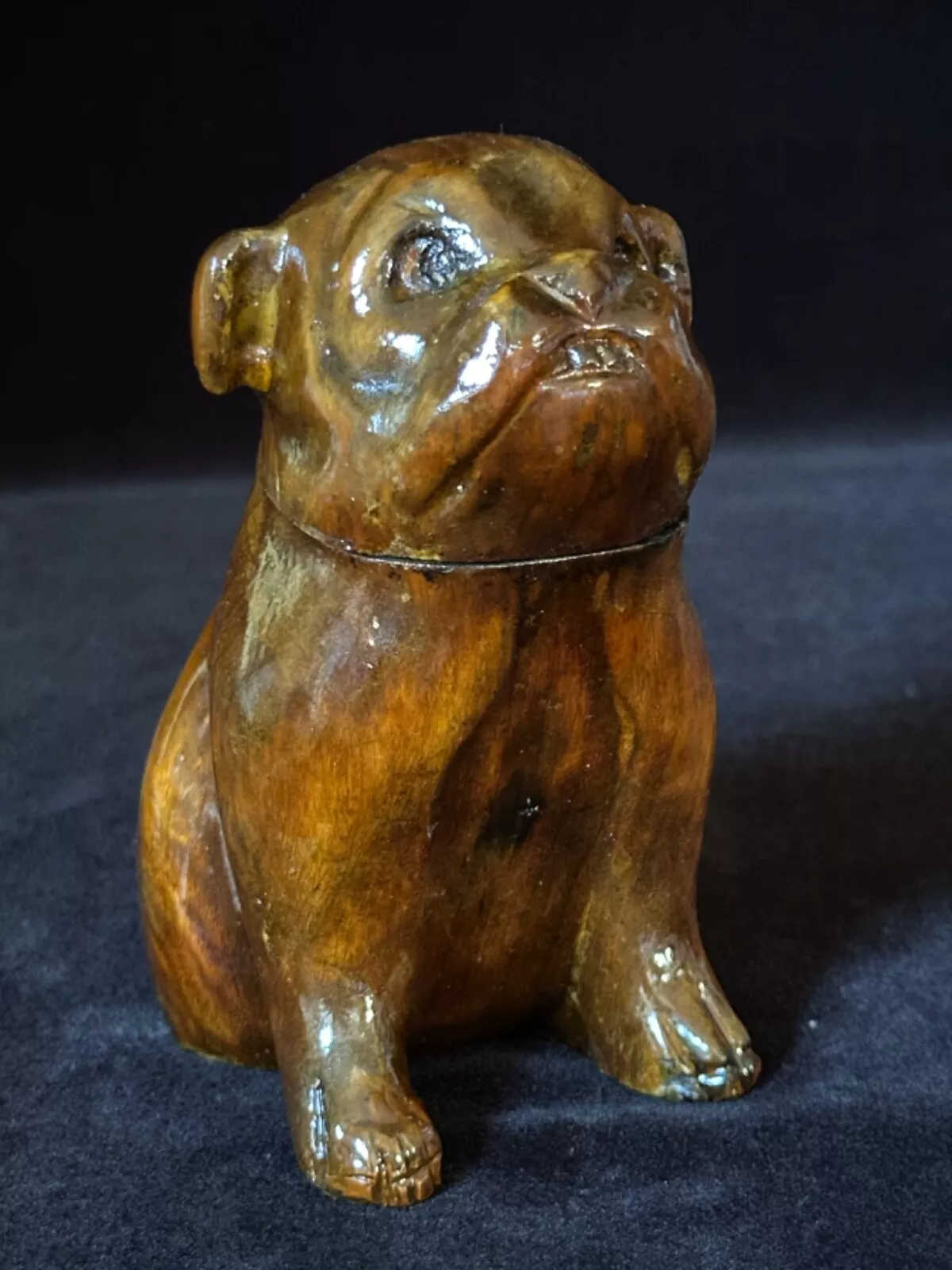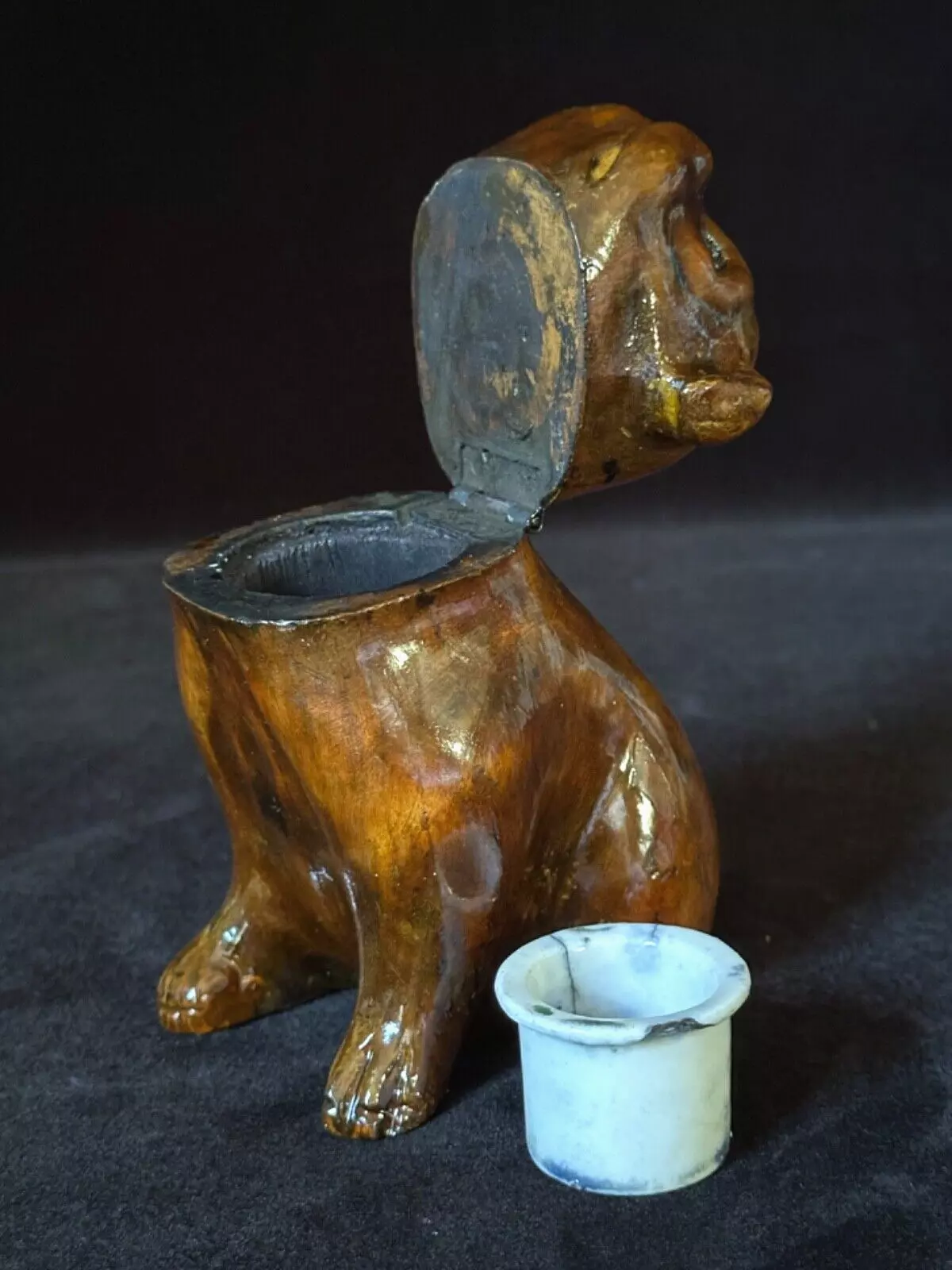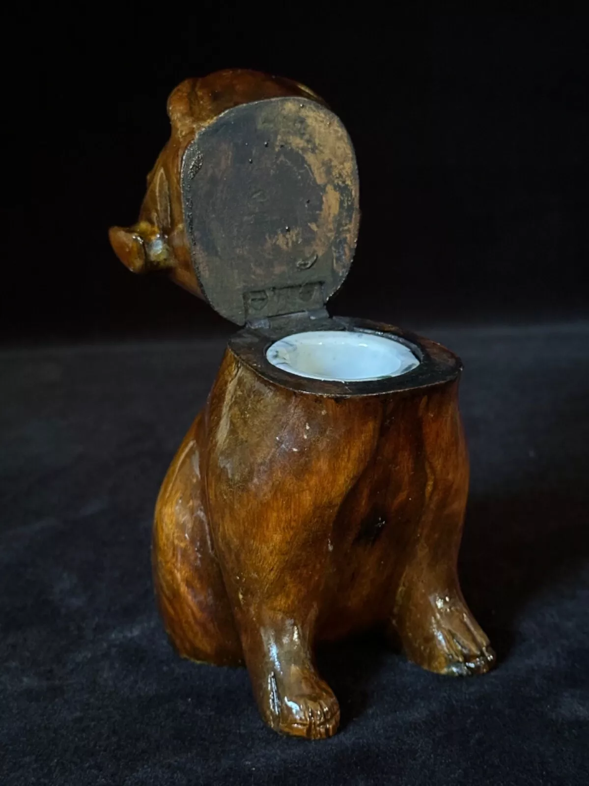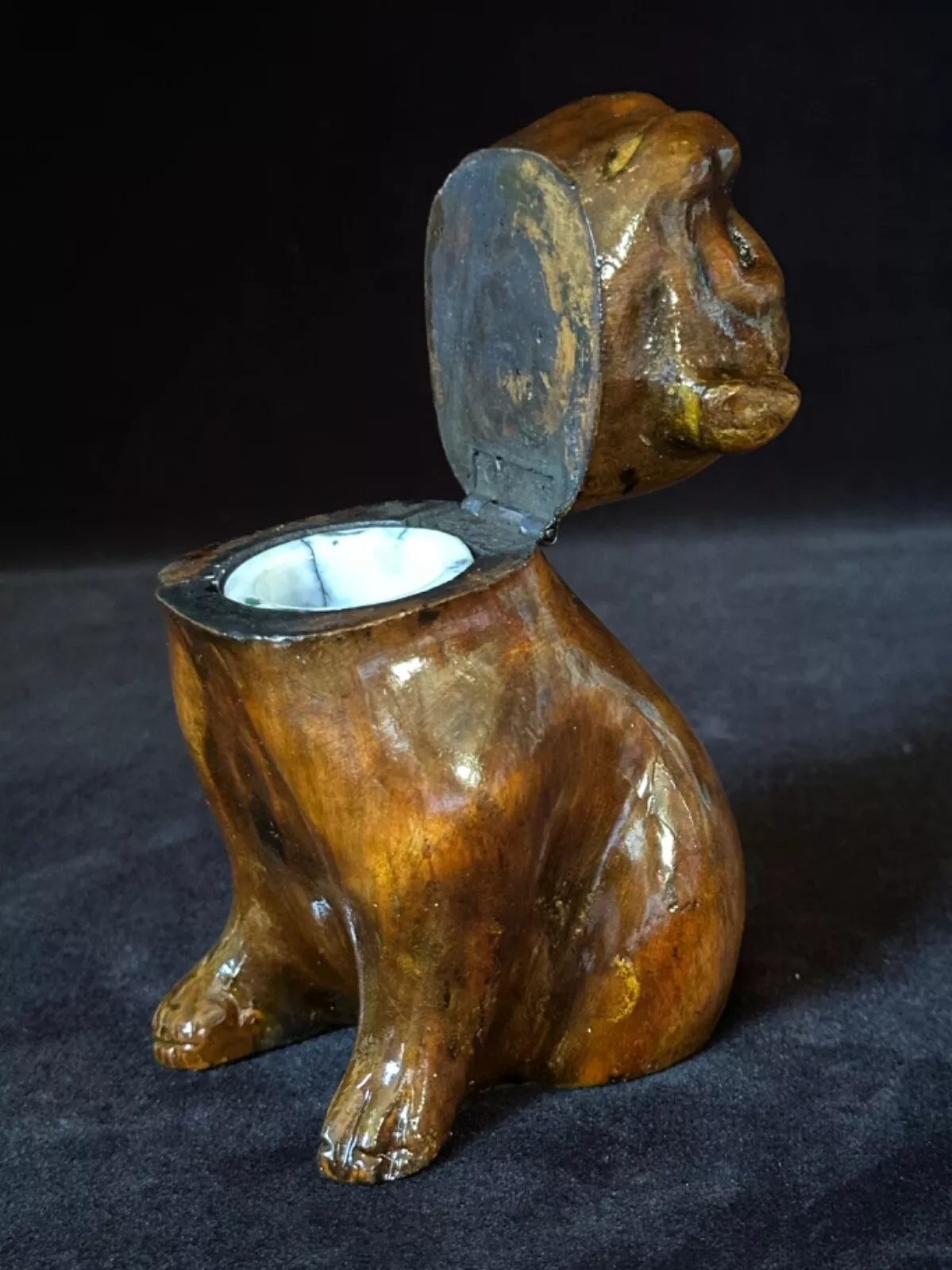 This inkwell is carved in the form of a seated dog. The head is hinged and opens to reveal a porcelain insert. The wood is carved and finished to resemble the texture of a dog’s coat and facial features. This dog most closely resembles a bulldog. It has a stocky build, broad head, short snout, and folded ears.