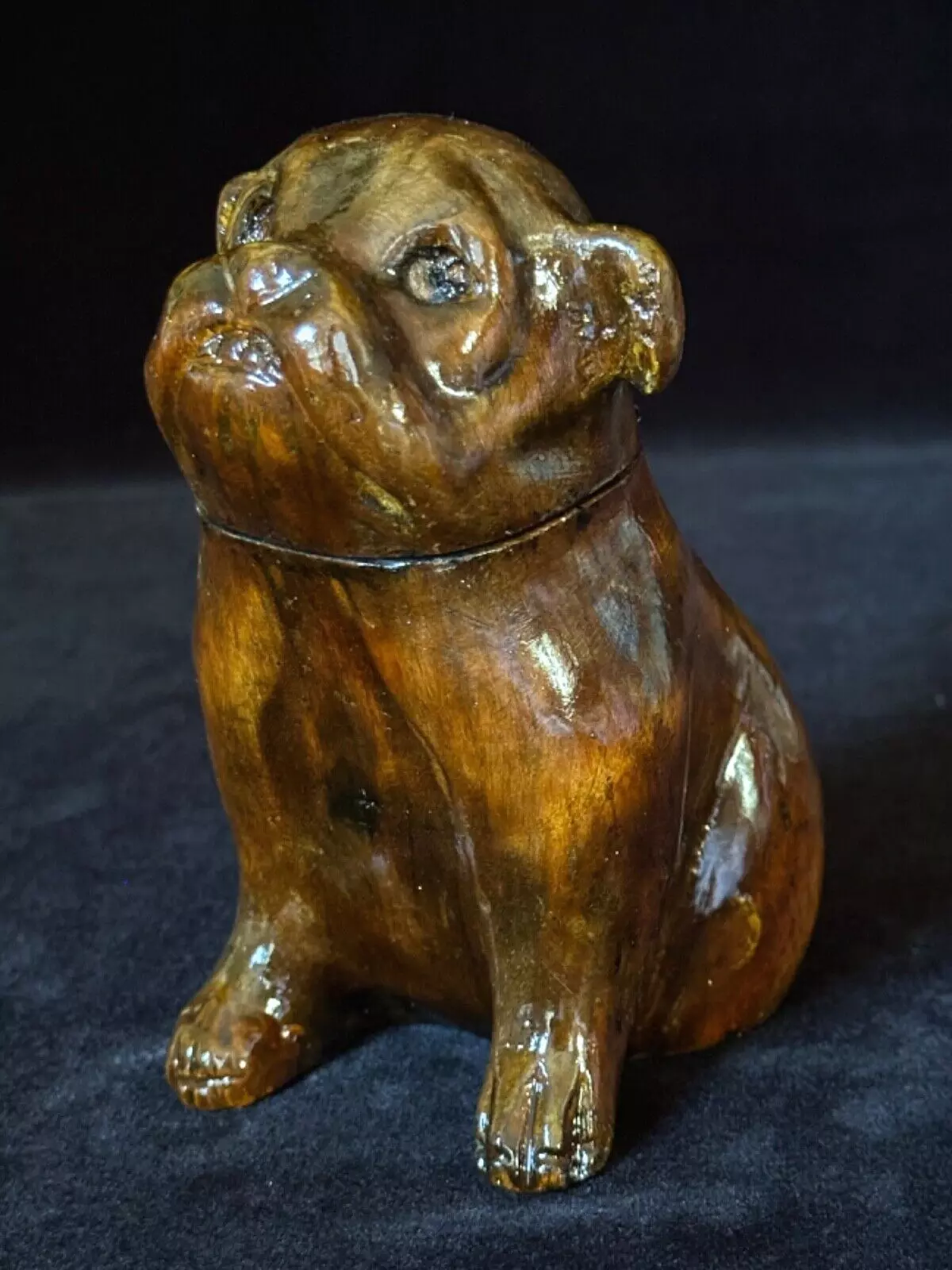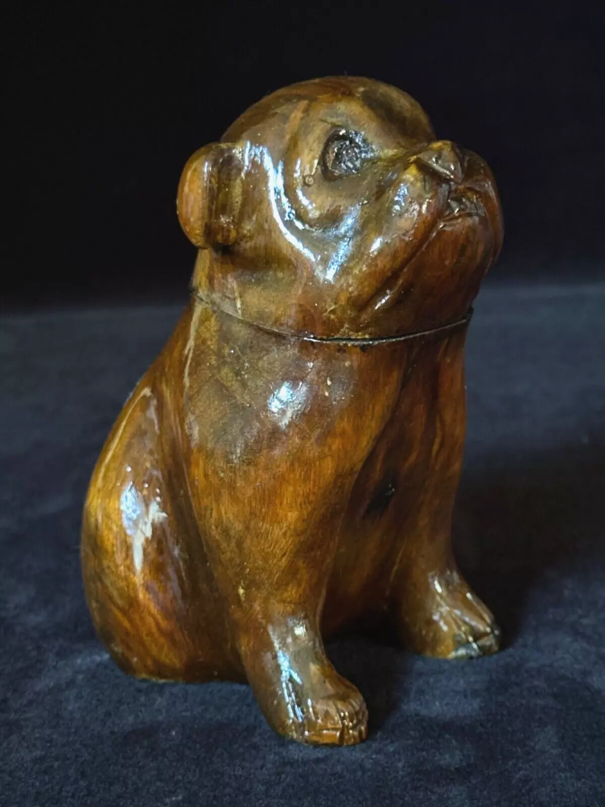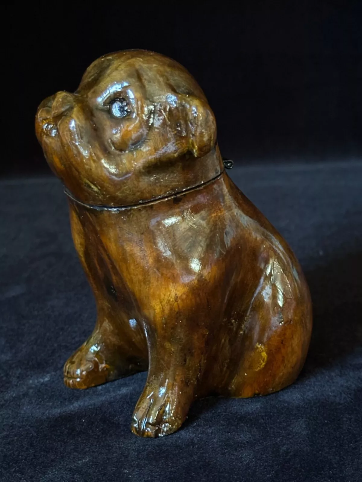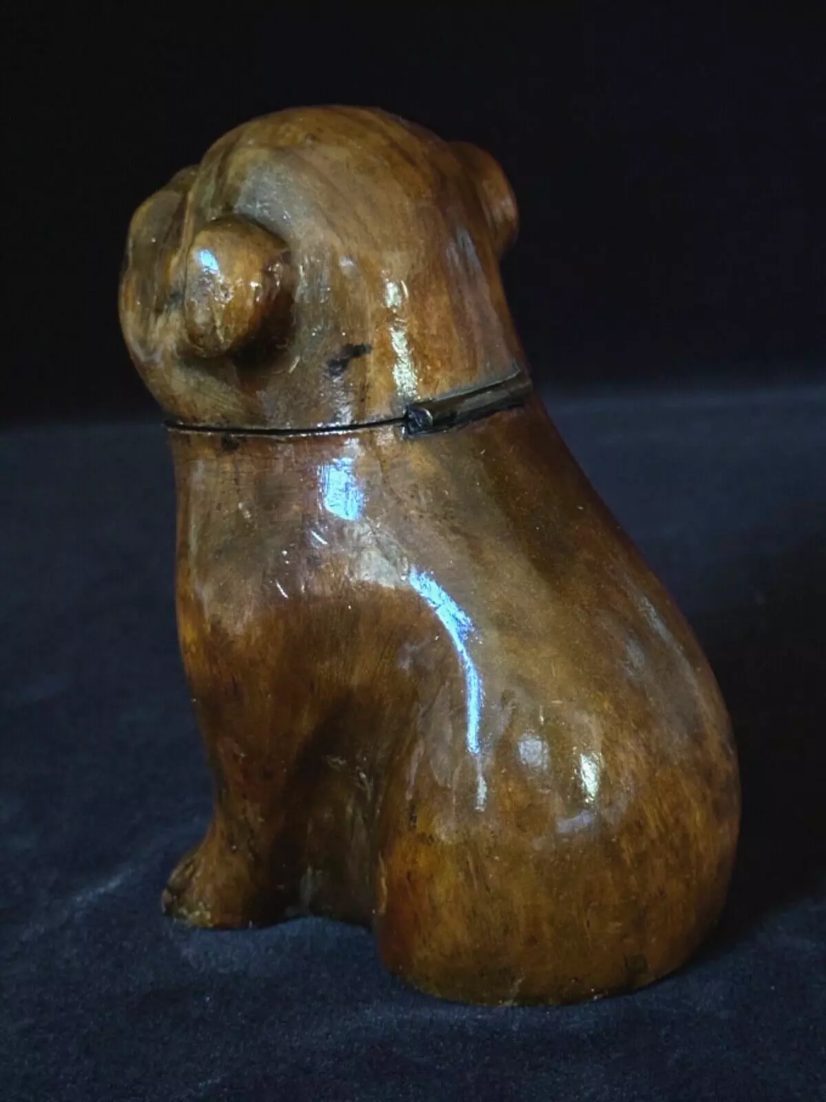 This inkwell is carved in the form of a seated dog. The head is hinged and opens to reveal a porcelain insert. The wood is carved and finished to resemble the texture of a dog’s coat and facial features. This dog most closely resembles a bulldog. It has a stocky build, broad head, short snout, and folded ears.