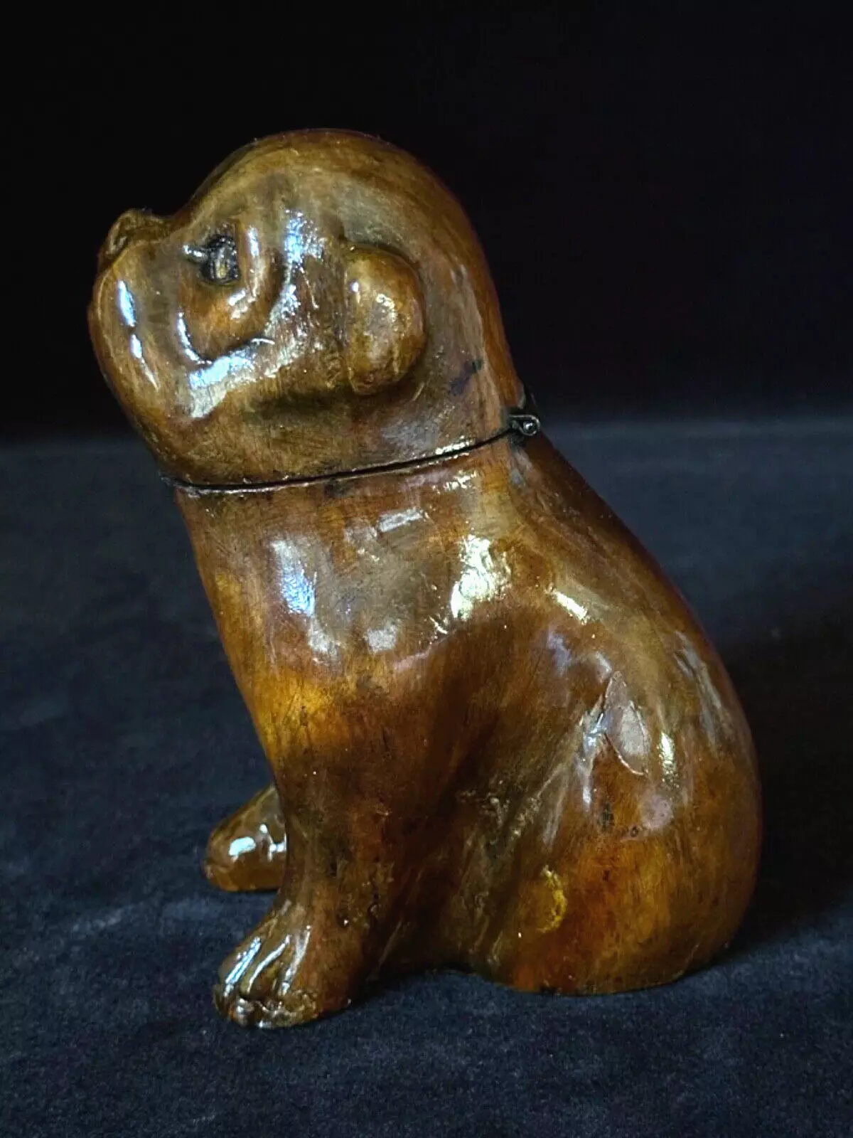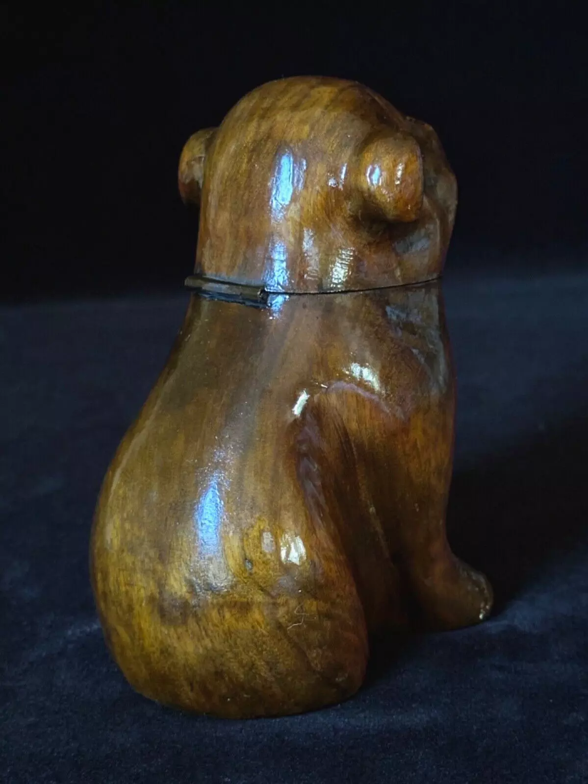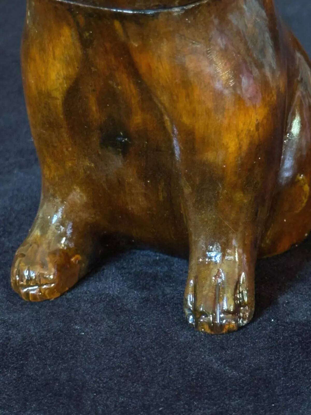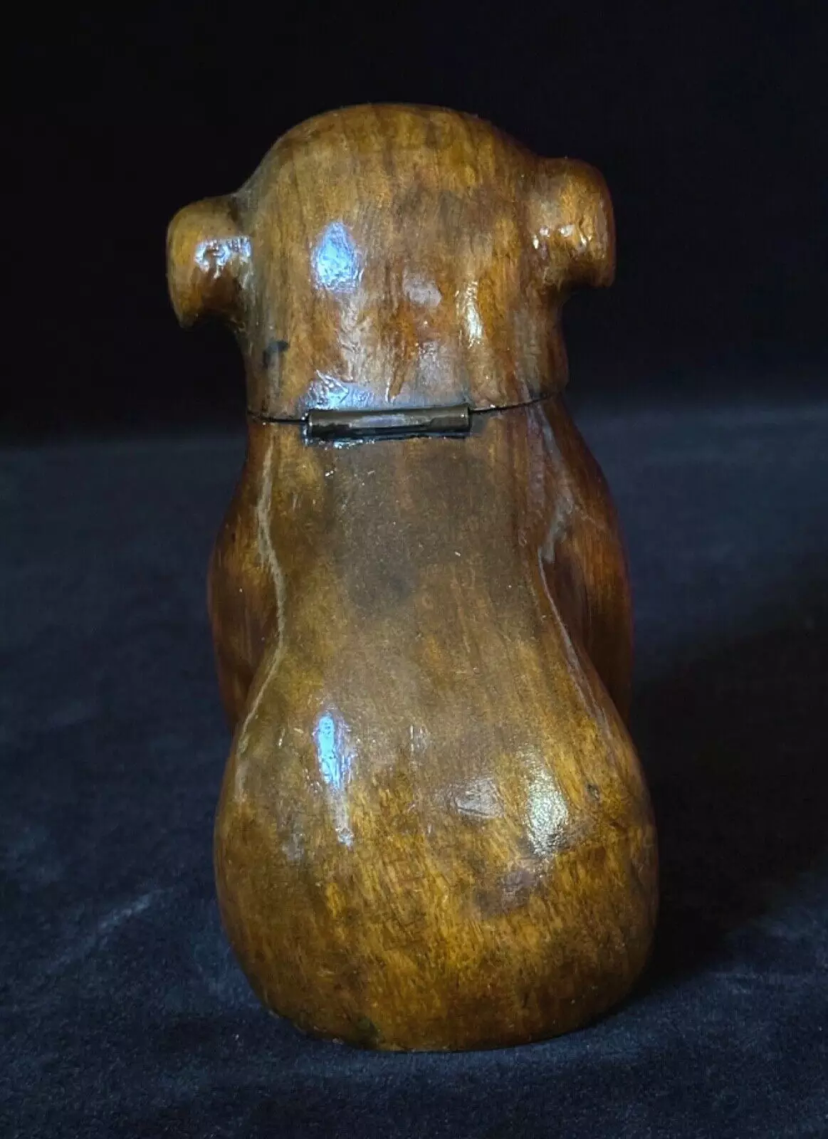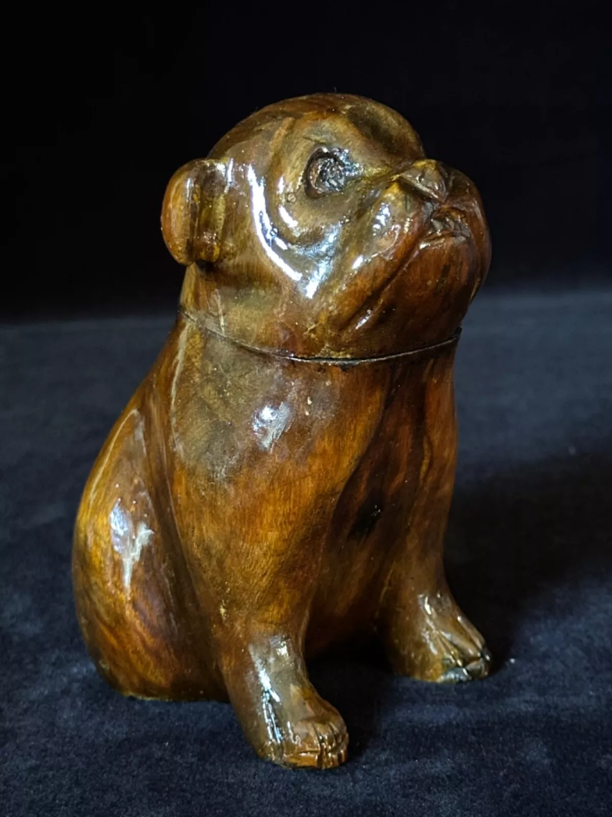 This inkwell is carved in the form of a seated dog. The head is hinged and opens to reveal a porcelain insert. The wood is carved and finished to resemble the texture of a dog’s coat and facial features. This dog most closely resembles a bulldog. It has a stocky build, broad head, short snout, and folded ears.