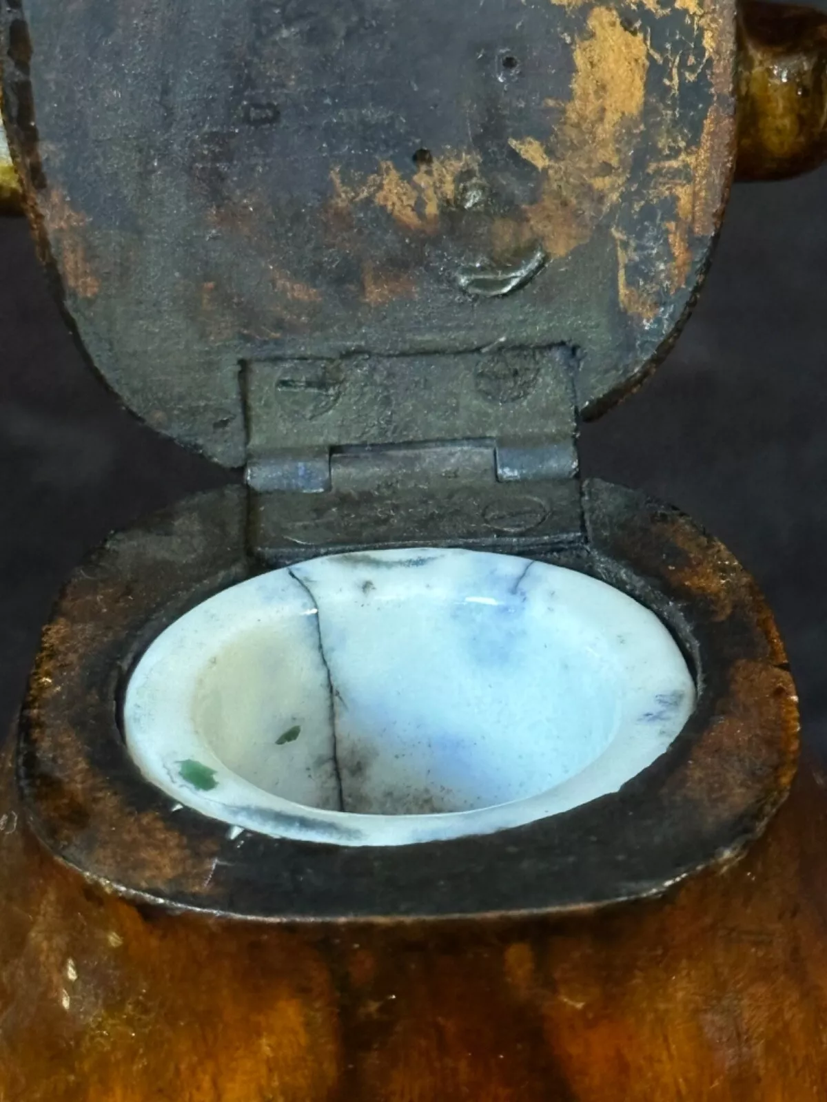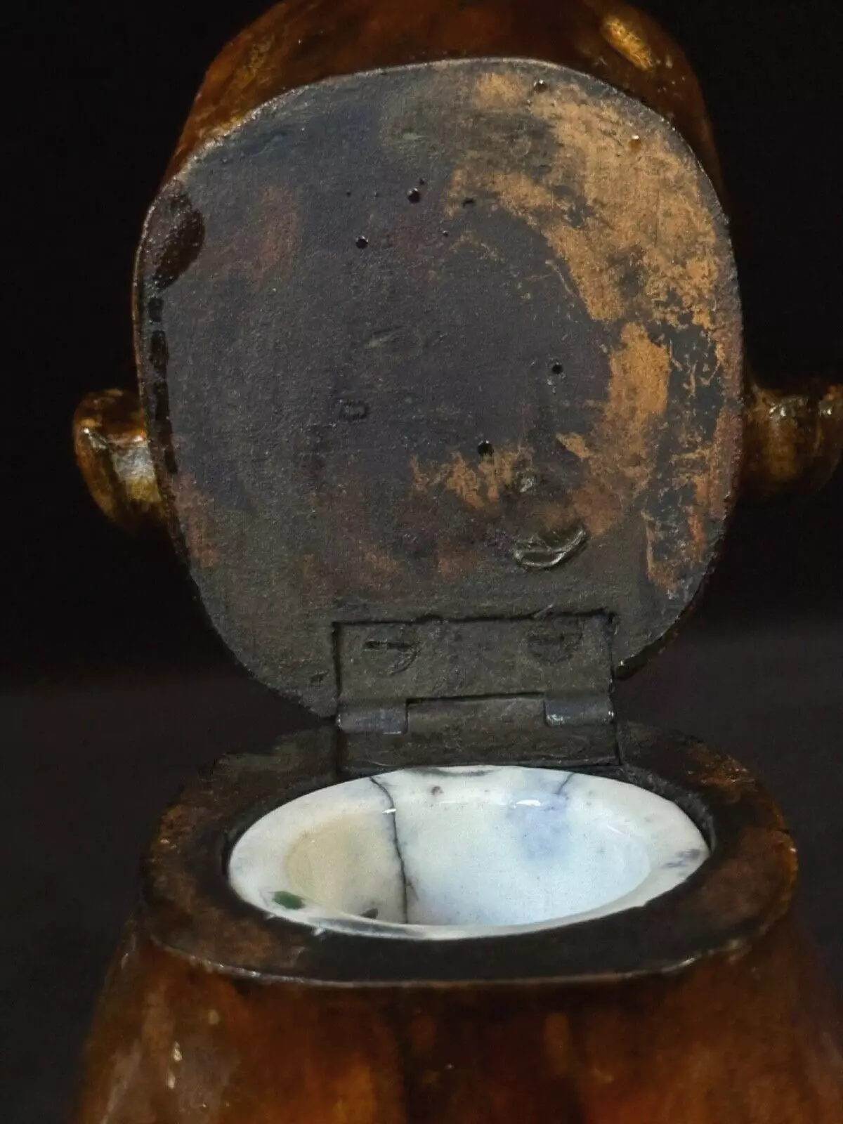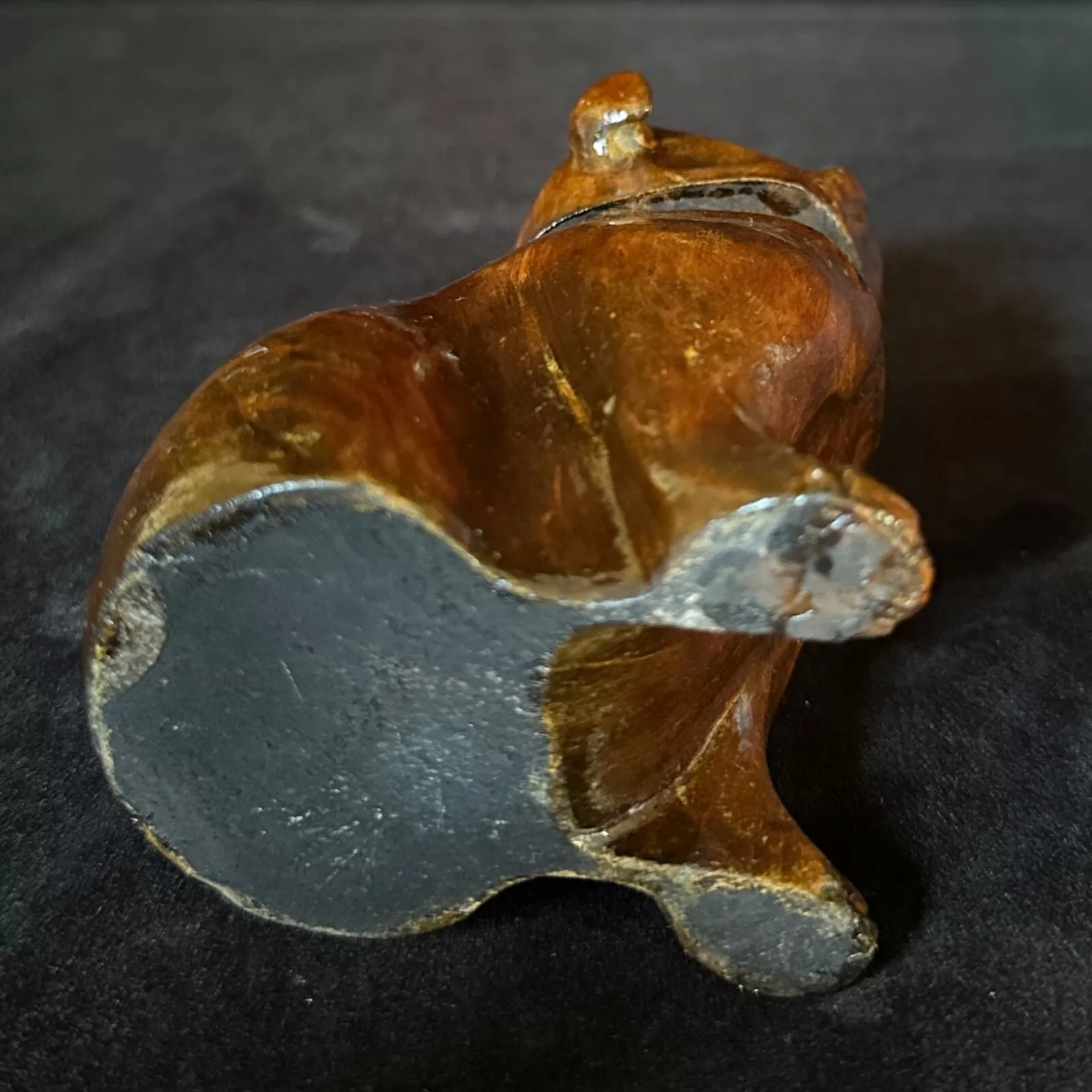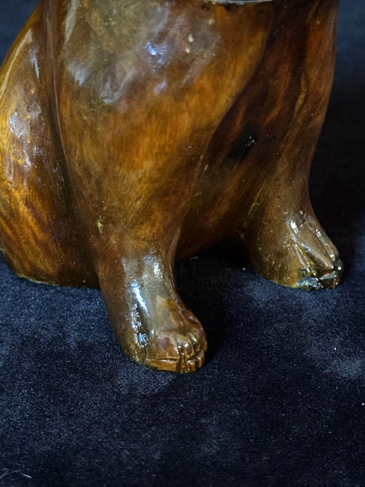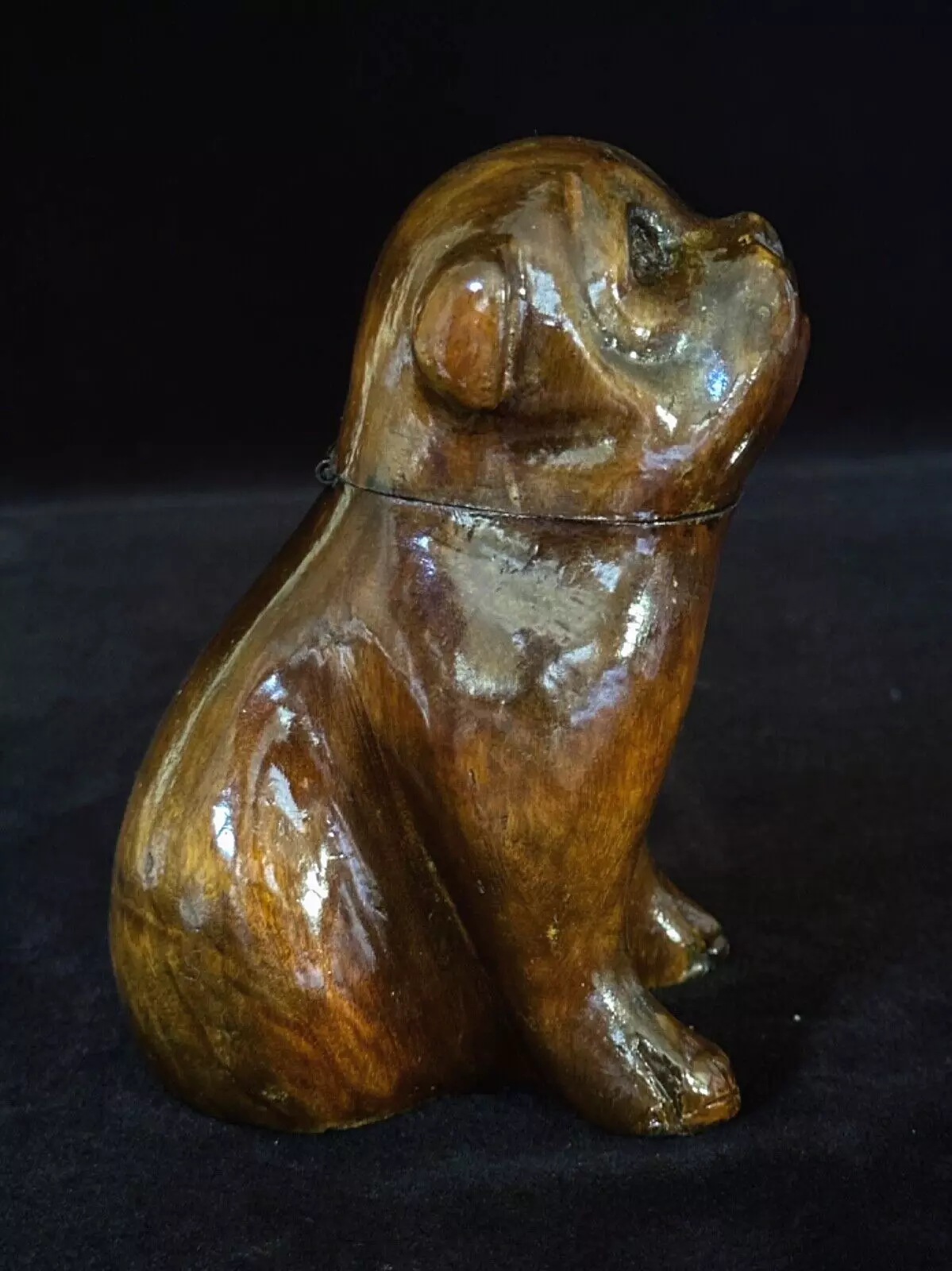 This inkwell is carved in the form of a seated dog. The head is hinged and opens to reveal a porcelain insert. The wood is carved and finished to resemble the texture of a dog’s coat and facial features. This dog most closely resembles a bulldog. It has a stocky build, broad head, short snout, and folded ears.