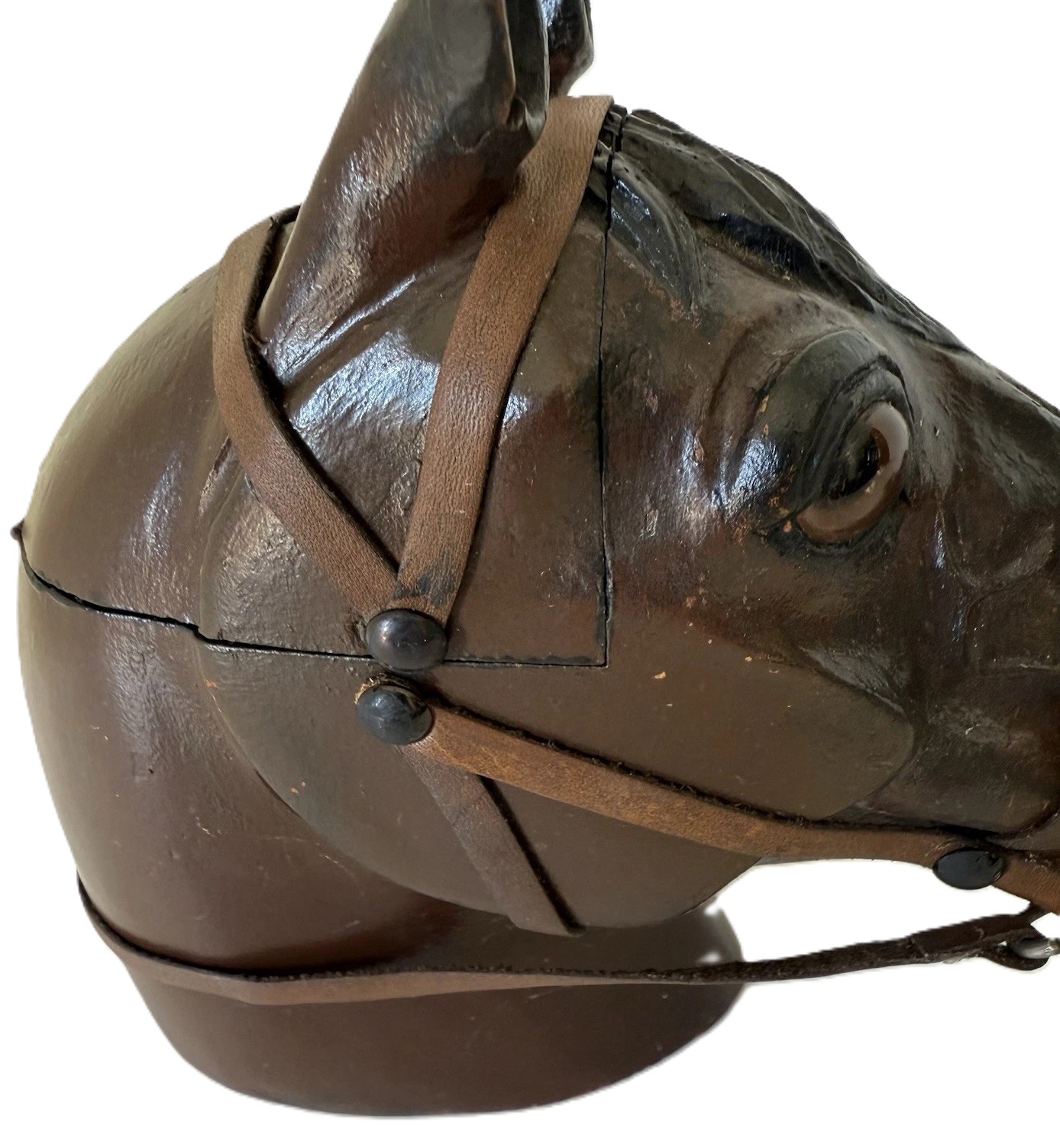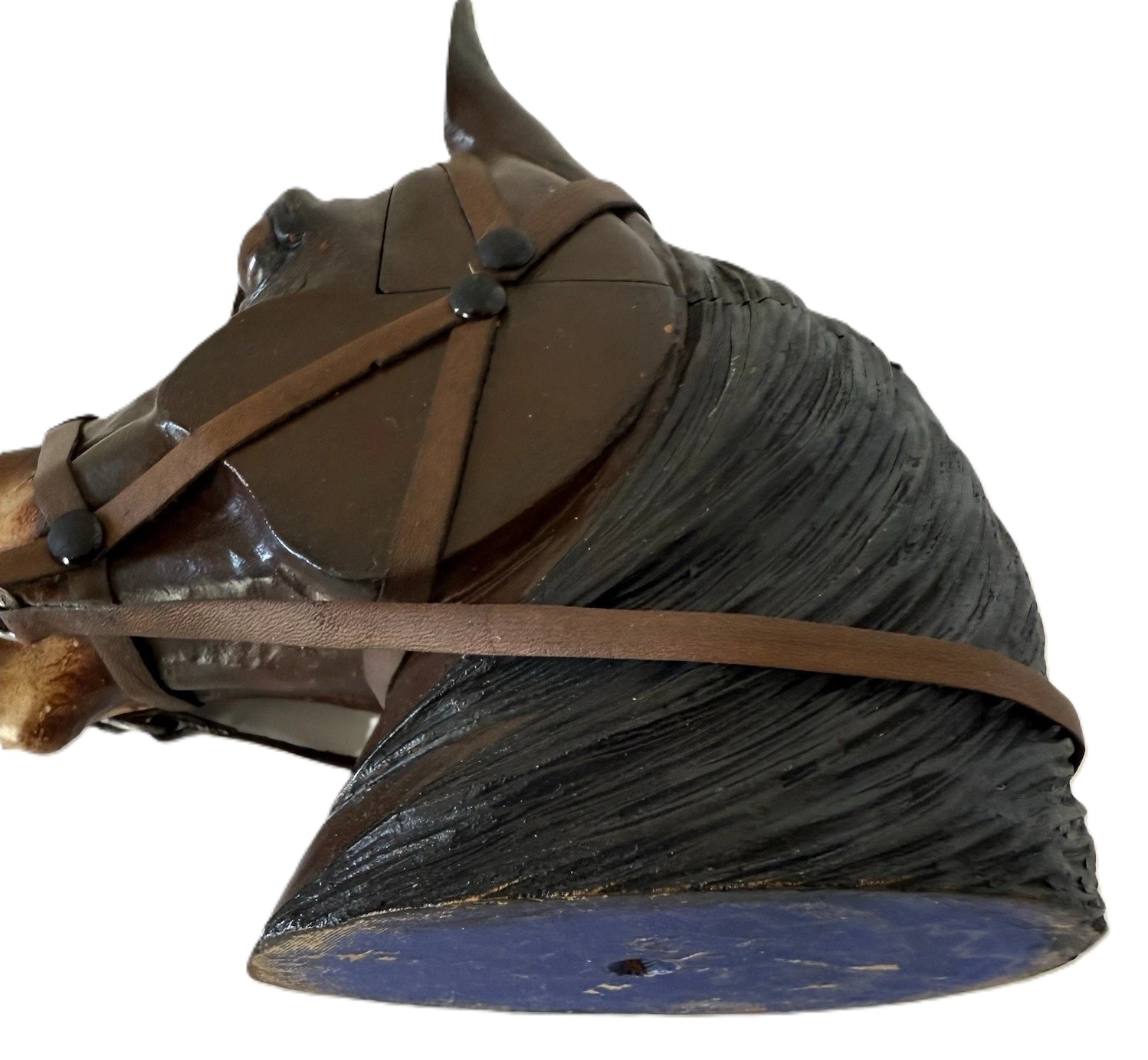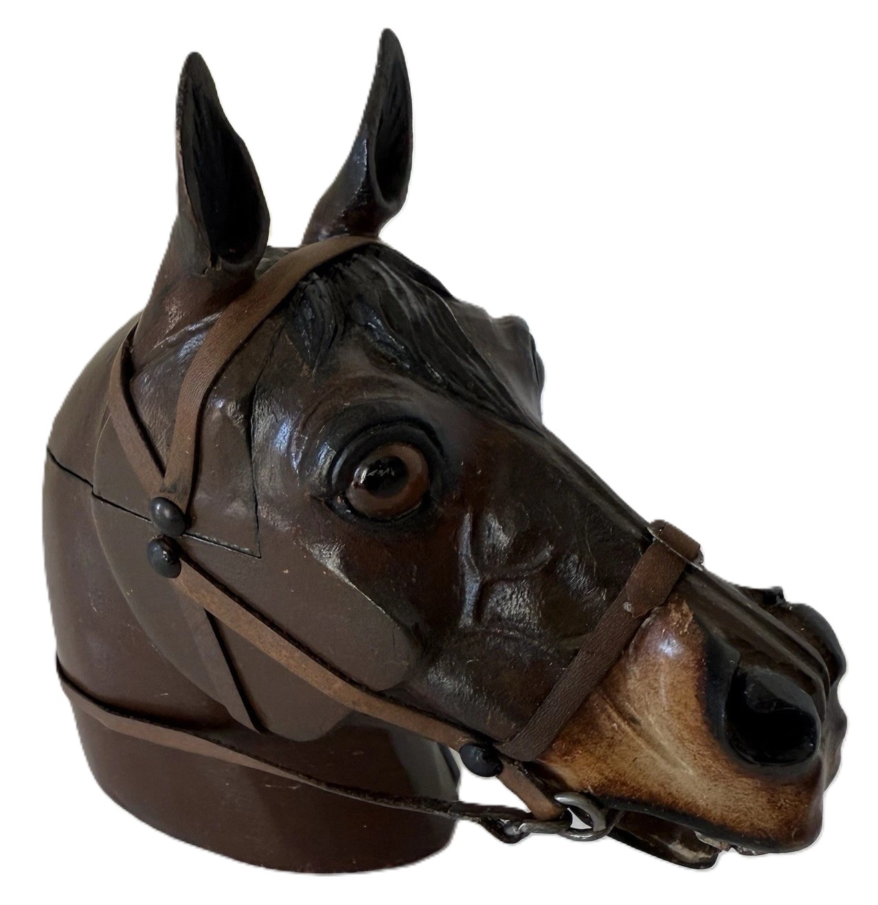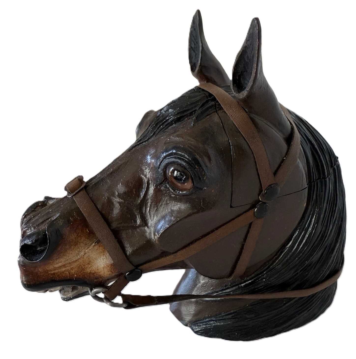 Bridle: The realism of the carving is further enhanced by the leather bridle. The bridle is well-made, with thin leather straps held in place by small brass or dark-colored beads/studs, creating an authentic and functional-looking piece of equestrian tack.