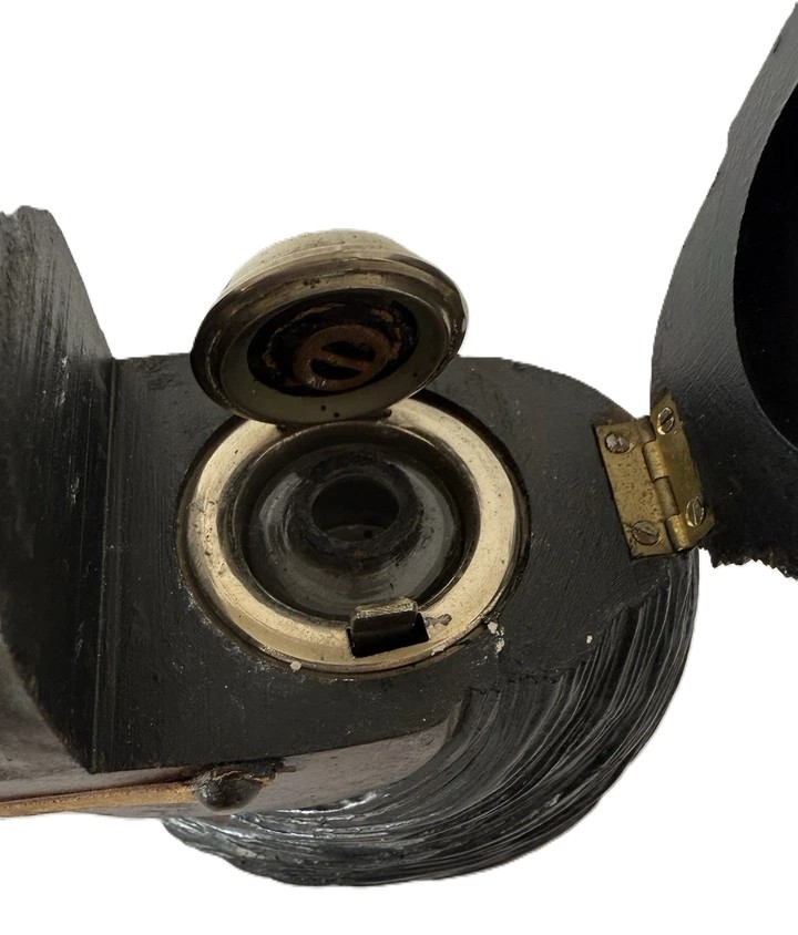 - This lid opens to reveal the internal inkwell. As seen with traveling inkwells, the glass inkwell inside is sealed with a lid that is spring-loaded and opened with a push-button mechanism.