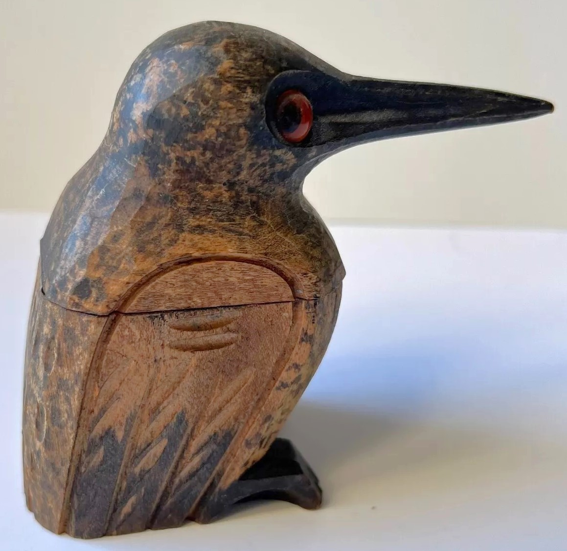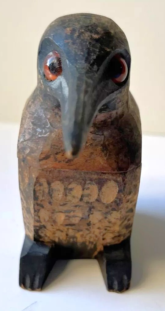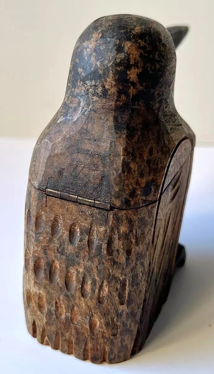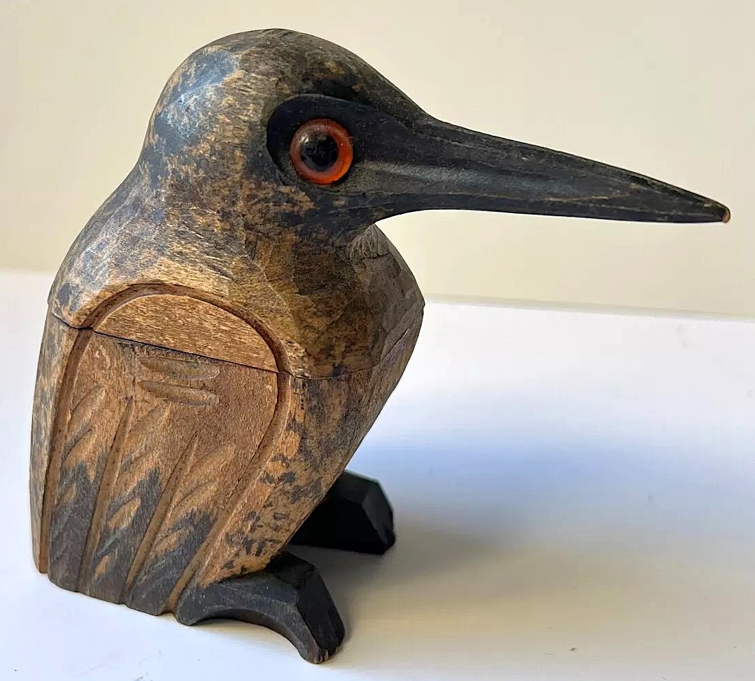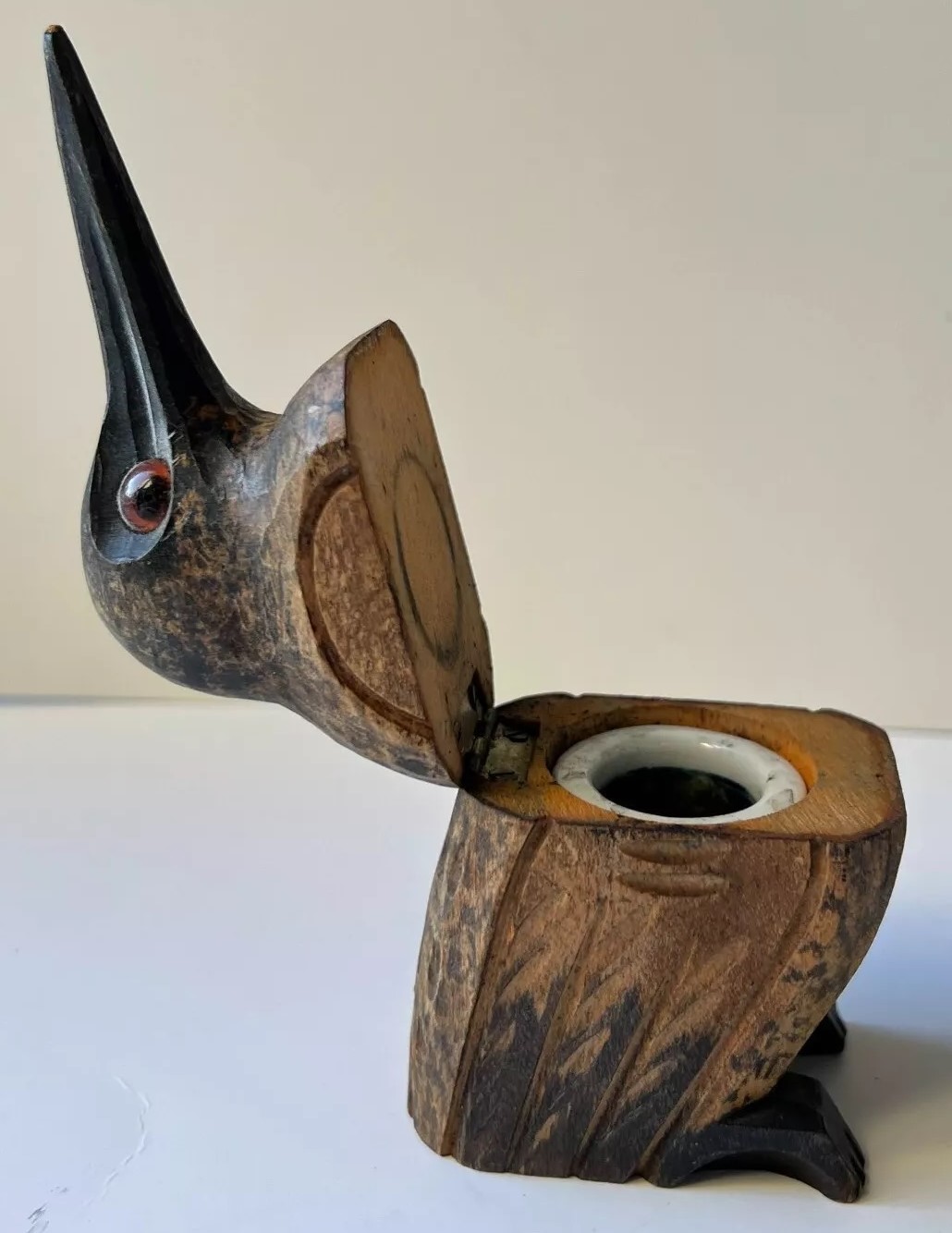This hand-carved bird inkwell has orange glass eyes. The upper half is hinged and opens to access the inkwell. Based on its stout body, large head, and sharp, pointed beak, it resembles a kingfisher. It was probably carved in the Brienz area of Switzerland.