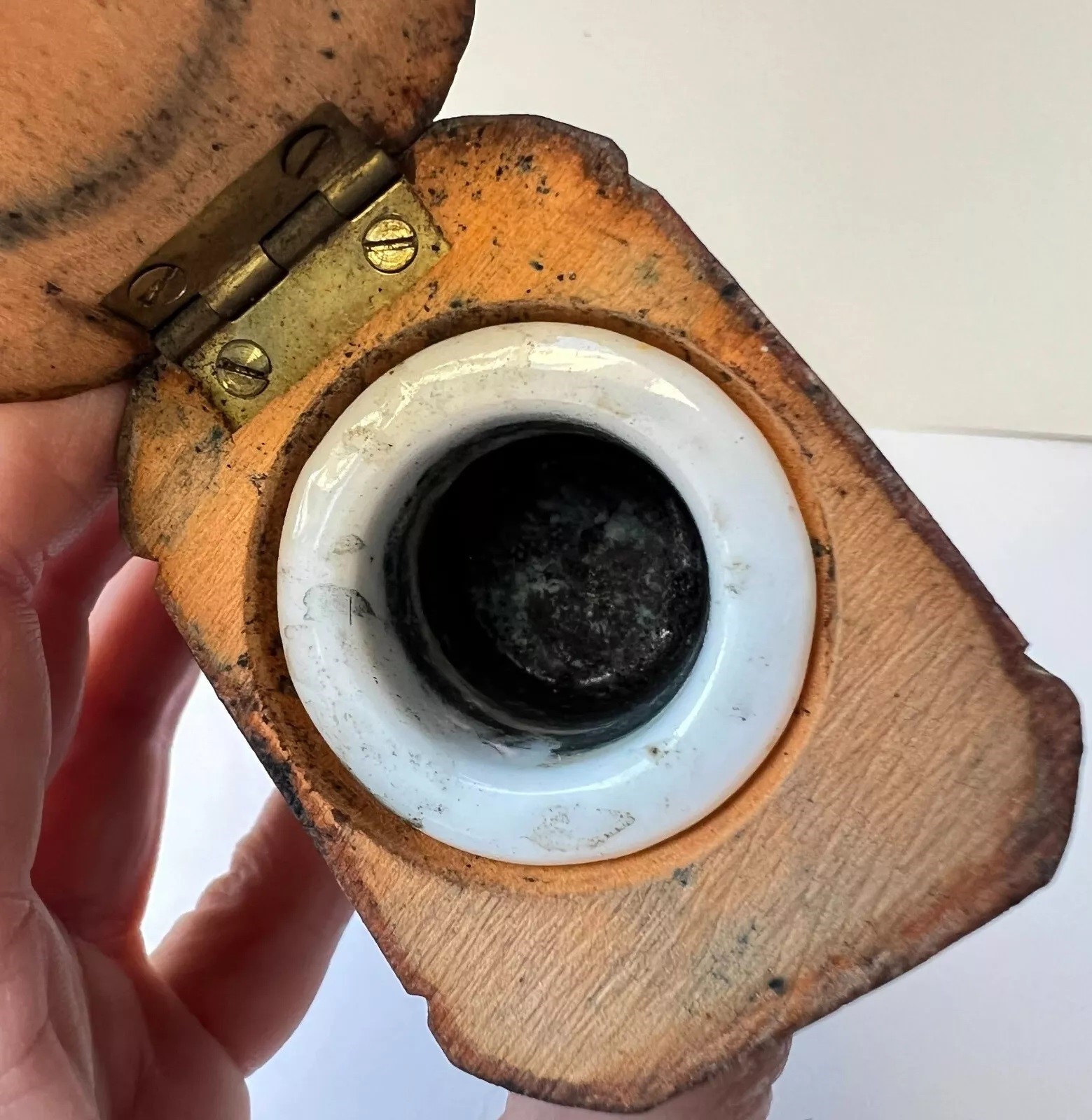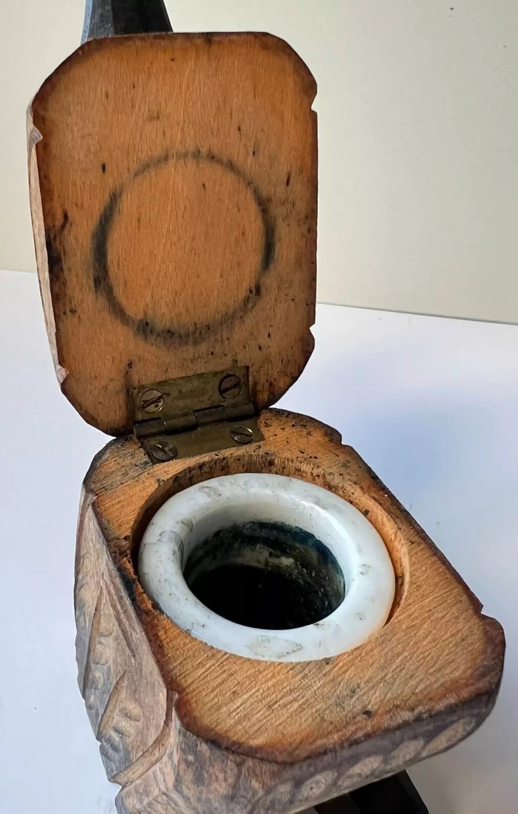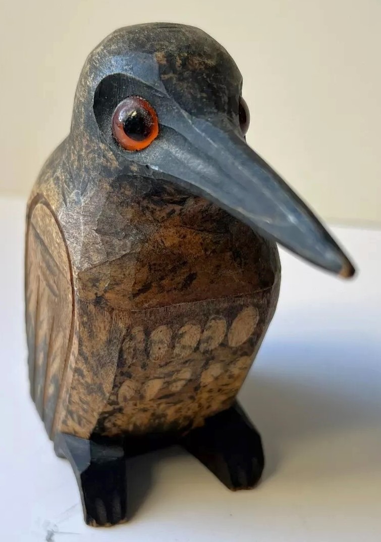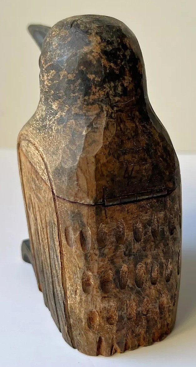 This hand-carved bird inkwell has orange glass eyes. The upper half is hinged and opens to access the inkwell. Based on its stout body, large head, and sharp, pointed beak, it resembles a kingfisher. It was probably carved in the Brienz area of Switzerland.