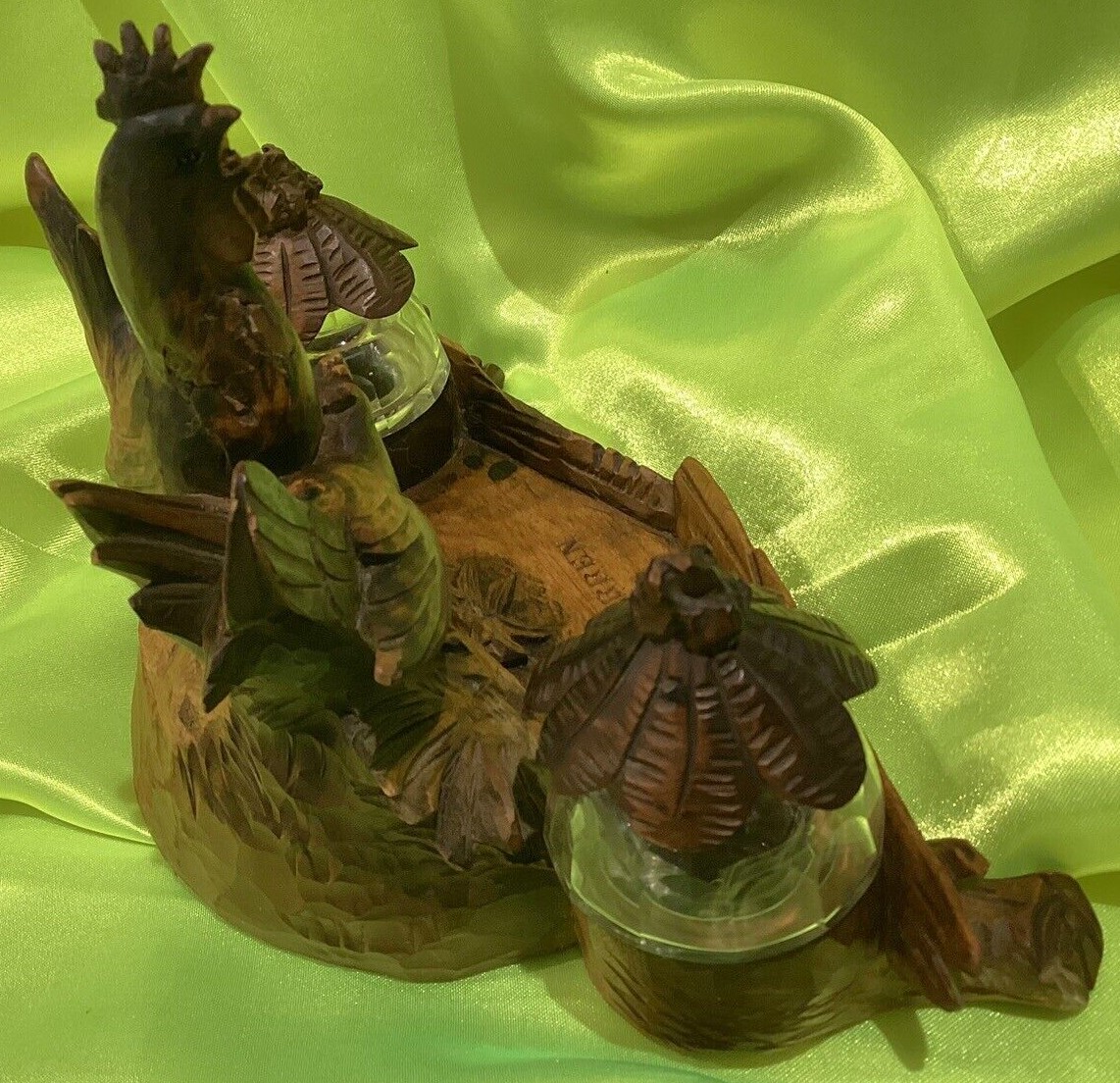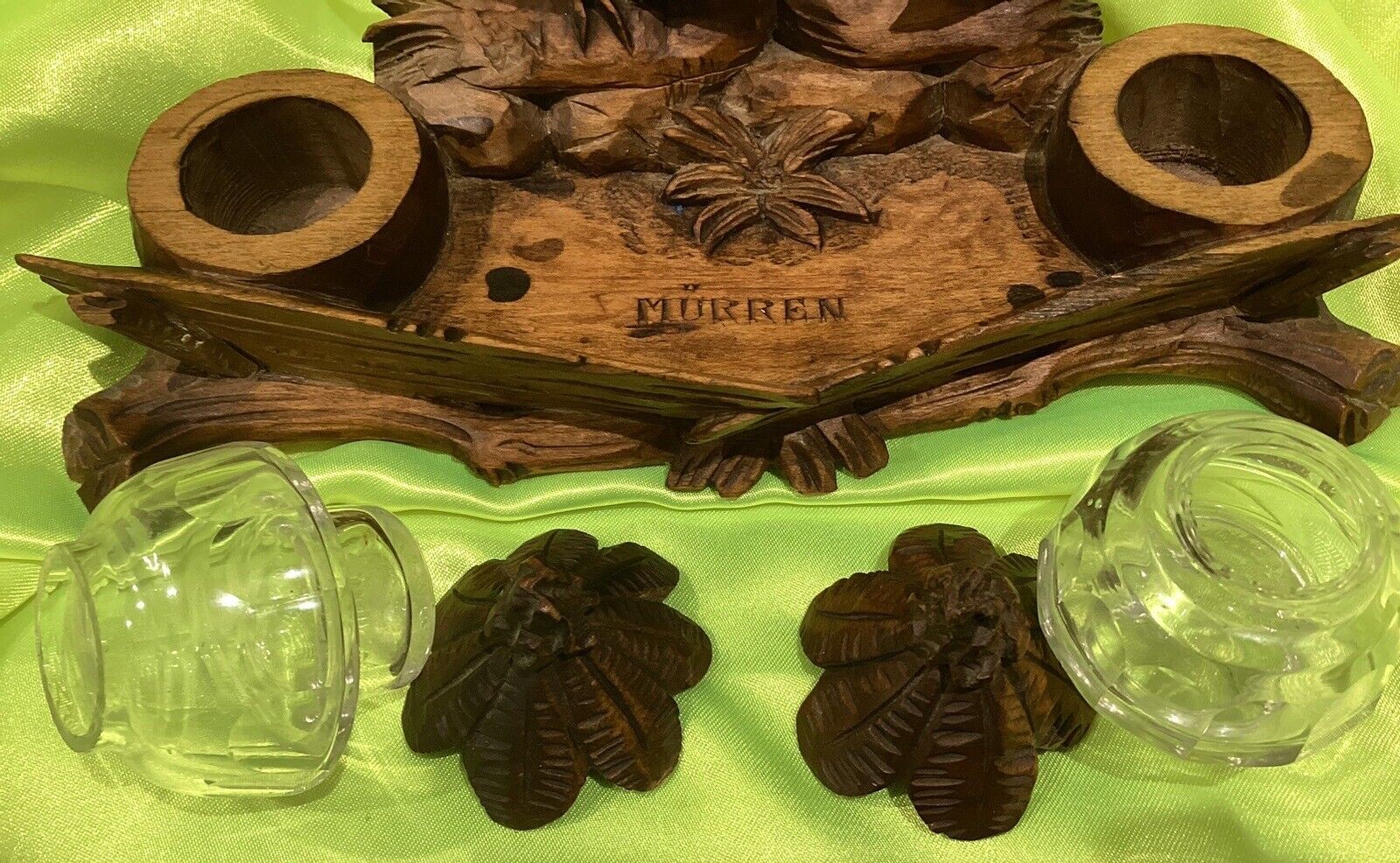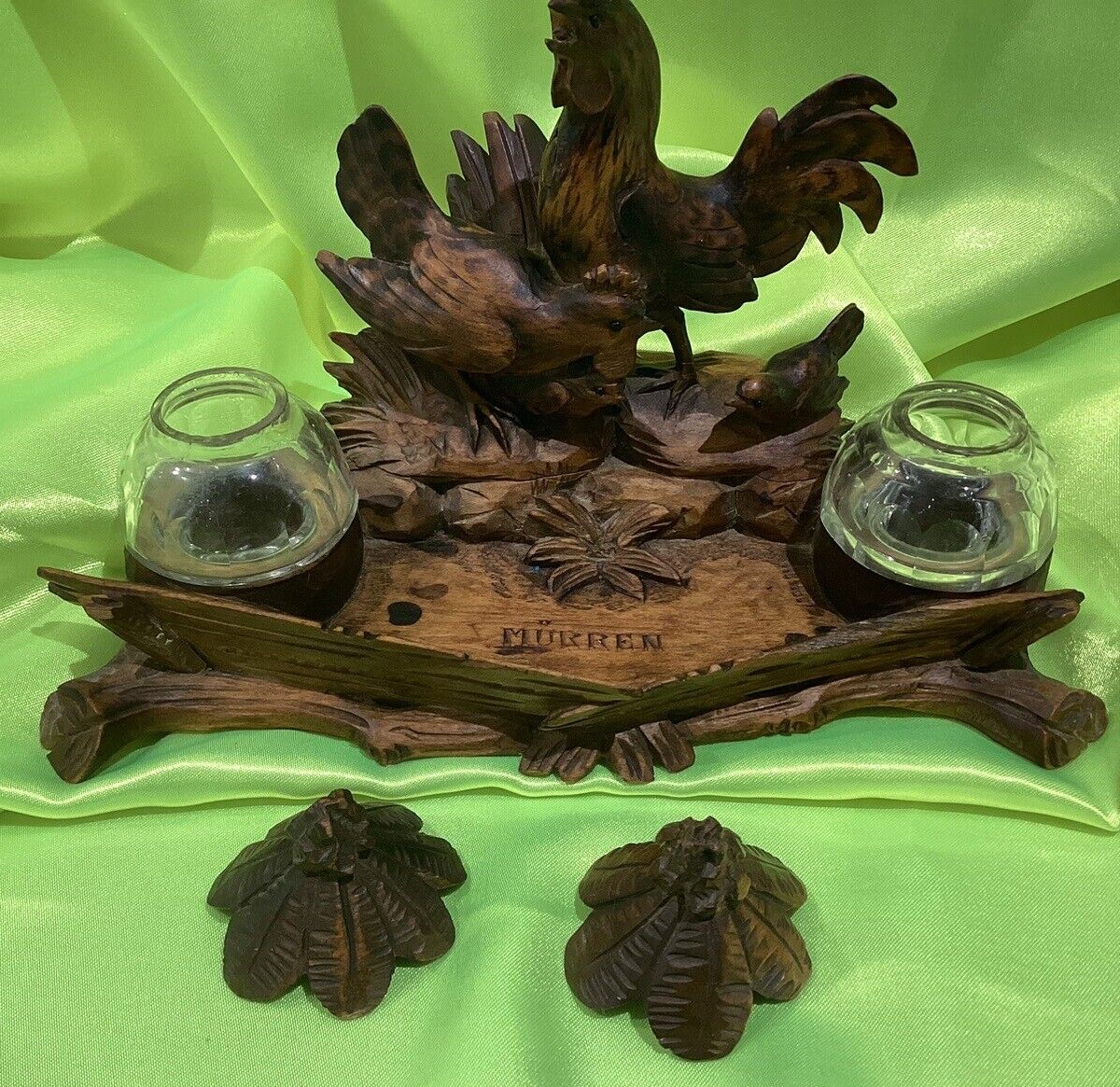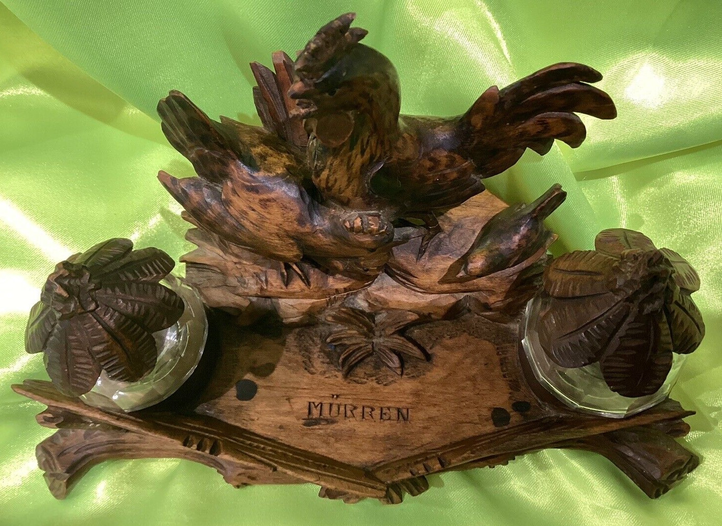 This hand carved inkstand is marked “Mürren”, a popular Swiss resort village. This inkstand was likely a souvenir. It features a rooster, hen, and baby chick, each with glass beaded eyes. One either side are a matching pair of glass inkwells with carved wood lids.