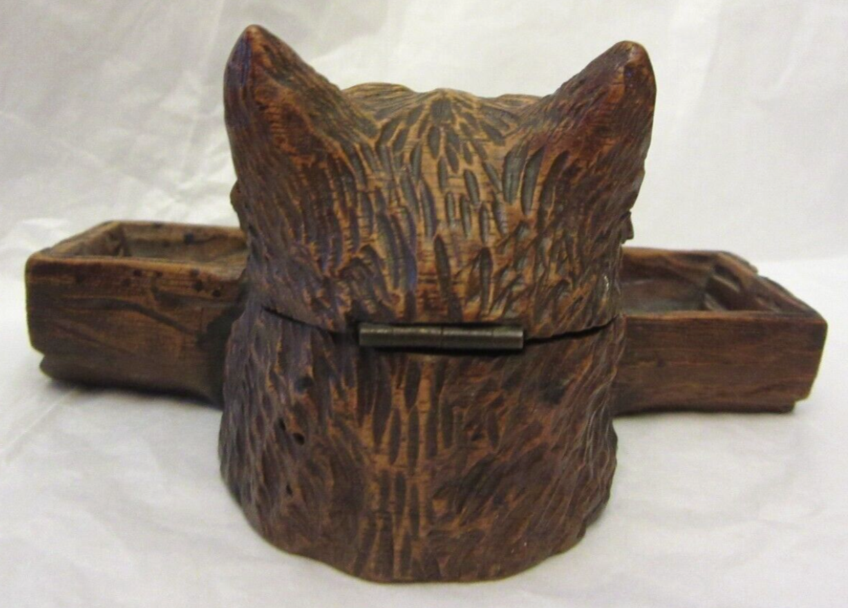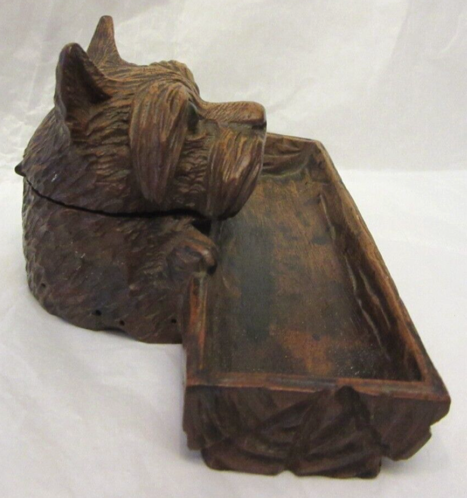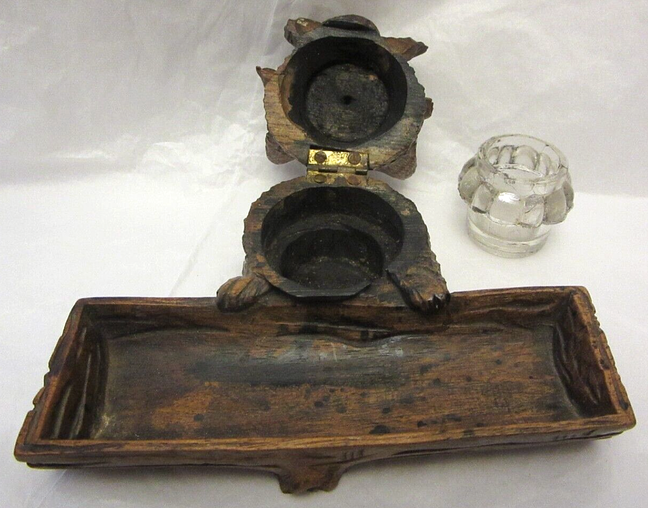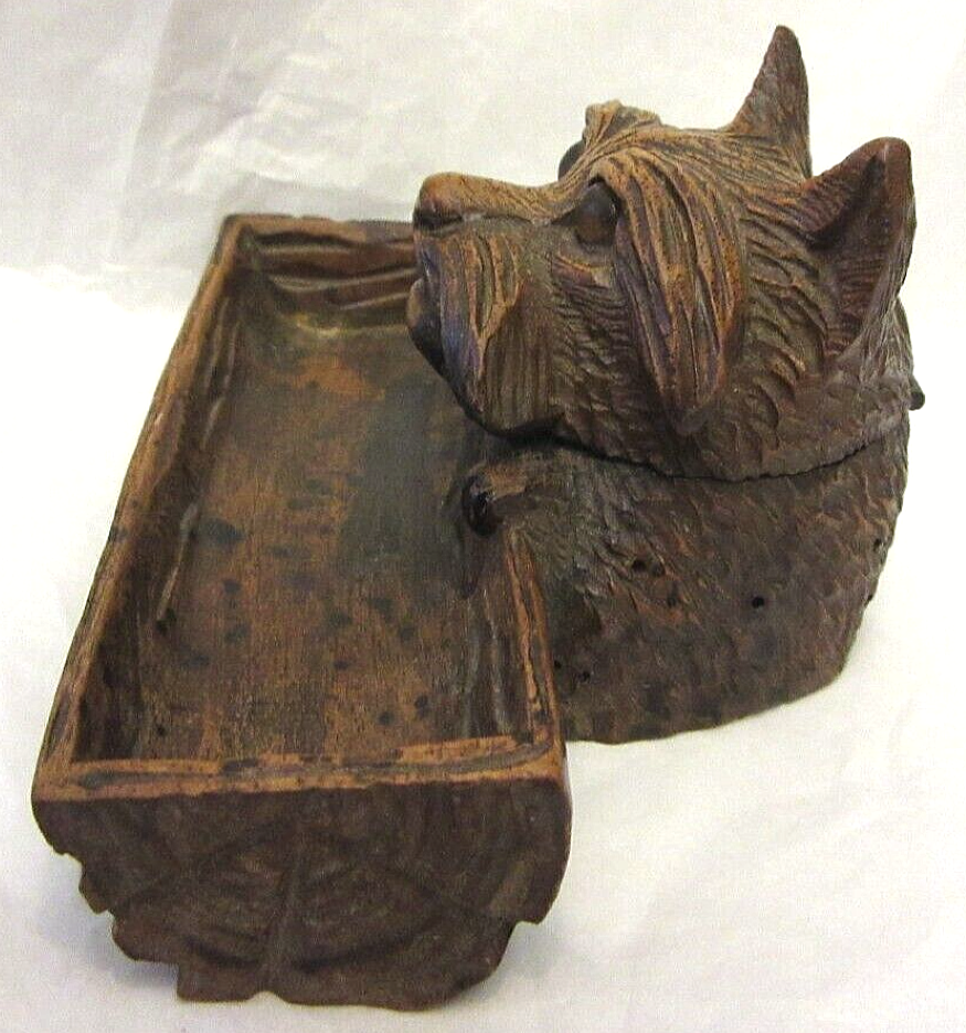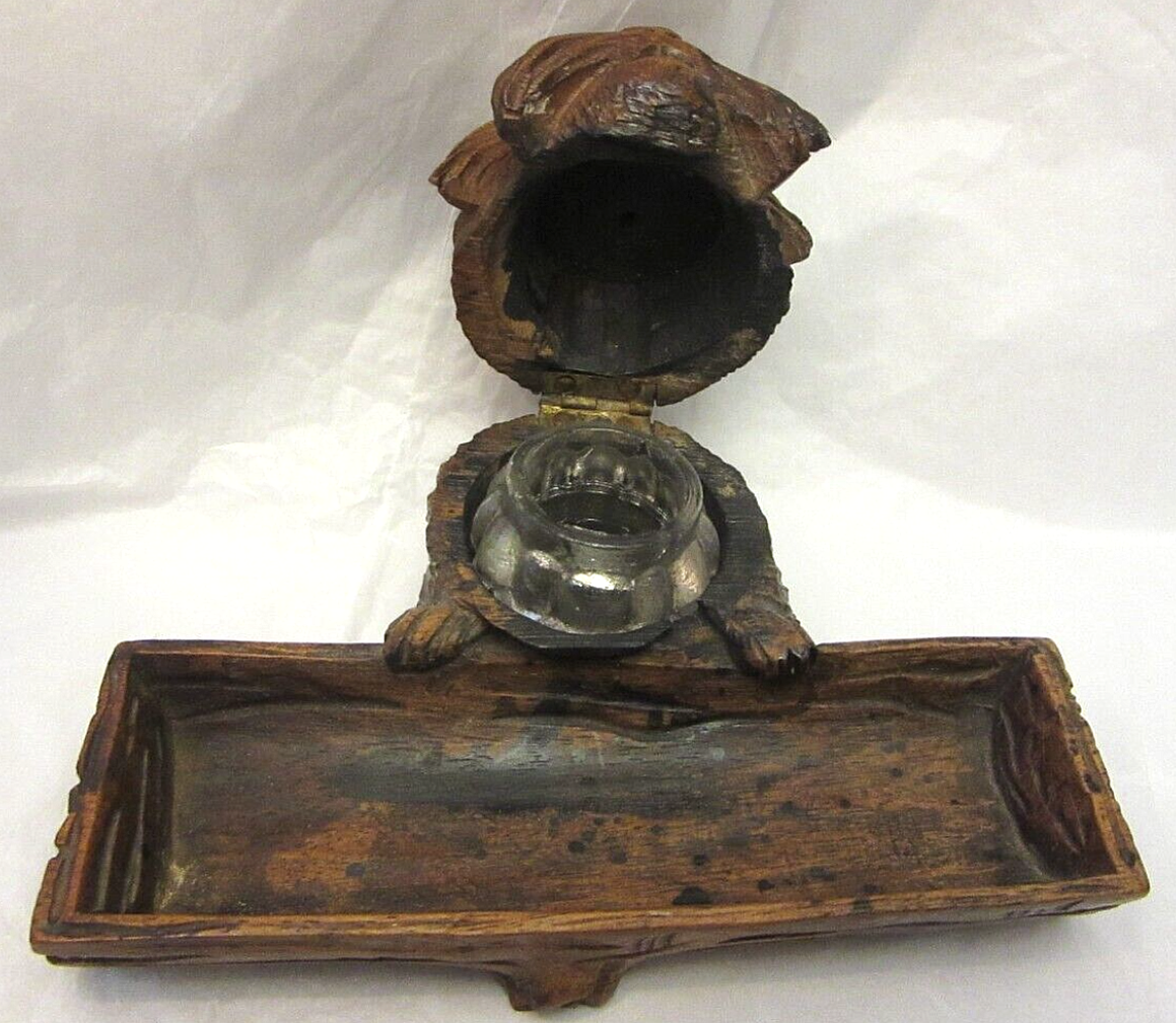 The head of a Scotty dog with glass eyes peers over a trough for pens. Hand carved, Black Forest with original glass inkwell.