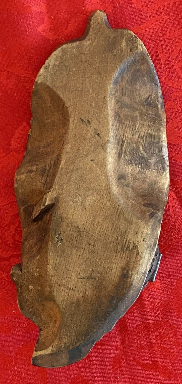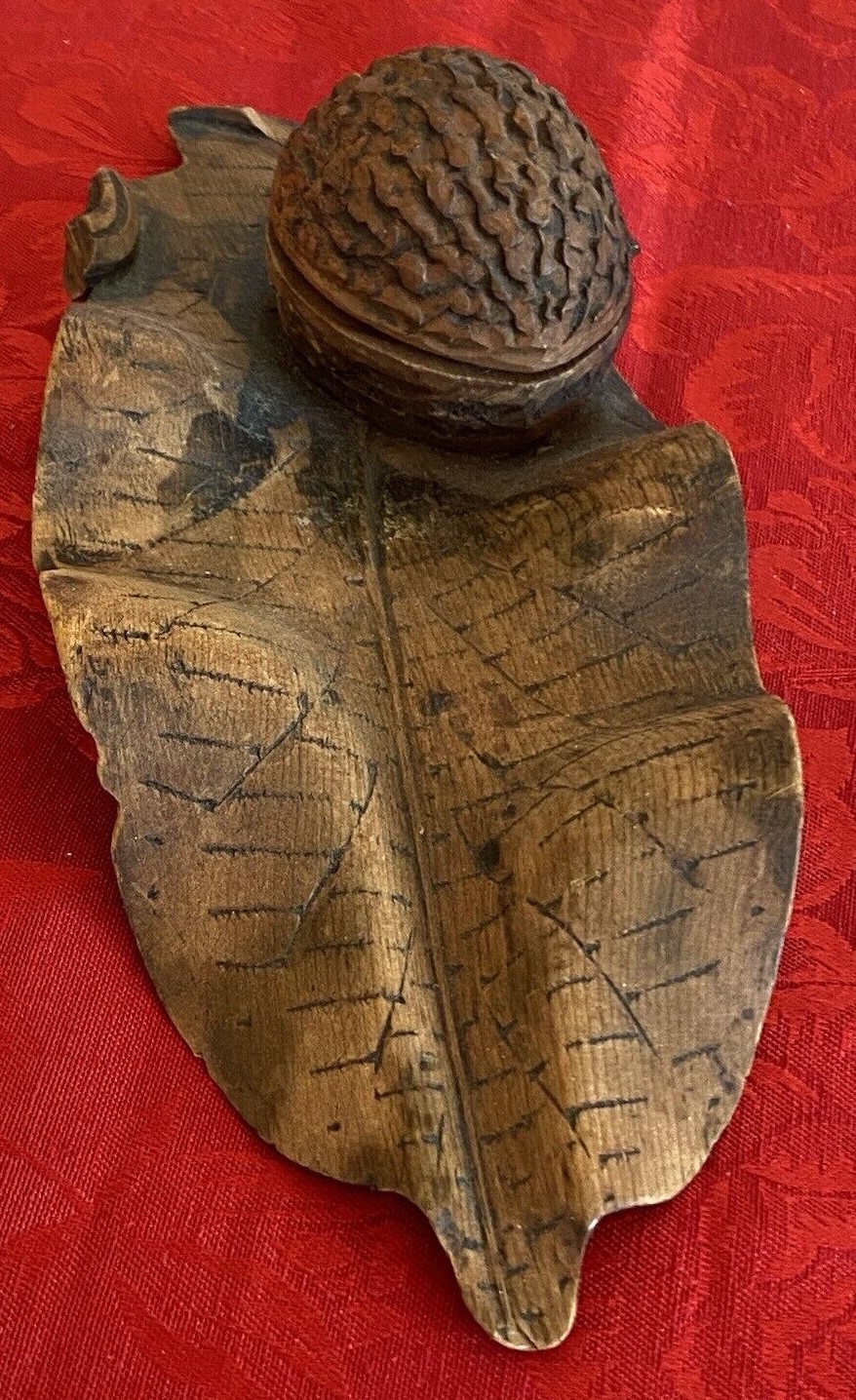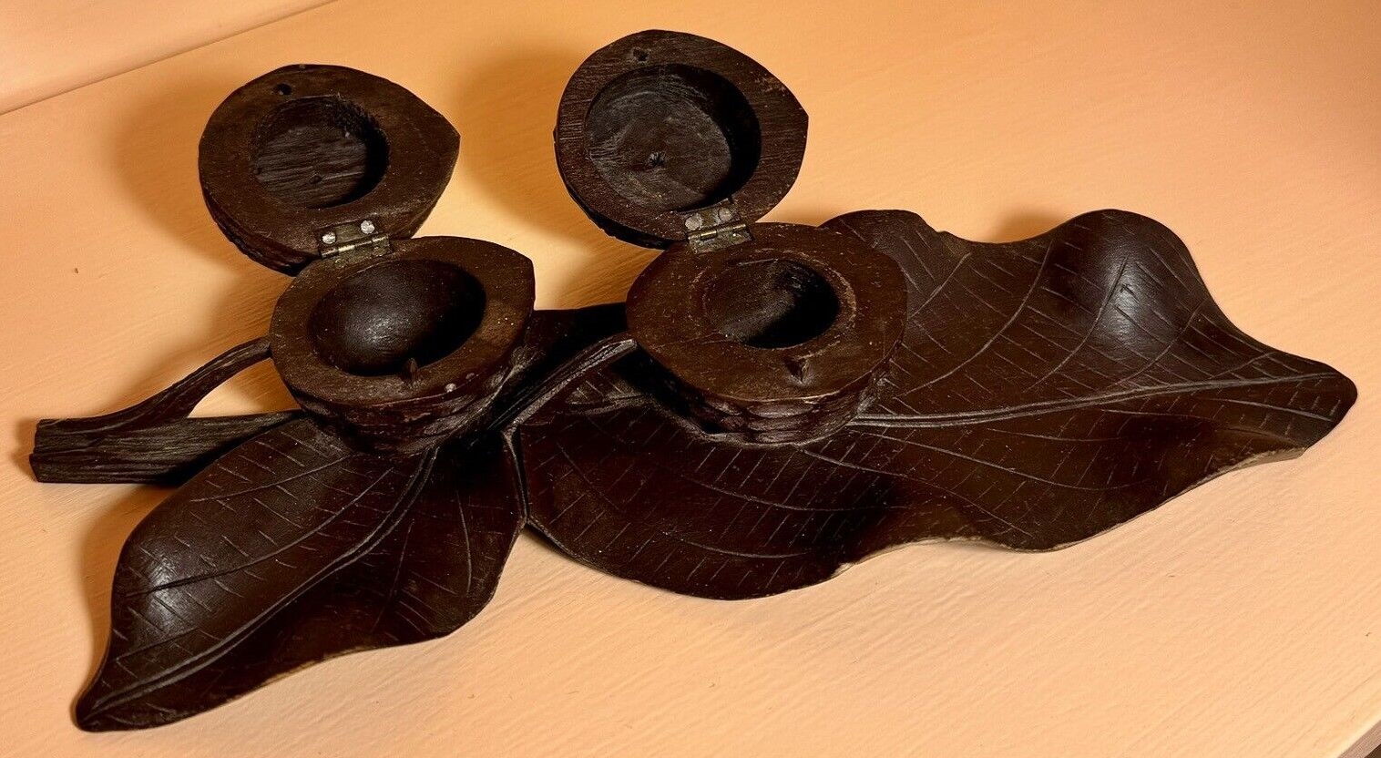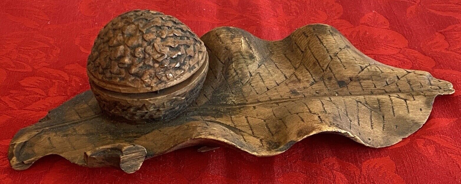 A hand carved inkstand featuring walnuts on a leafy branch. One walnut is the inkwell (missing insert) and the other was for storage.