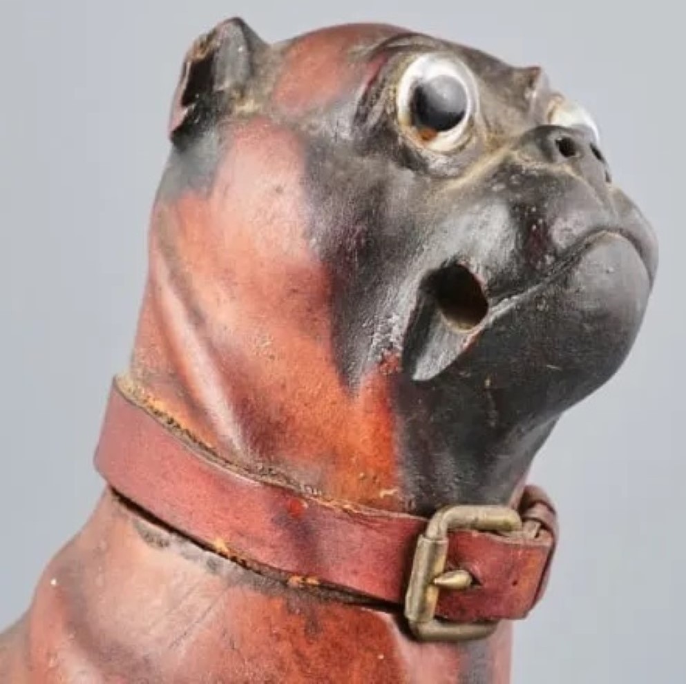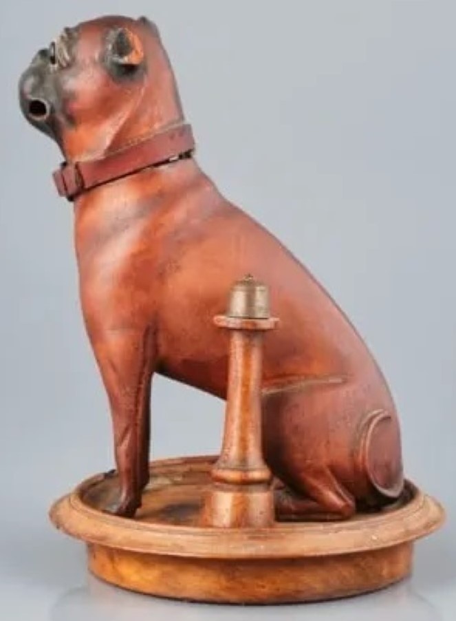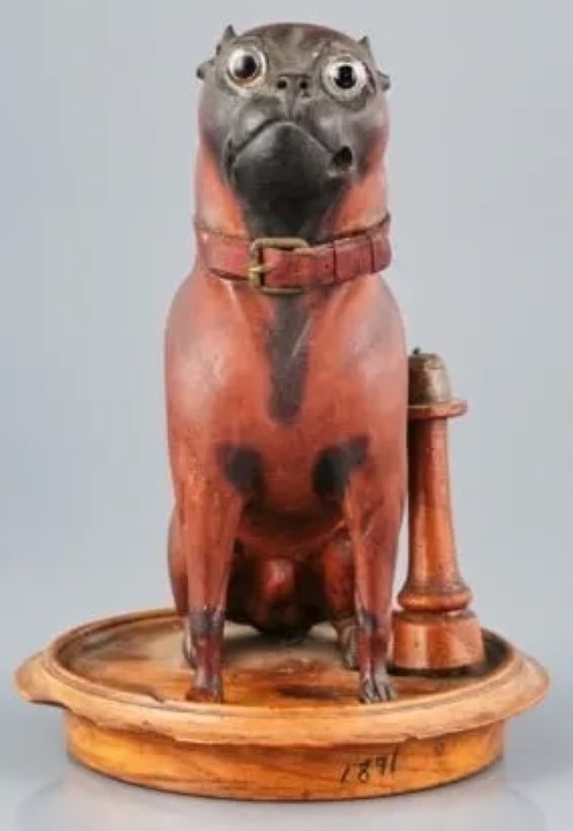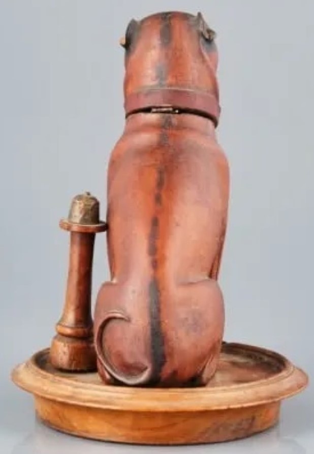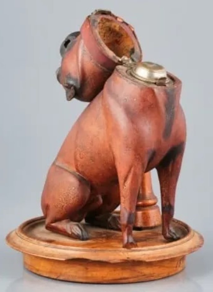 Set with glass eyes and a leather collar, this boxer (or pug?) sits on a treen base. His hinged head tilts open to access the inkwell which has a spring-loaded thumb-release lid. Glass ink bottle is missing. His mouth has an opening to hold a pen.