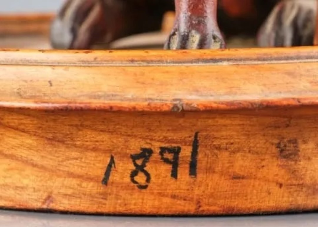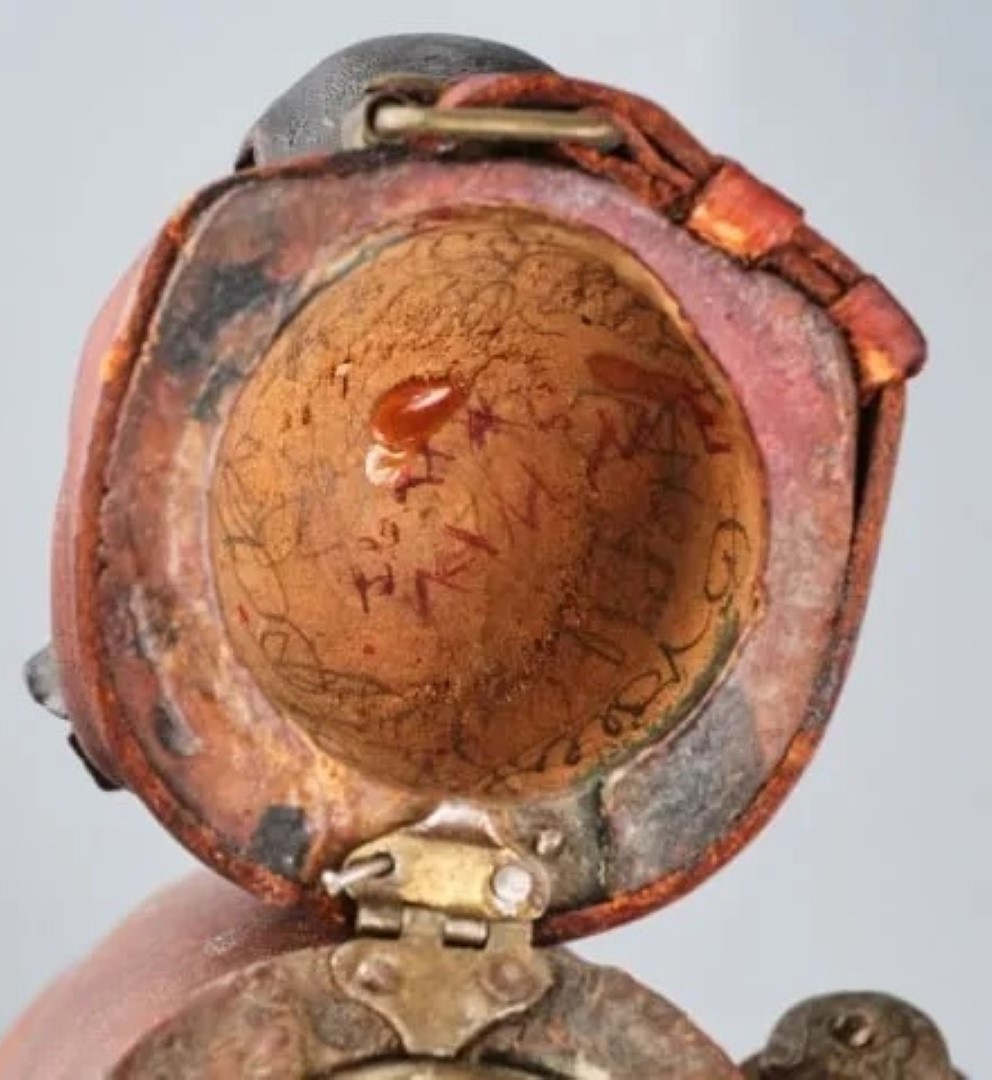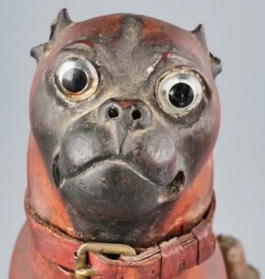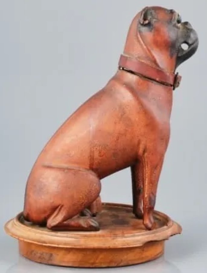 Set with glass eyes and a leather collar, this boxer (or pug?) sits on a treen base. His hinged head tilts open to access the inkwell which has a spring-loaded thumb-release lid. Glass ink bottle is missing. His mouth has an opening to hold a pen.