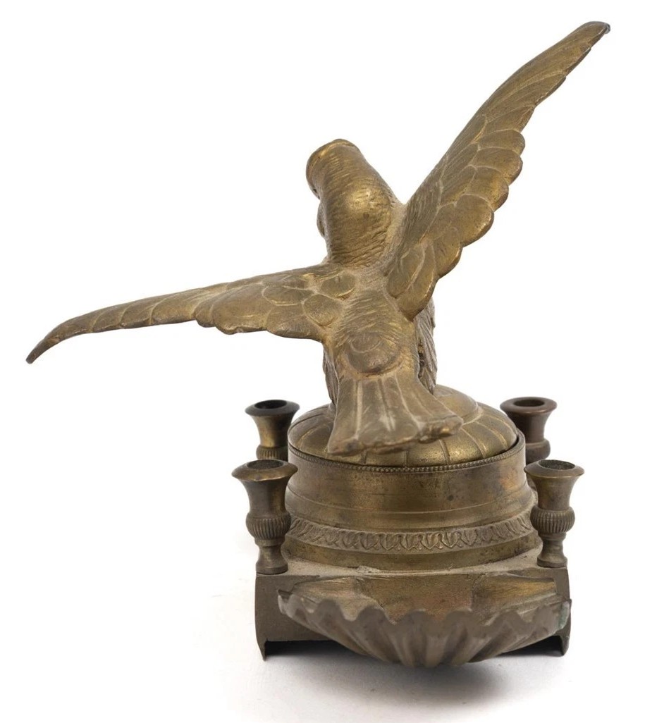 • Central Inkwell: The centerpiece is a circular brass housing designed to hold an ink pot (the insert is missing here).