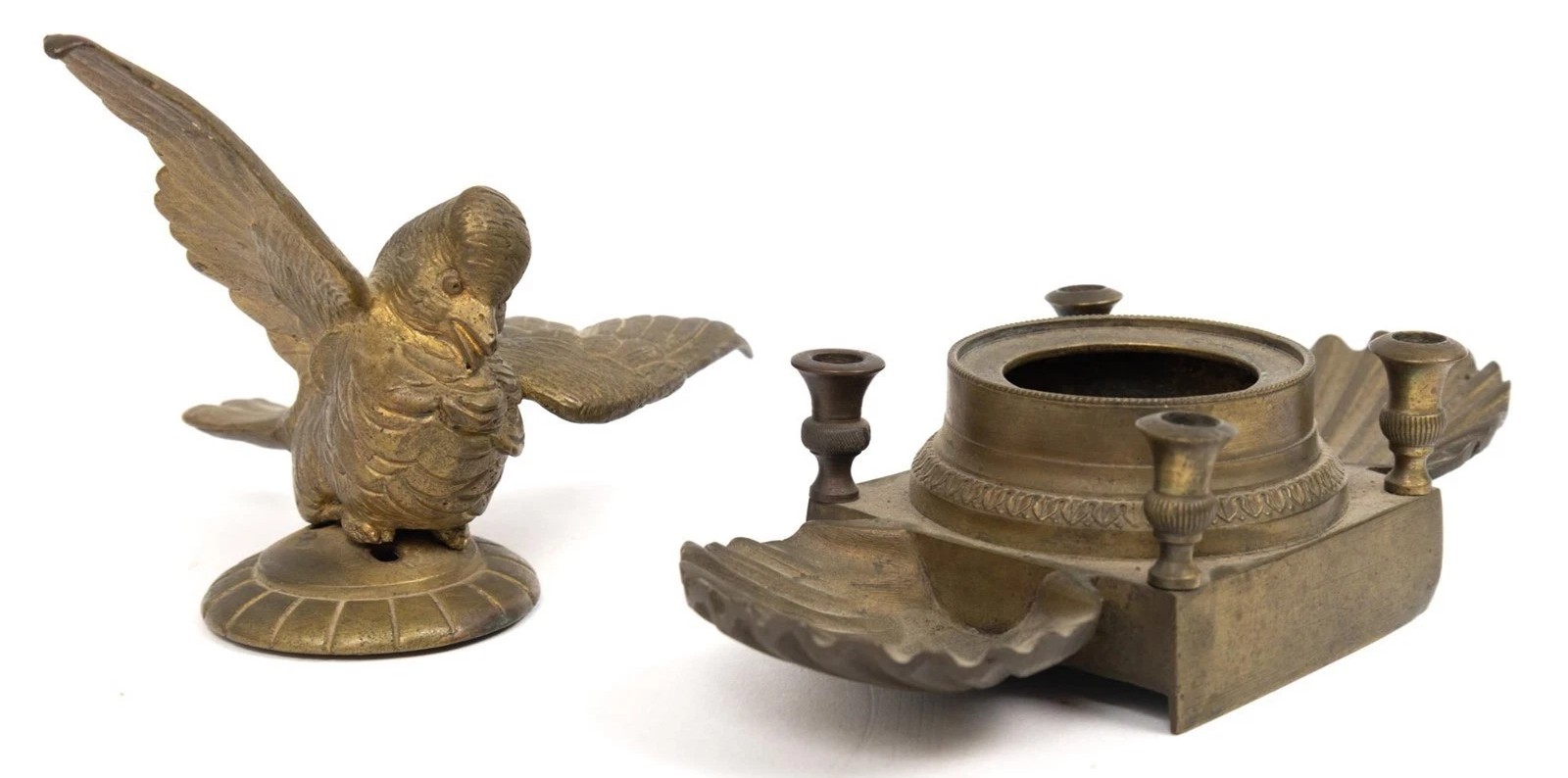 • Shell Trays: Flanking the central base are two large, fluted scallop shell trays. These served as “pen rests” or “tidy trays” for holding extra nibs, wax seals, or pens horizontally.