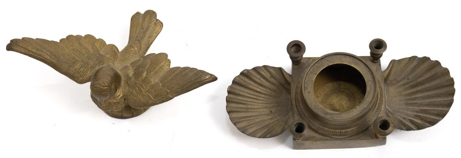 This brass inkstand likely dates from the late 19th century (circa 1875–1895).