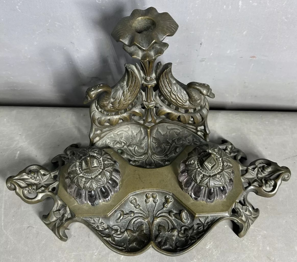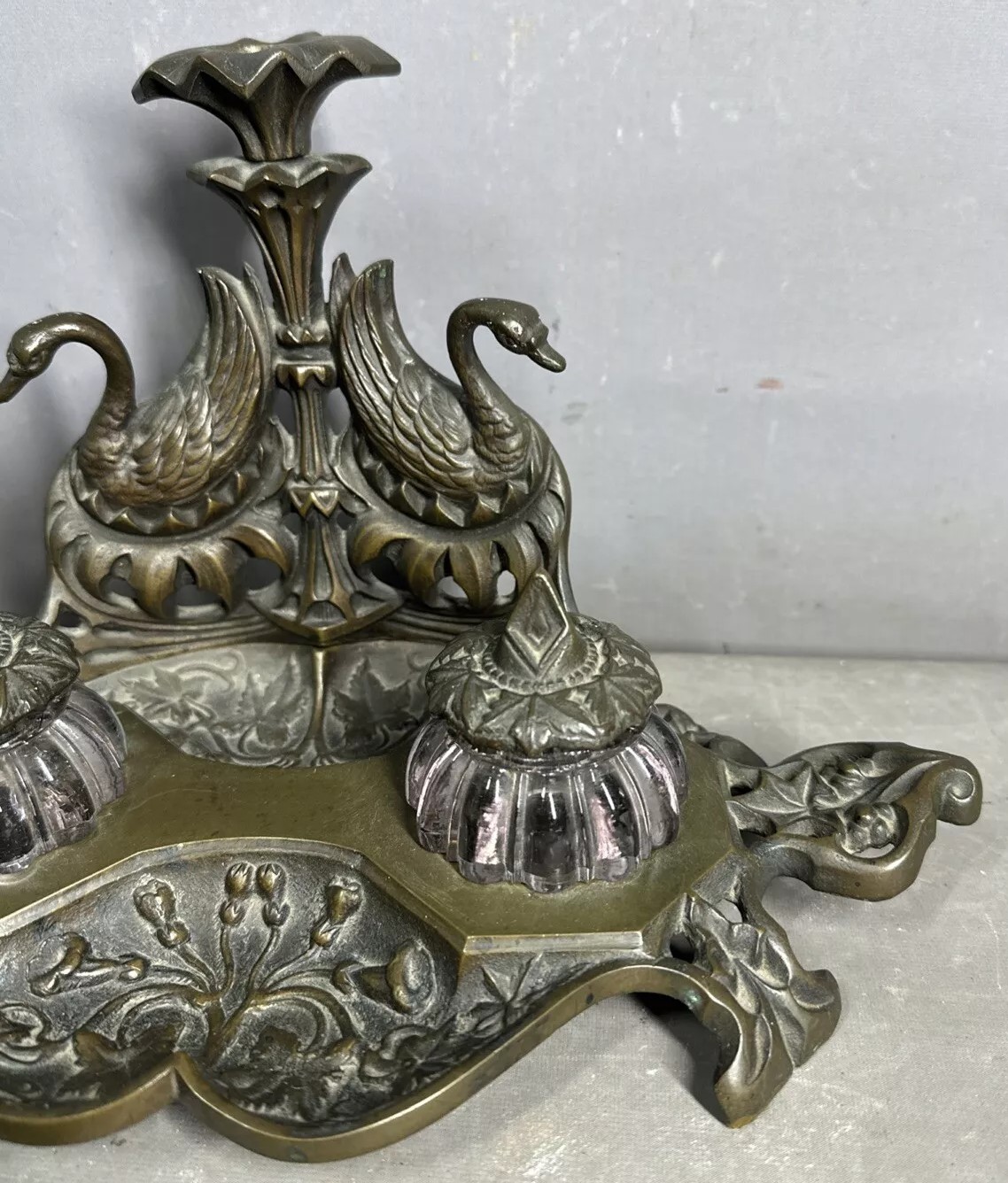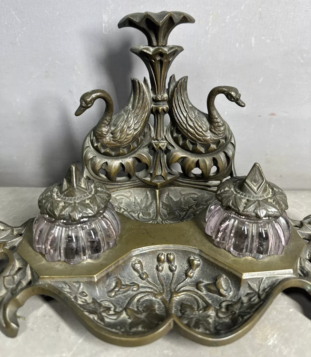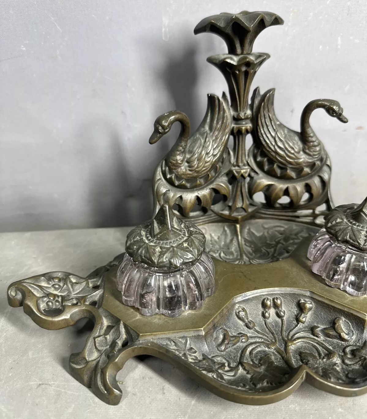 Two glass inkwells with brass lids are seated into an ornate brass base detailed with floral and leaf patterns. Positioned above the inkwells are swans with their wings raised. At the top with a floral design is a candleholder.