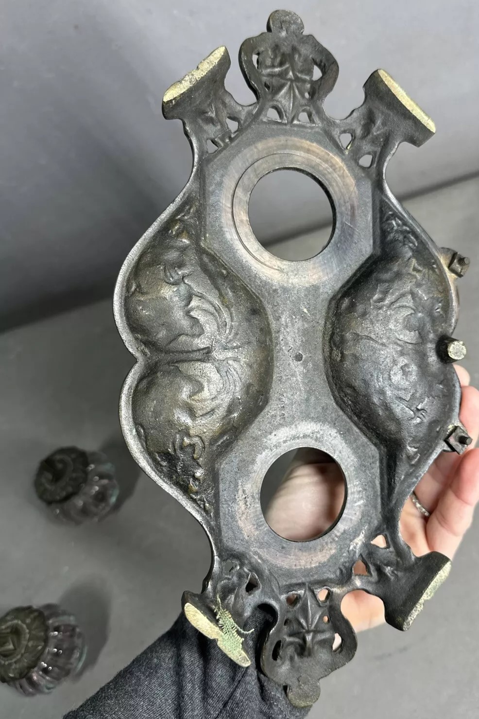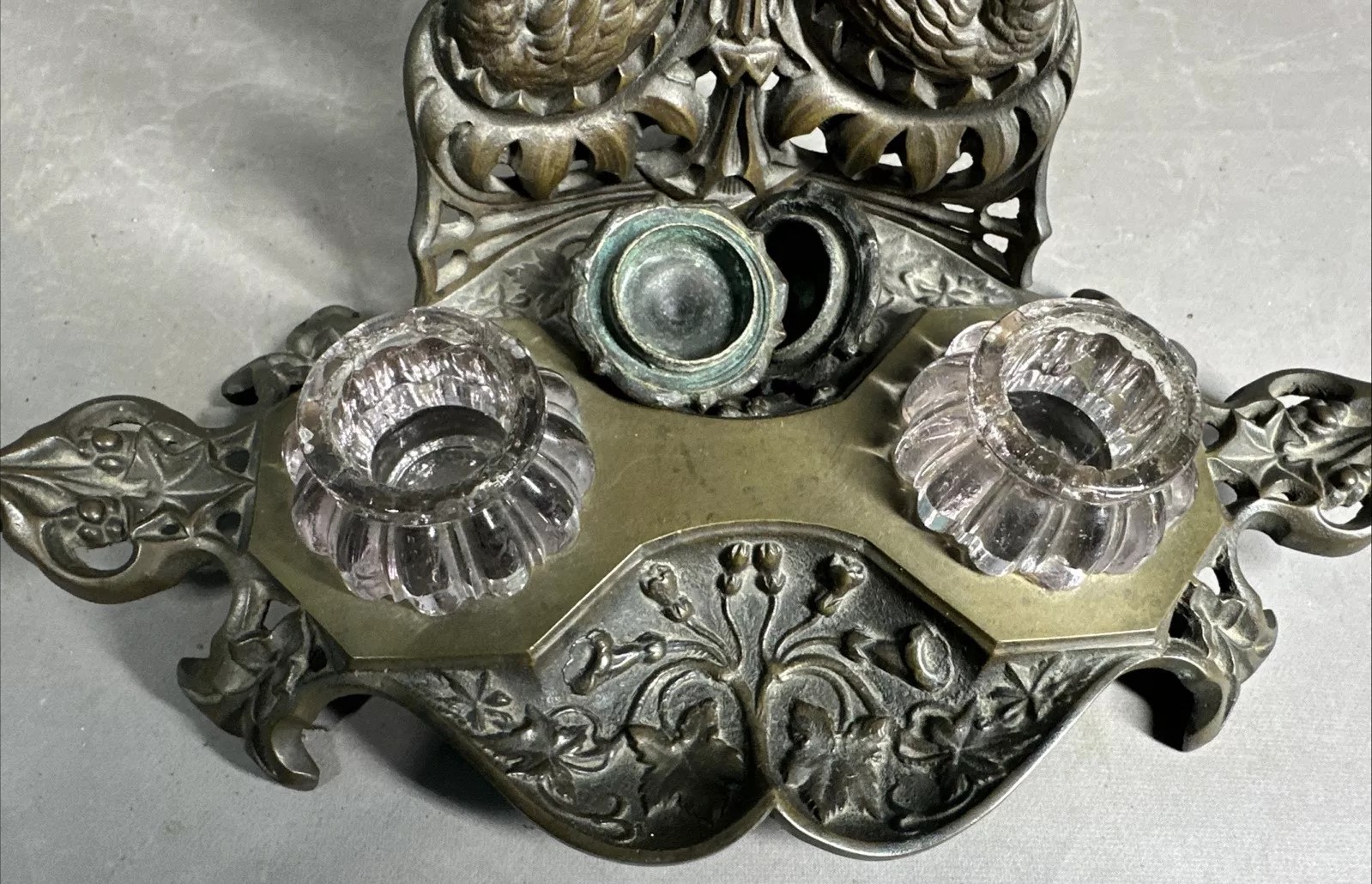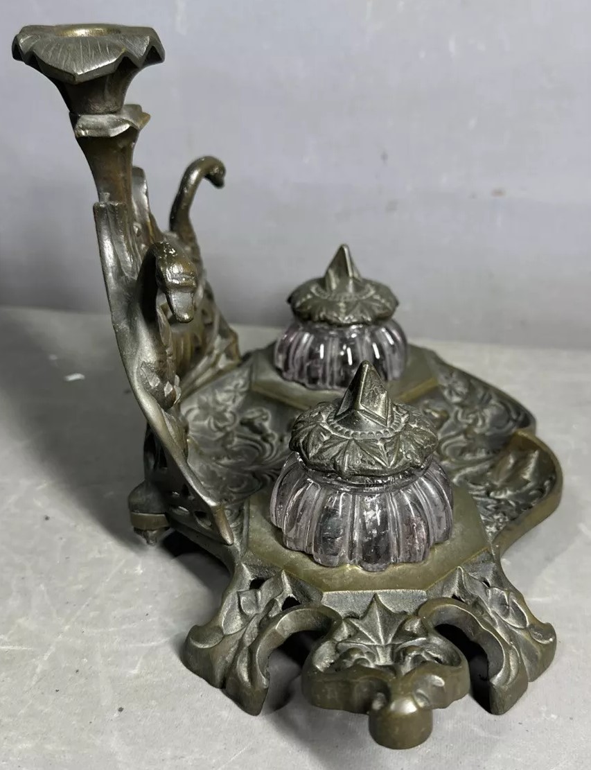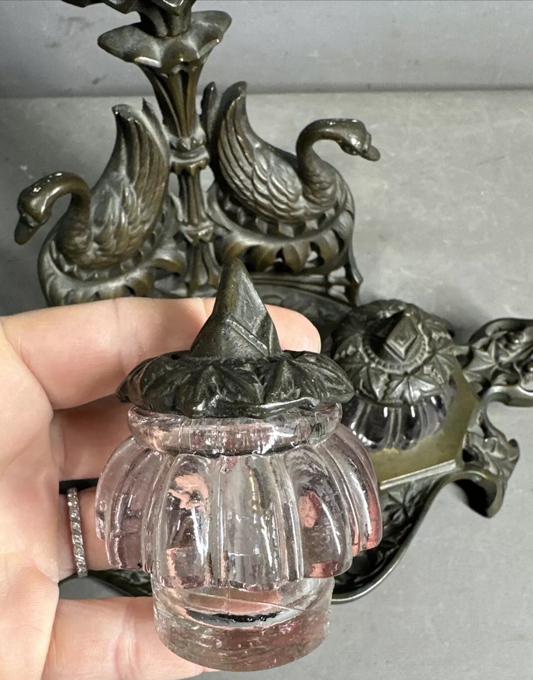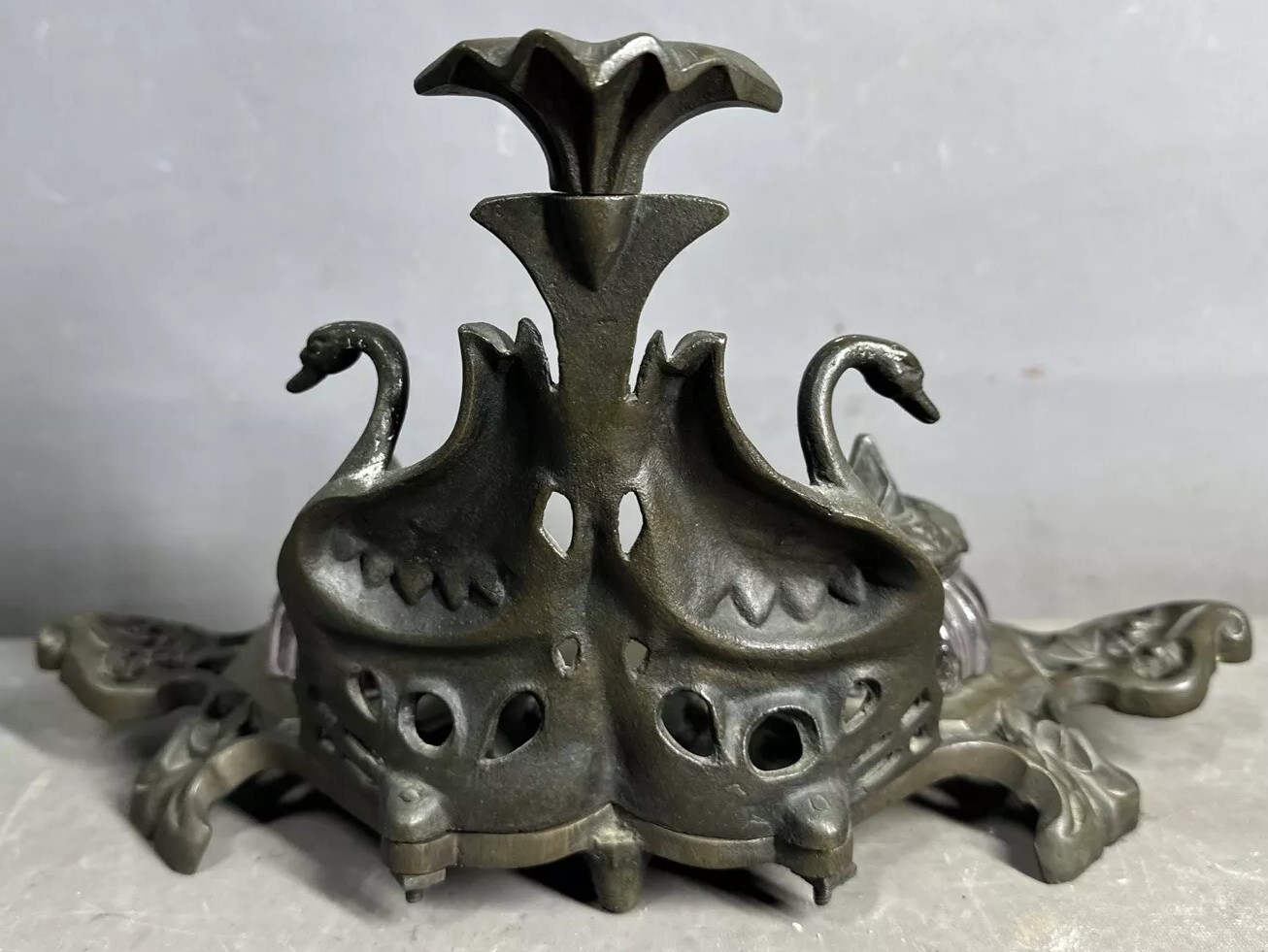 Two glass inkwells with brass lids are seated into an ornate brass base detailed with floral and leaf patterns. Positioned above the inkwells are swans with their wings raised. At the top with a floral design is a candleholder.