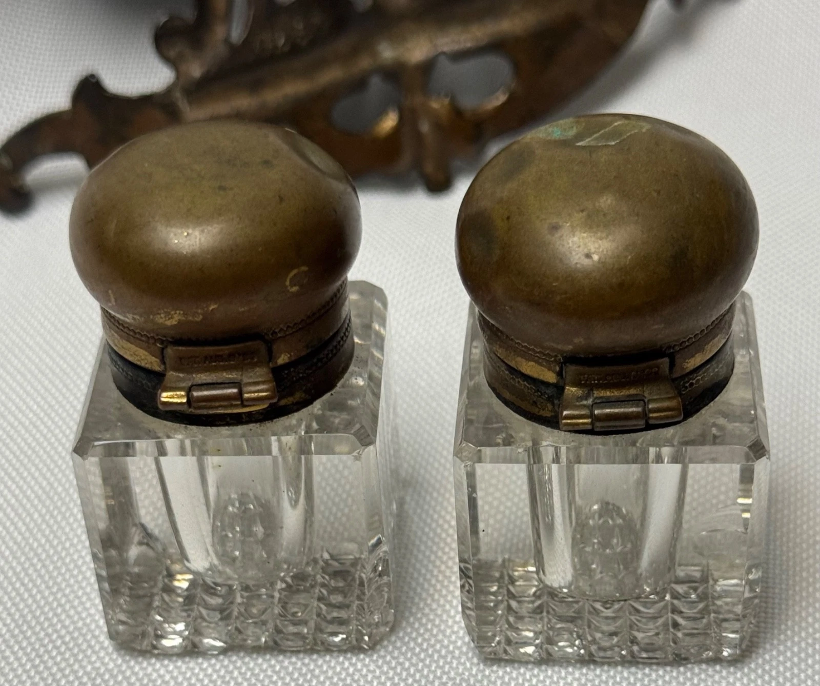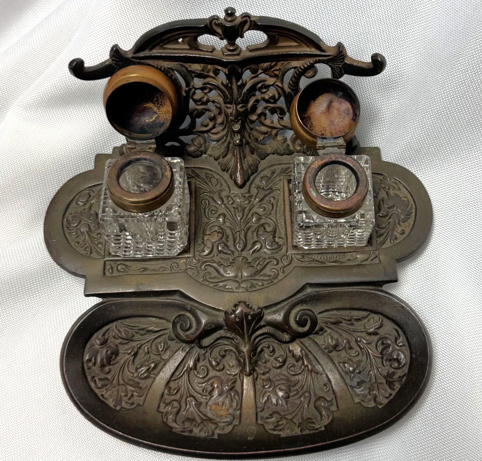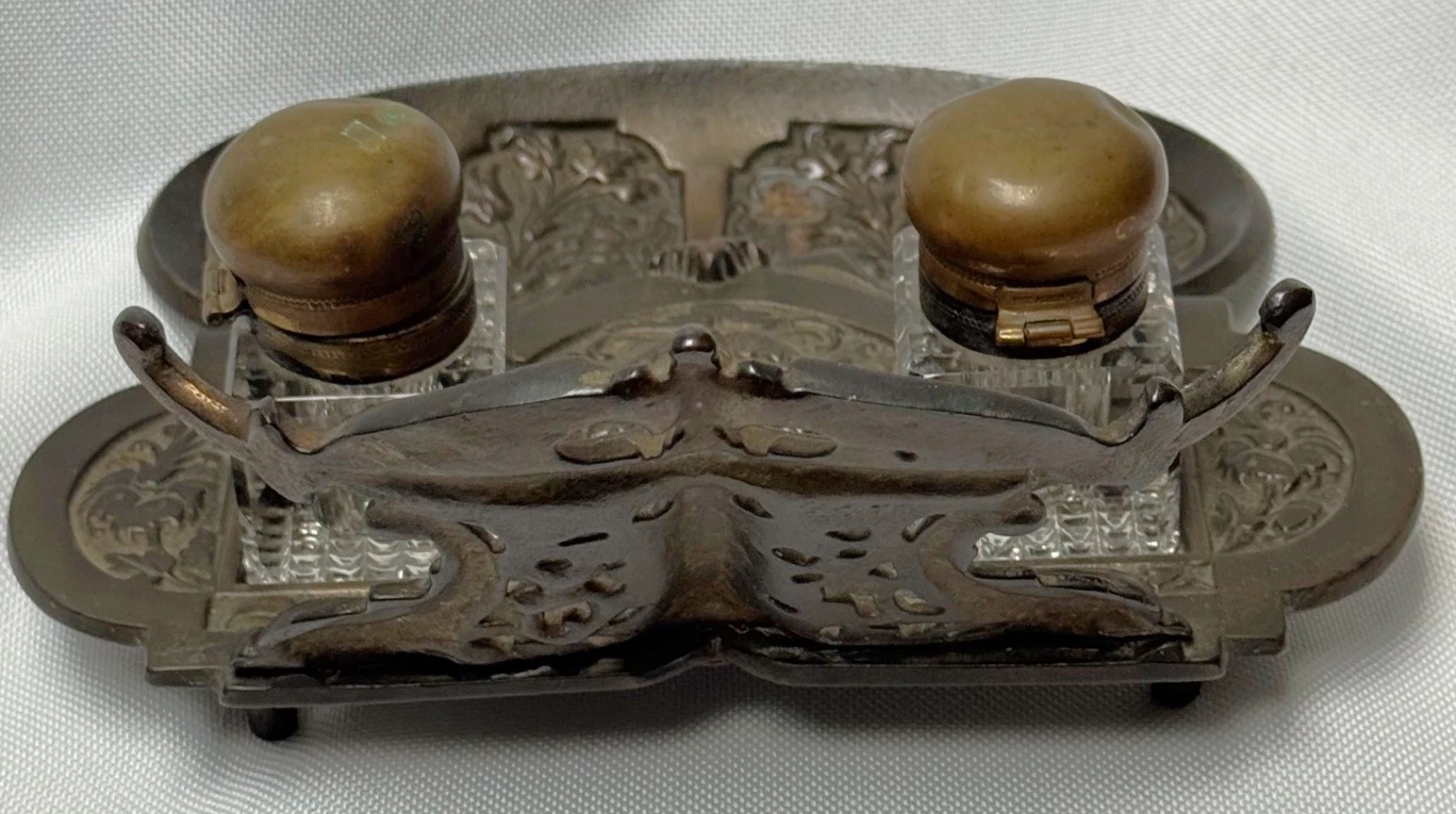 This double inkstand is characterized by its heavy casting and intricate Neoclassical and Rococo Revival motifs.
