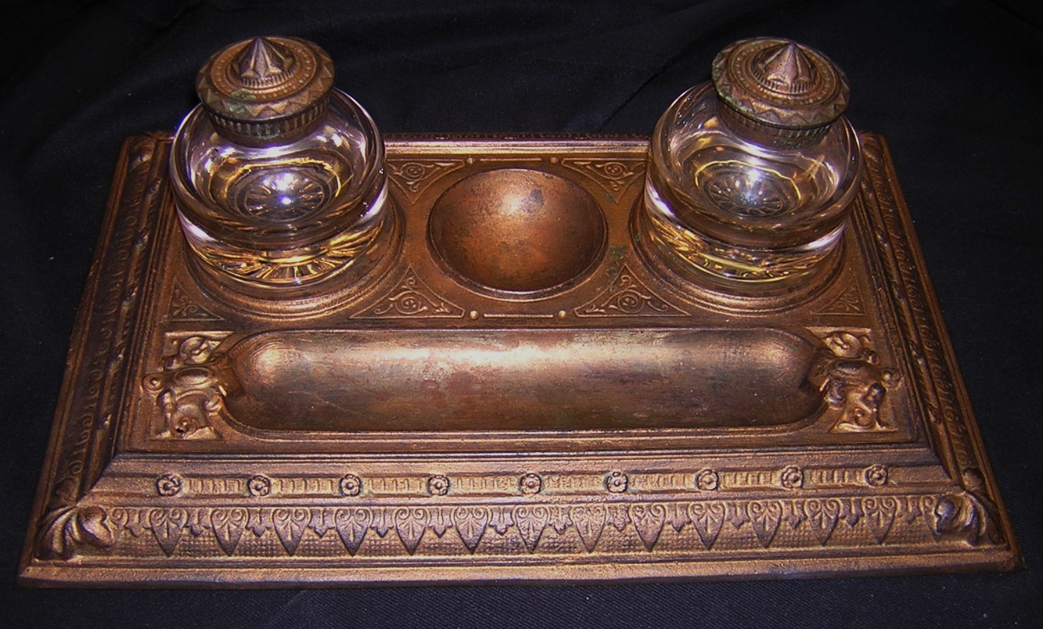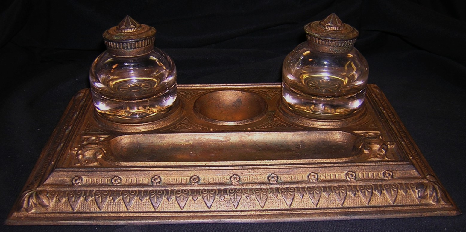 Double inkstand with cast iron base with patinated bronze finish and Greek inspired relief trim. Two pressed glass stemmed inkwells with hinged lids fit into the base.