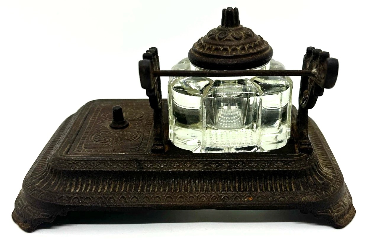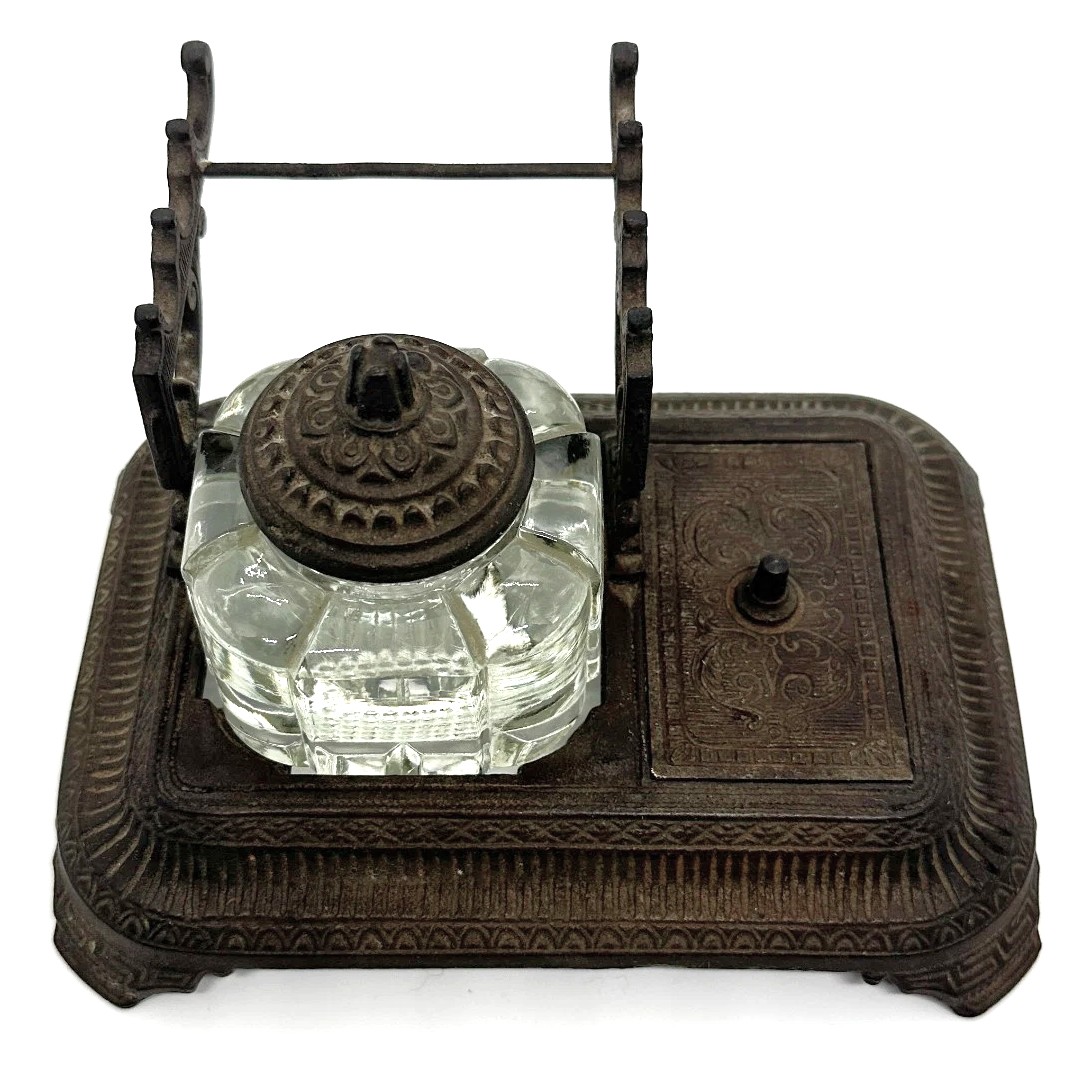 This cast iron inkstand integrates several useful features into a single piece.