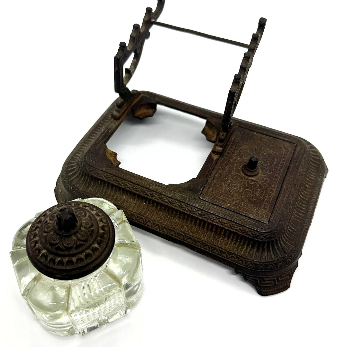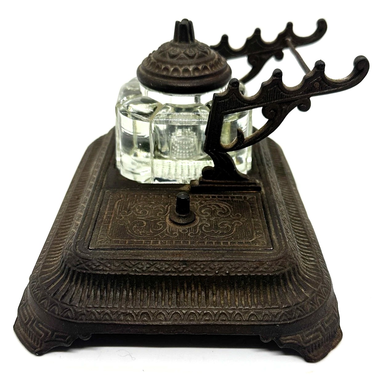 - Pen Rack: At the back of the stand is an elevated pen rack. This rack is also made of cast iron and is decorated with an ornate, scrolling pattern. It is designed to hold three pens.
