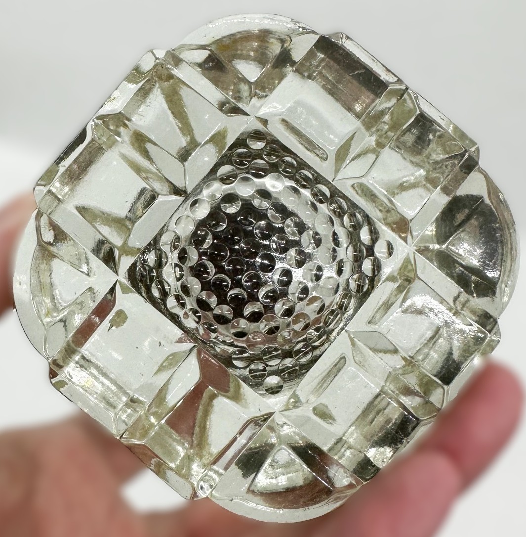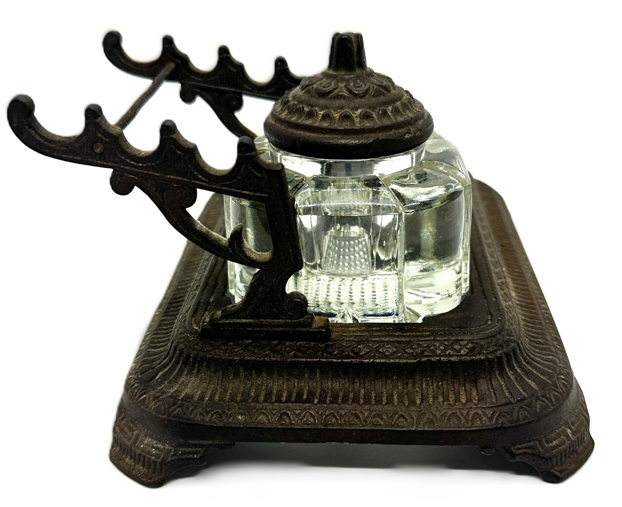 - Inkwell: The inkwell is the centerpiece, a clear pressed glass bottle with a square, faceted shape and a beveled-edge base. The bottom of the inkwell features a patterned design, a result of the pressing process. The inkwell has an unattached cast iron lid with a finial. This type of non-attached lid was common and designed to simply rest on top of the inkwell’s rim.