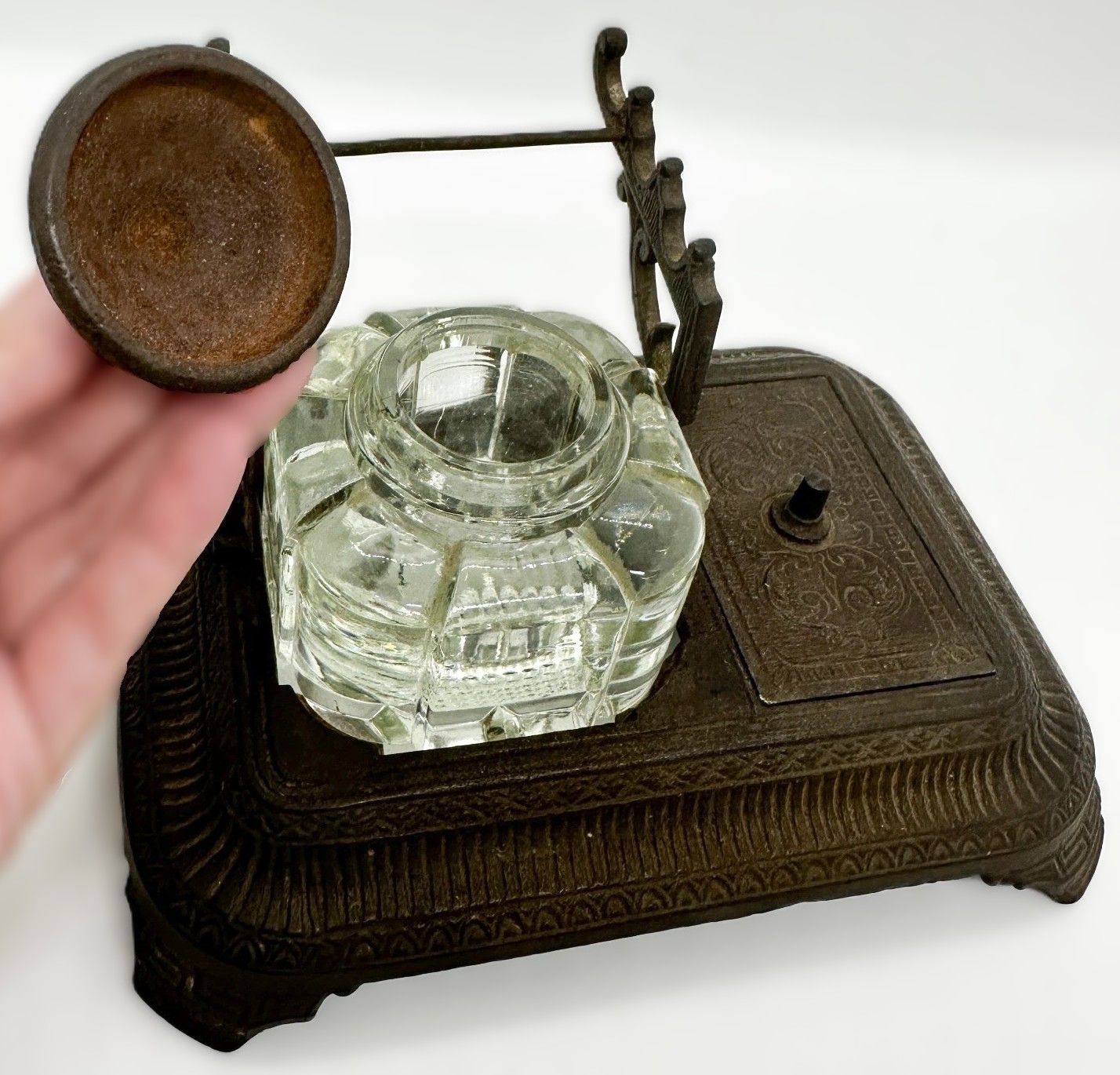- Matchbox and Striker: A distinctive feature is the incorporated matchbox on the right side of the stand. It has a loose, rectangular lid with a finial that matches the one on the inkwell lid. When this lid is picked up and turned over, the underside reveals a ribbed or grooved surface, which was used as a striking plate for early matches.