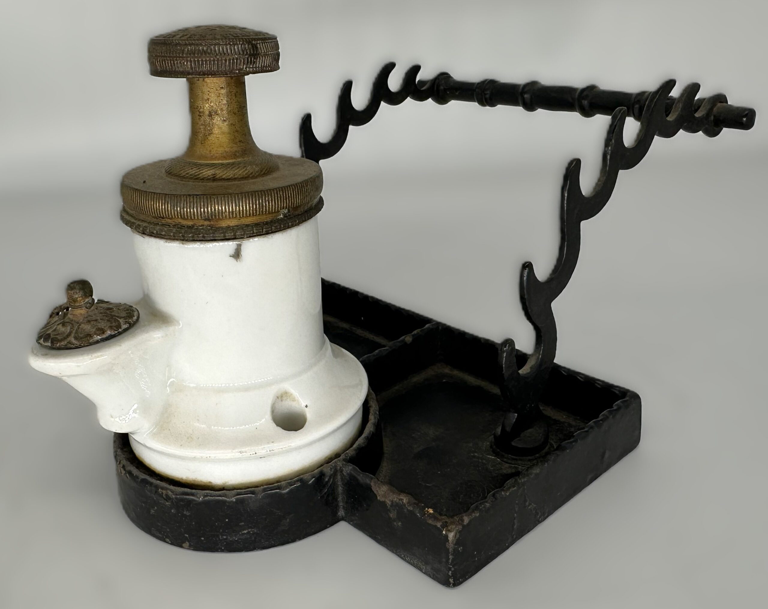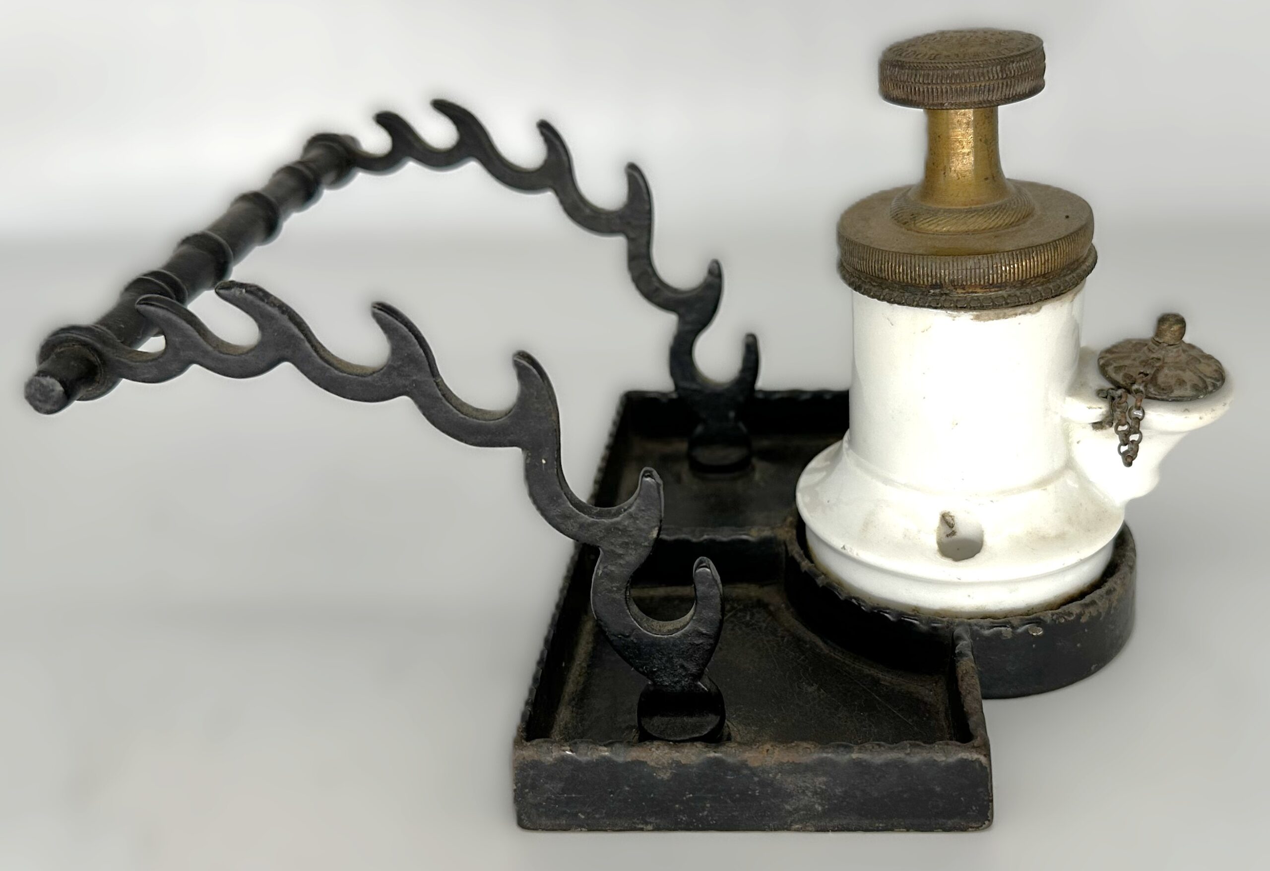 - Pen Rack: The inkwell is integrated into a heavy cast iron base that serves as a tray. Rising from the base is a dual-sided pen rack with five scalloped notches, designed to hold multiple dip pens or desk tools horizontally.