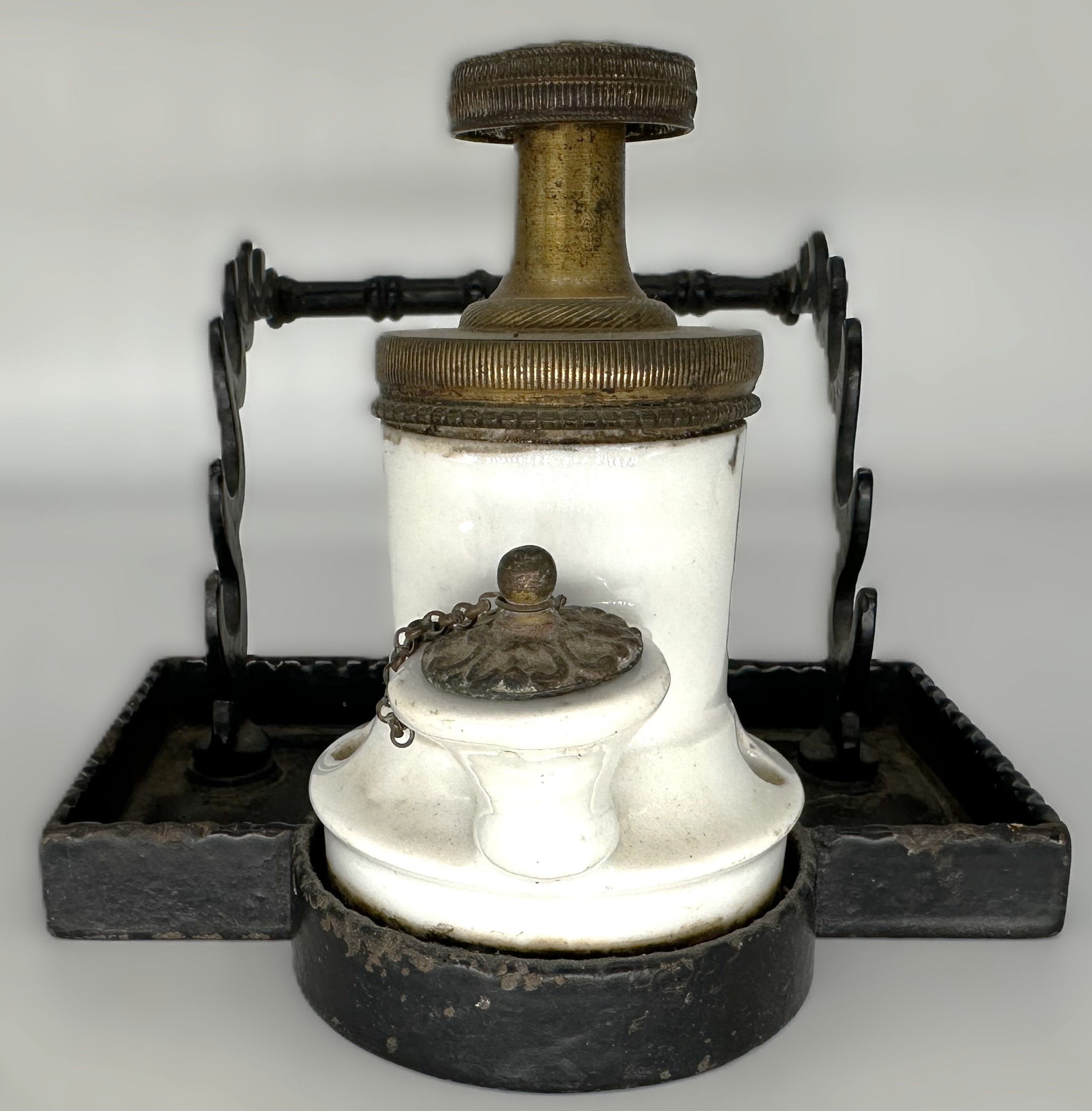 - Inkwell: The central reservoir is a white porcelain cylinder. A small porcelain dipping font is located at the front, covered with a bronze metal lid attached to the inkwell with a small chain.