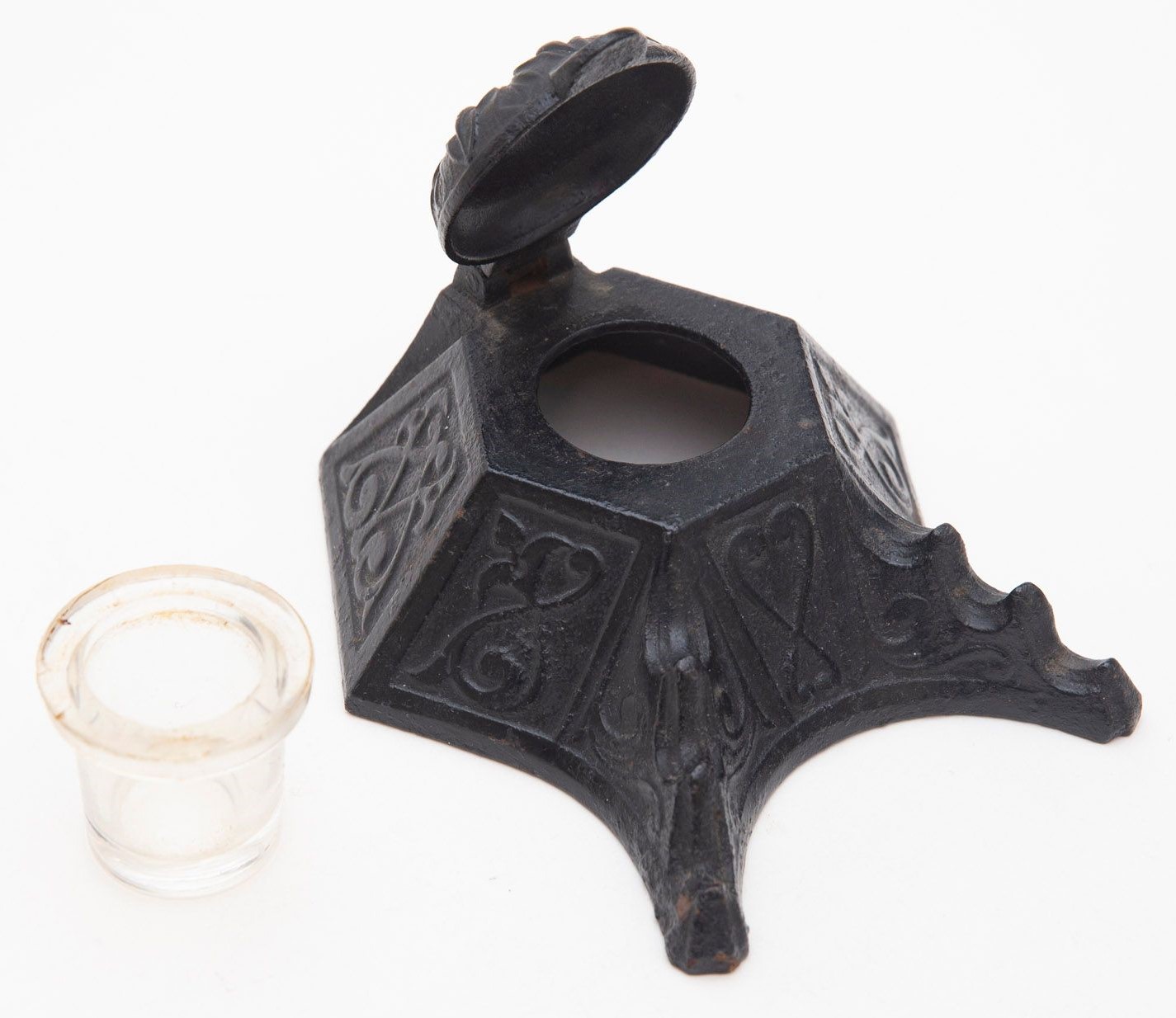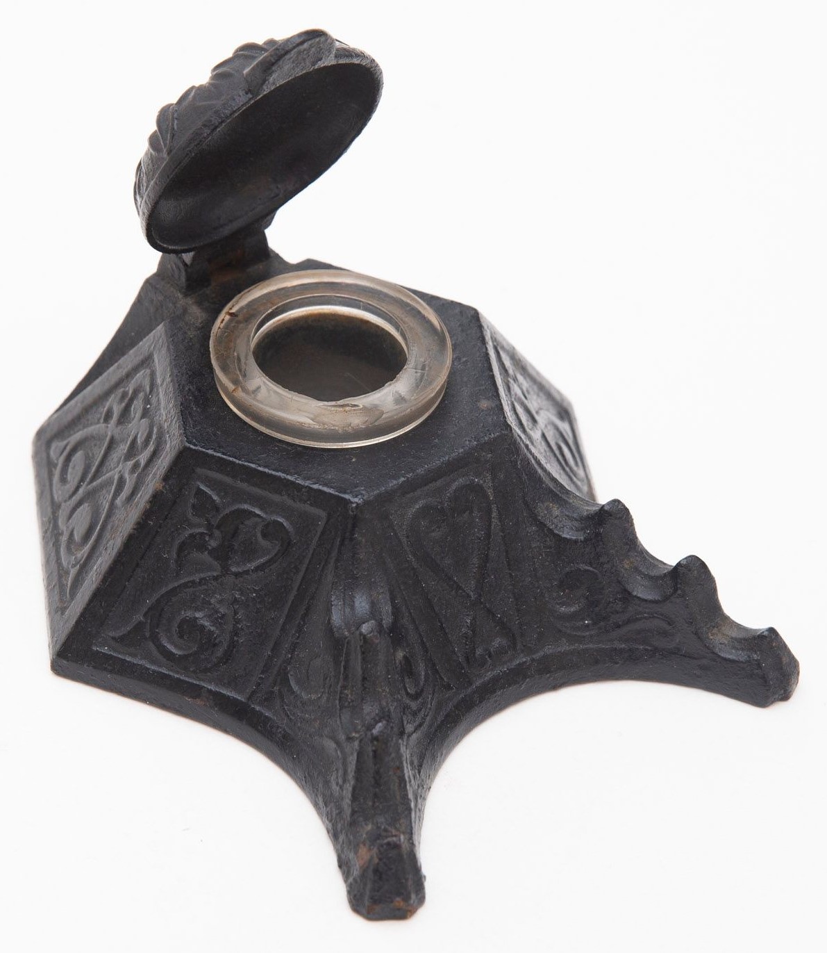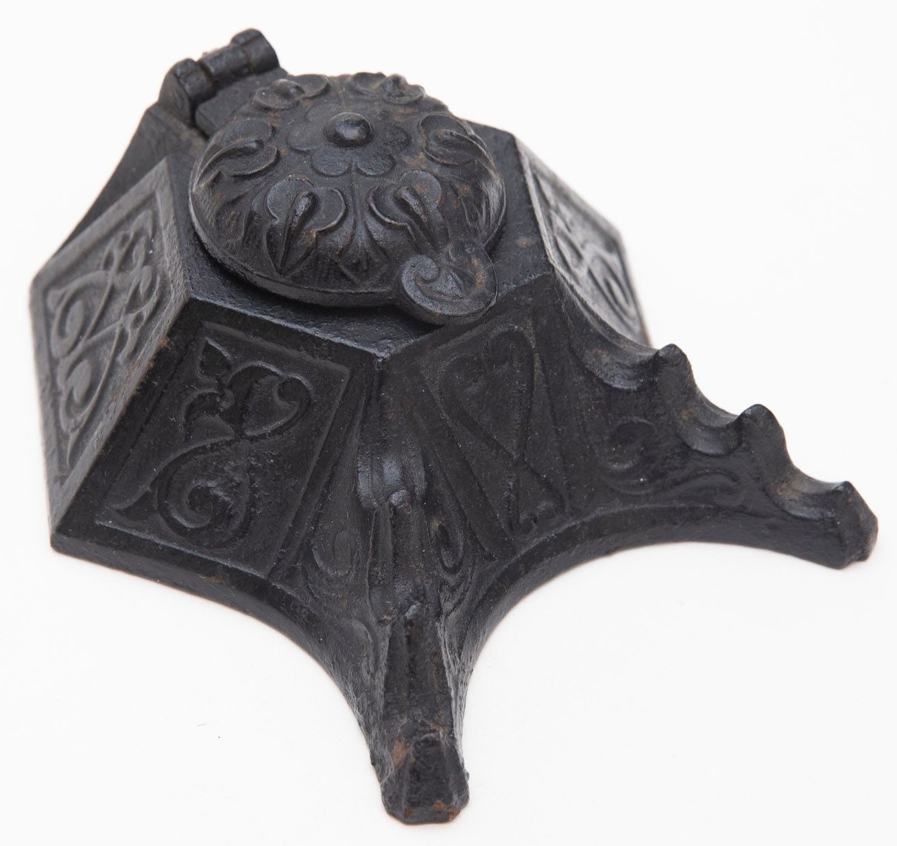 Cast iron inkwell, hexagonal in shape, decorated with a repeating pattern of hearts and scrolls. The hinged lid has a floral design. The pen holder accommodates three pens.