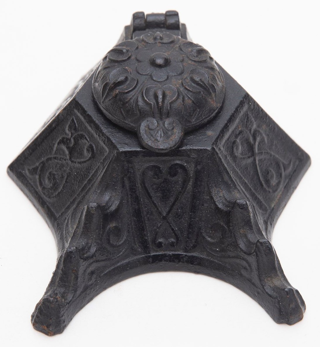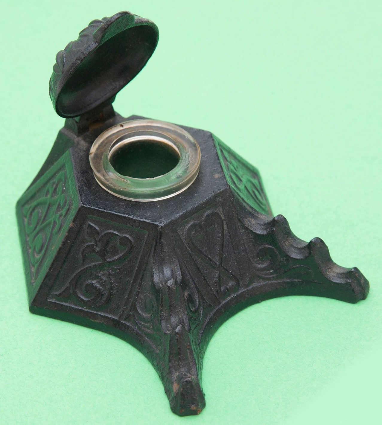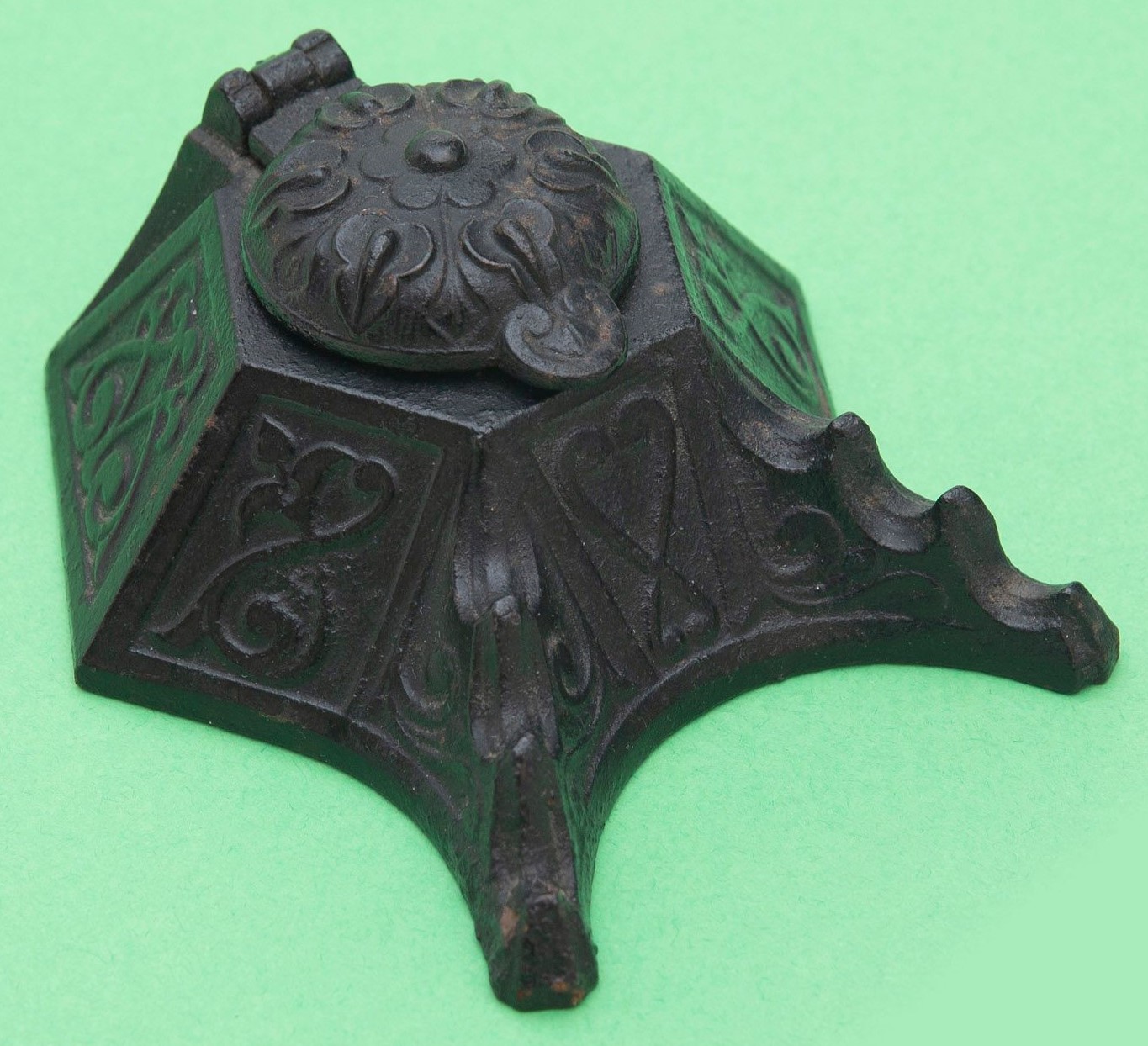 Cast iron inkwell, hexagonal in shape, decorated with a repeating pattern of hearts and scrolls. The hinged lid has a floral design. The pen holder accommodates three pens.