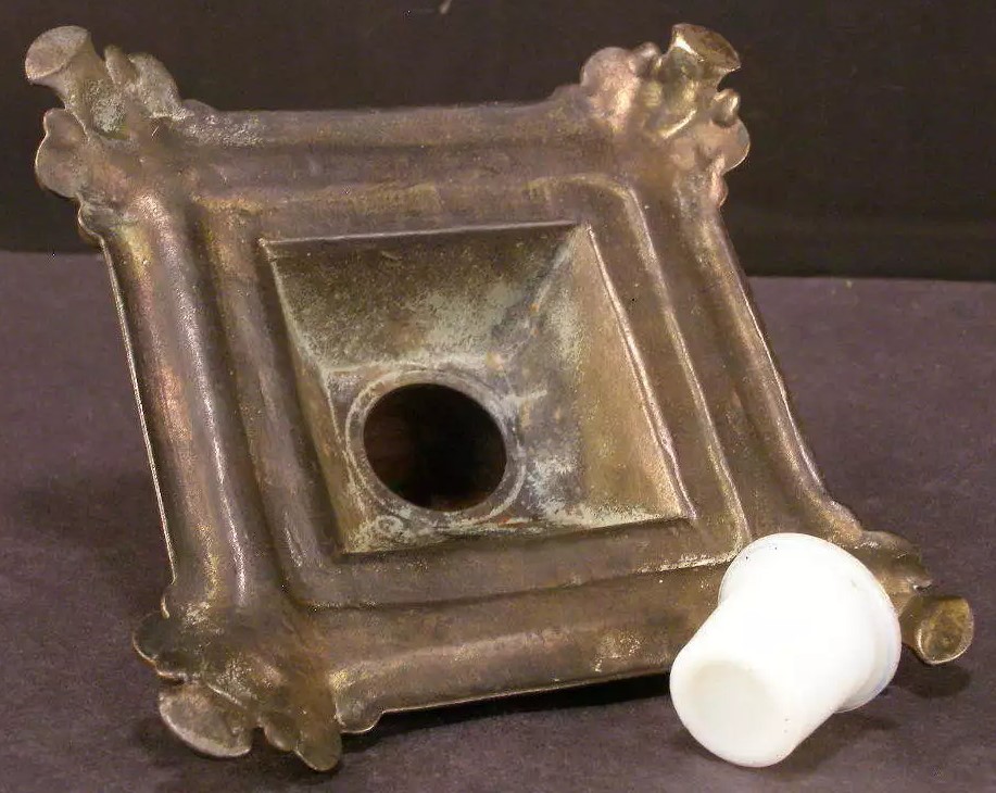 This cast-iron inkwell with a gold finish has a pyramid-like structure adorned with intricate scrollwork and floral patterns. The square base features four decorative feet, each with a stylized, almost mythical face. The lid is hinged and opens to access a white glass insert.