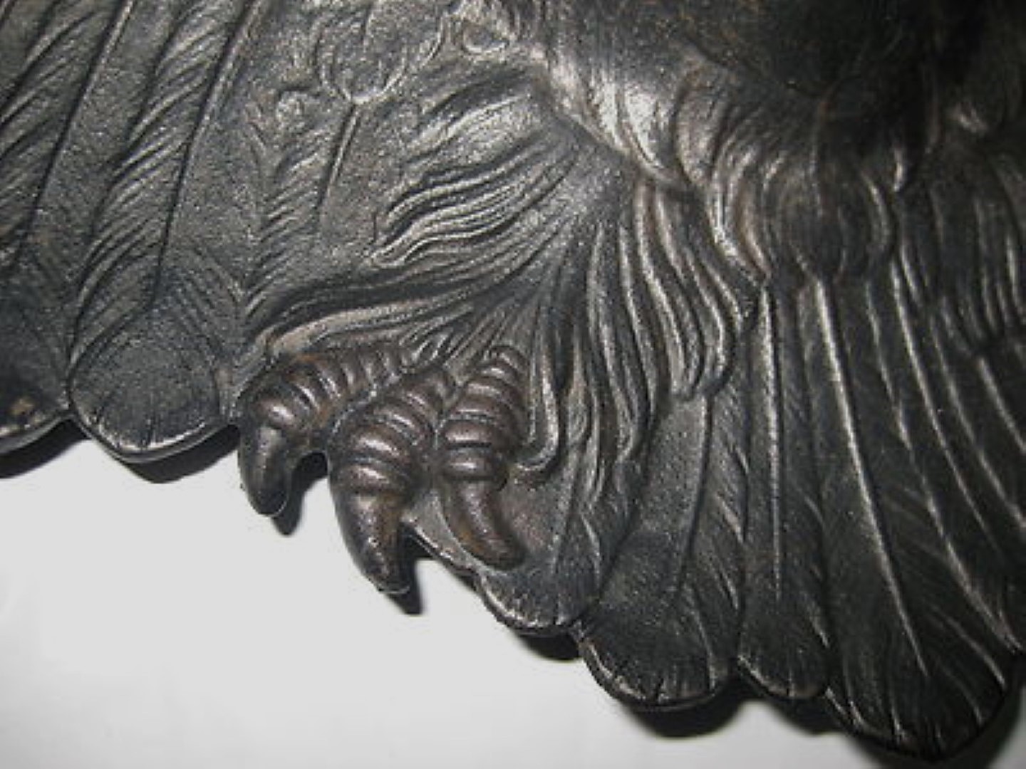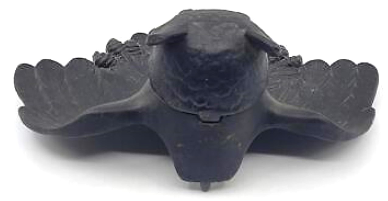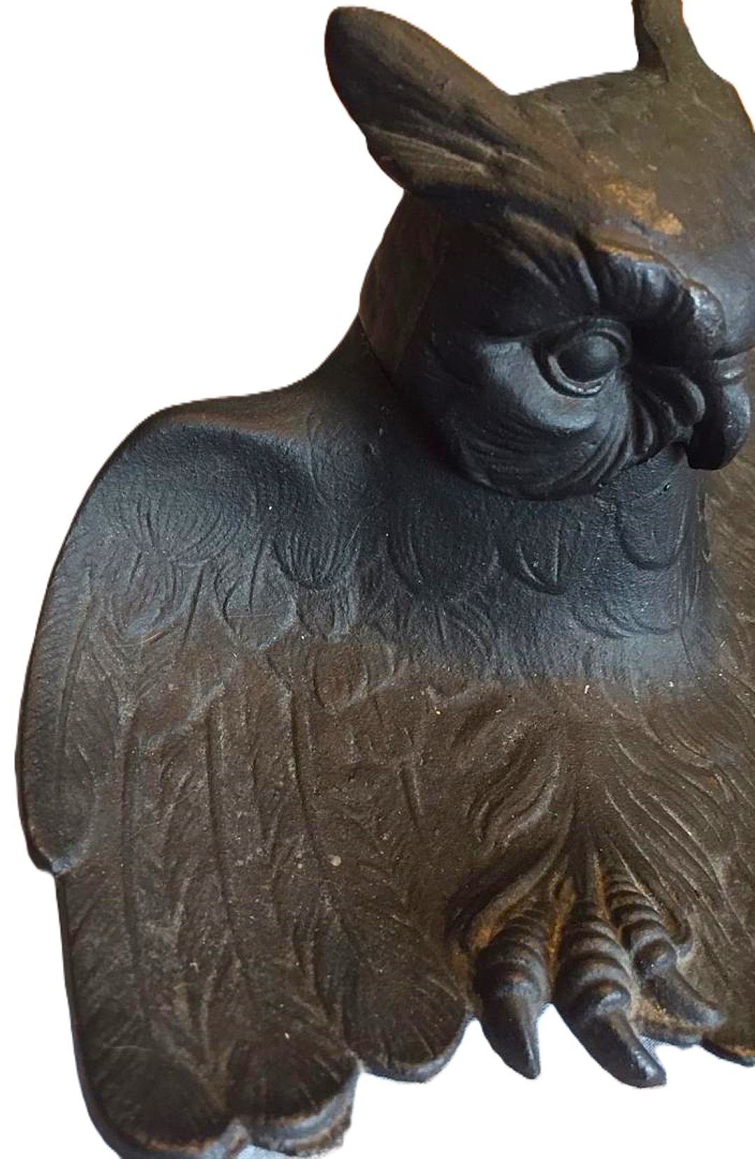 This cast iron owl’s wings spread out to form a pen tray, and the removable head (made with no hinge) reveals the metal inkwell insert (original to the piece). The markings “Iron Art” and “JM 146” are impressed on the underside.