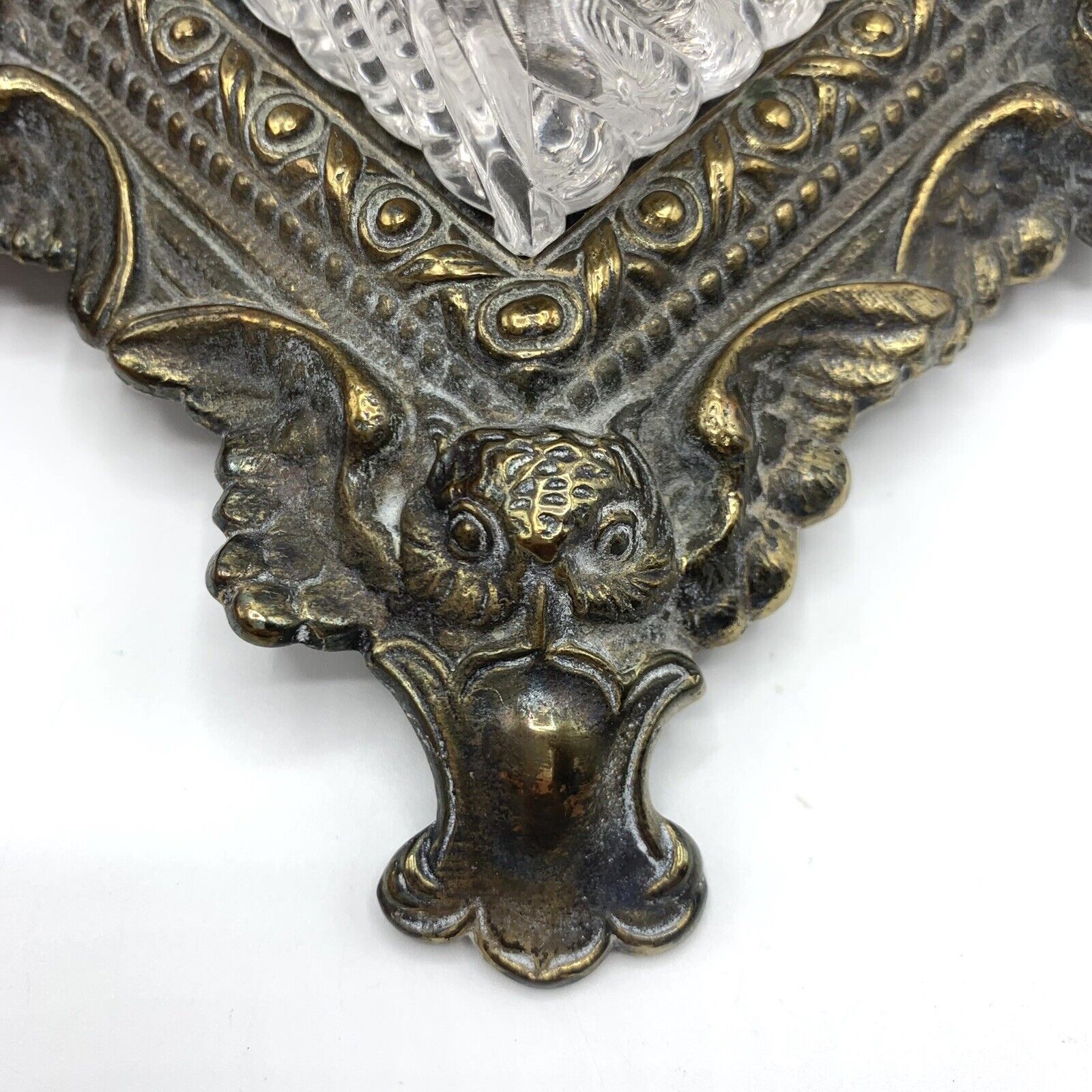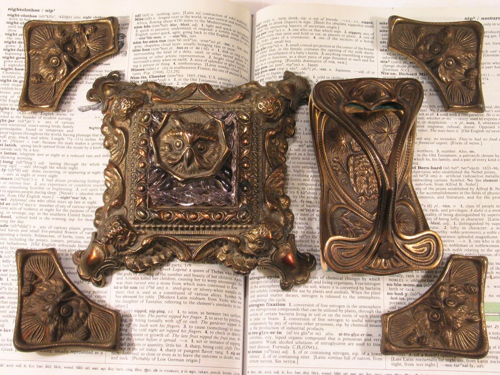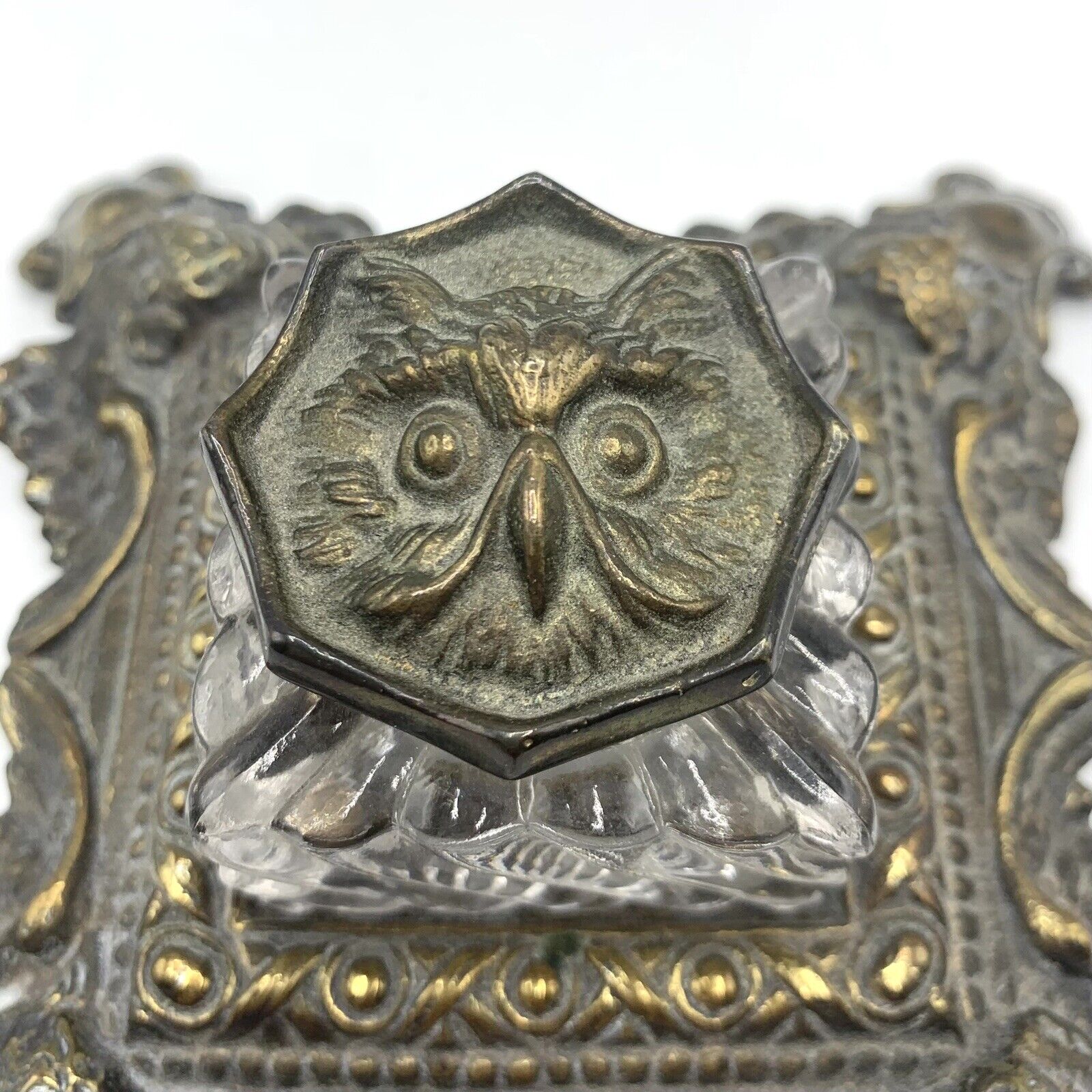 This brass plated cast iron inkstand, made by H.L. Judd Manufacturing Co. of Connecticut, features an owl’s face on the lid of the inkwell. The four corners of the base depict owls with wings spread.