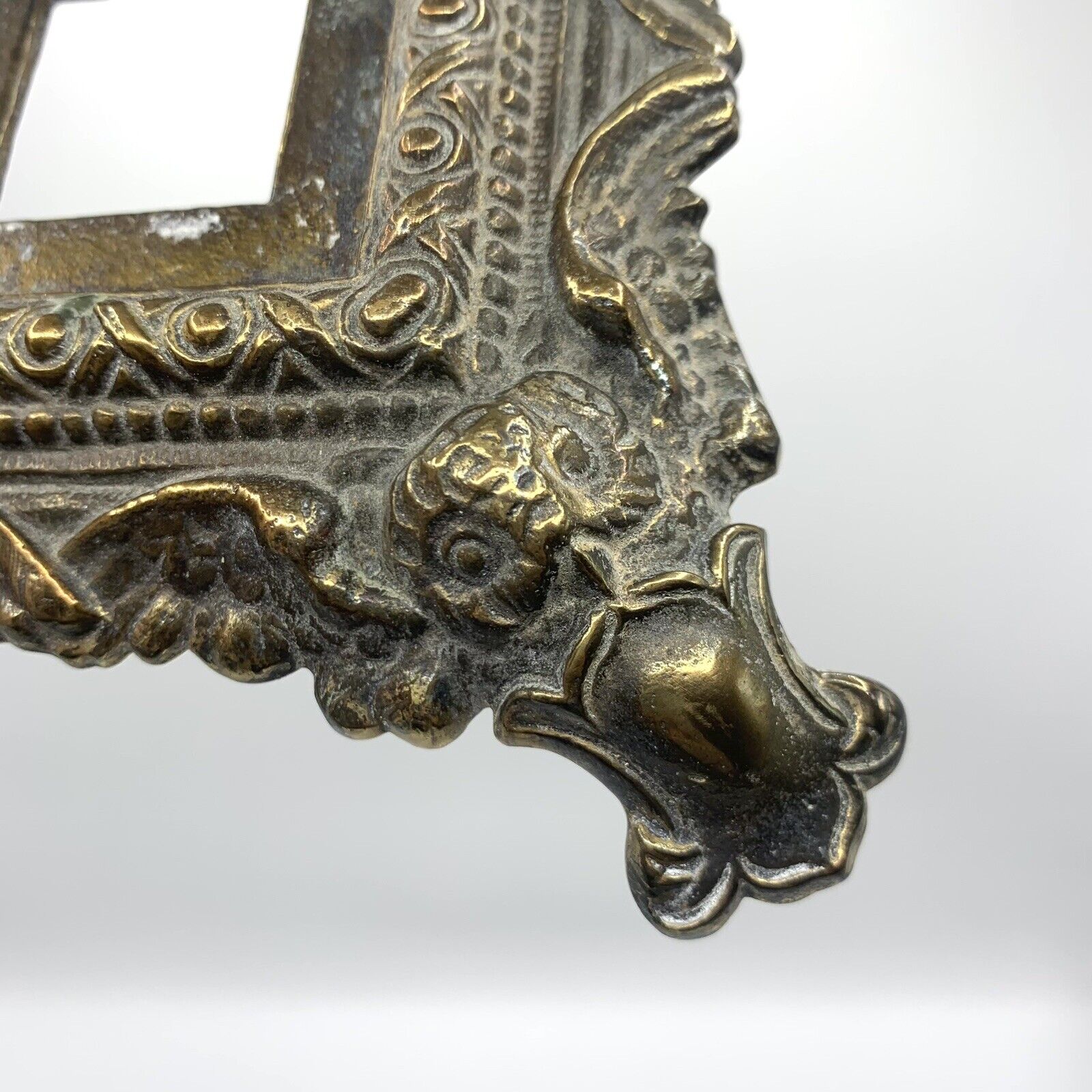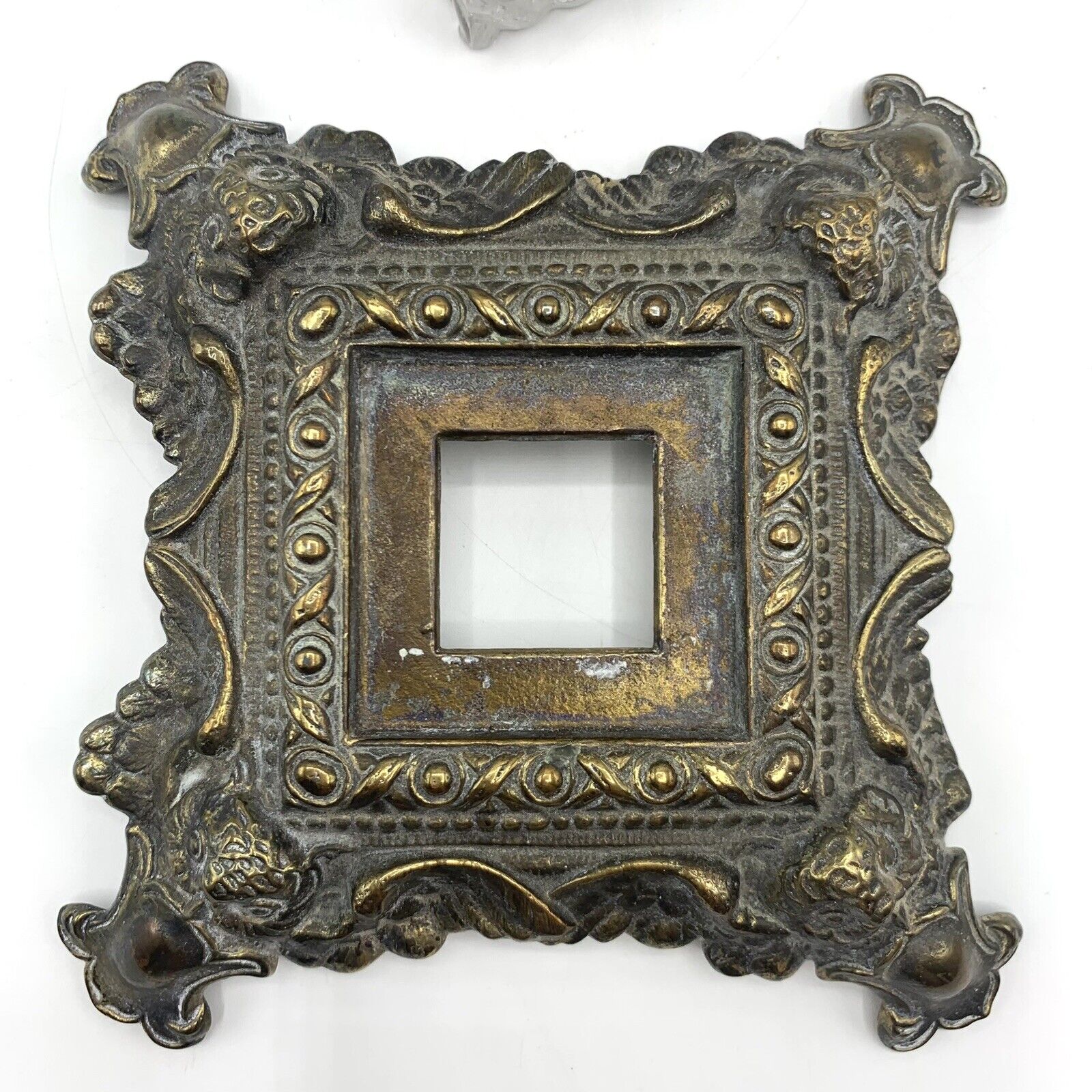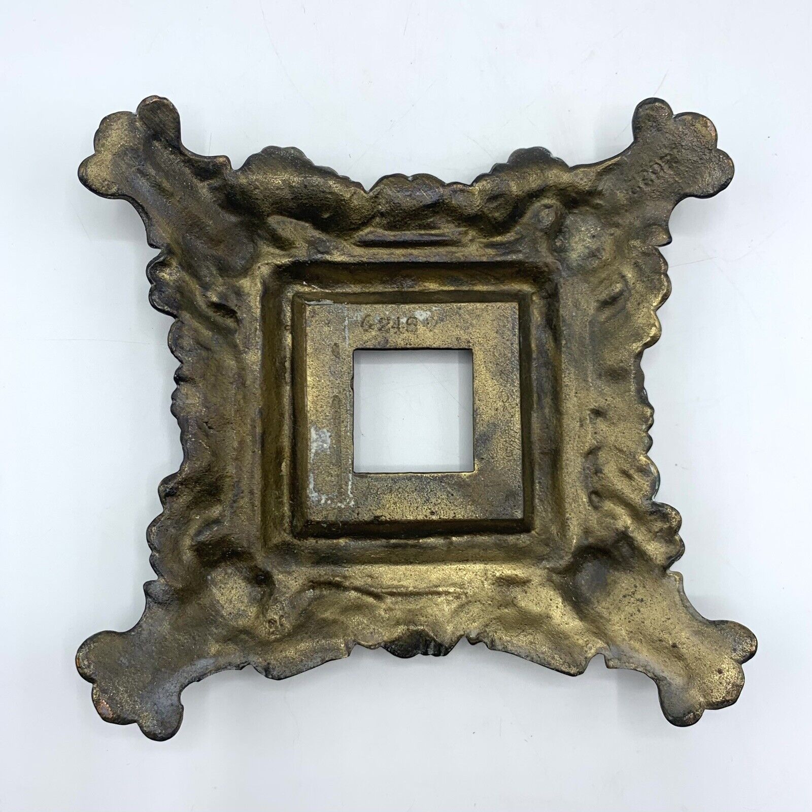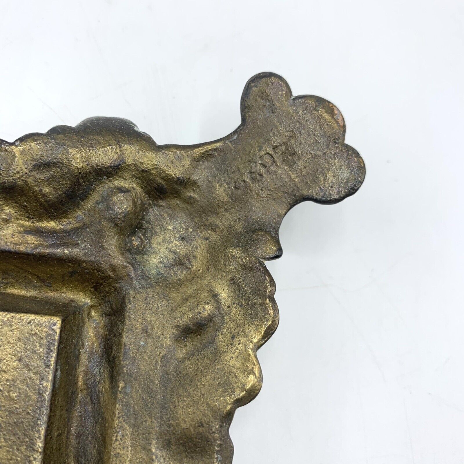This brass plated cast iron inkstand, made by H.L. Judd Manufacturing Co. of Connecticut, features an owl’s face on the lid of the inkwell. The four corners of the base depict owls with wings spread.