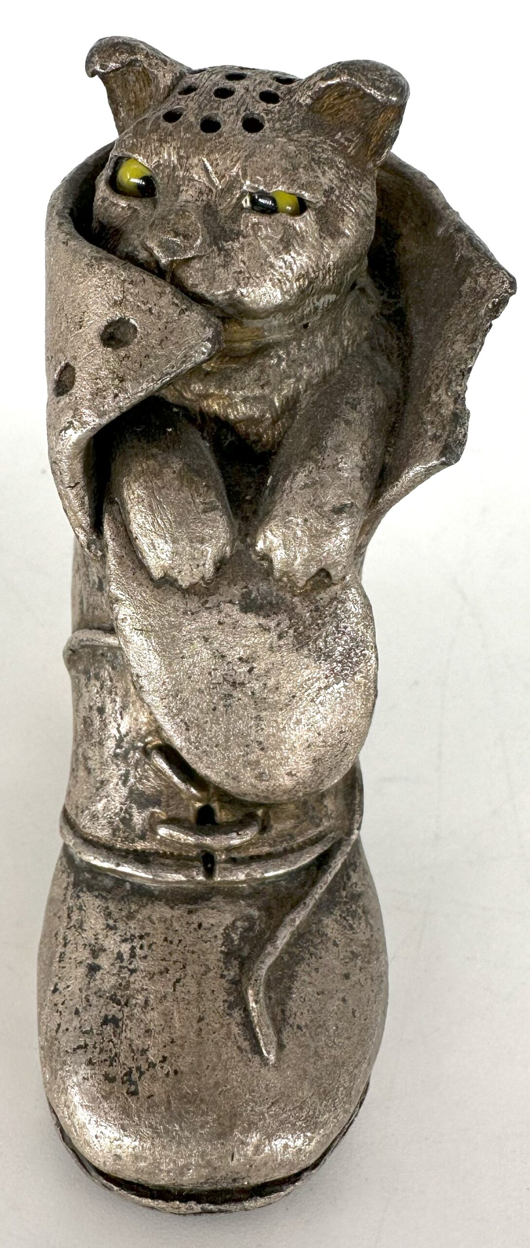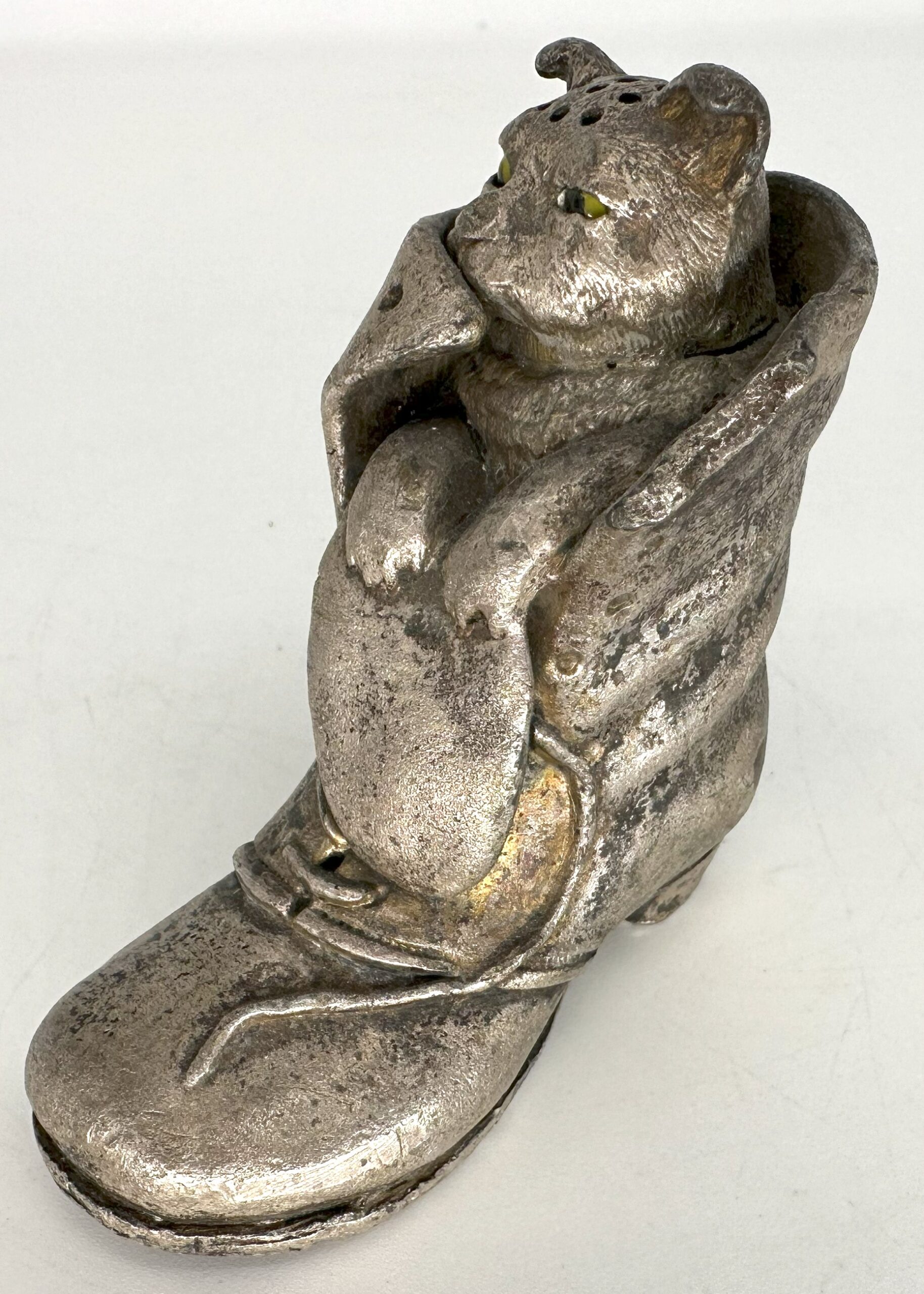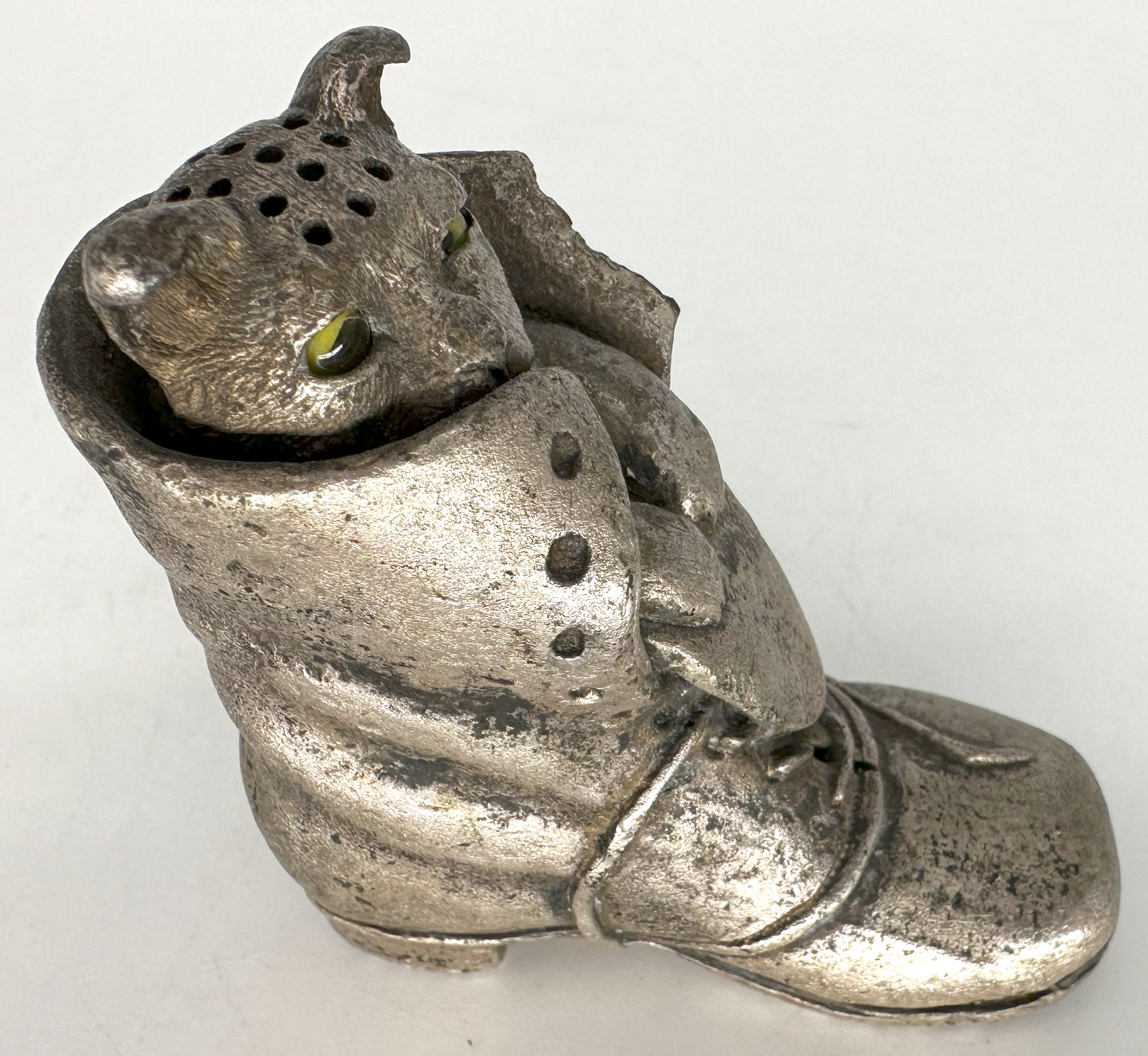 Pounce pot / ink sander in the form of a sweet cat sitting in a boot. The cat has a soft expression, glass eyes (look closely and you will see them) and has its front paws holding onto the boot. Originally silverplated, some silver is gone, but all the wonderful detail remains.
