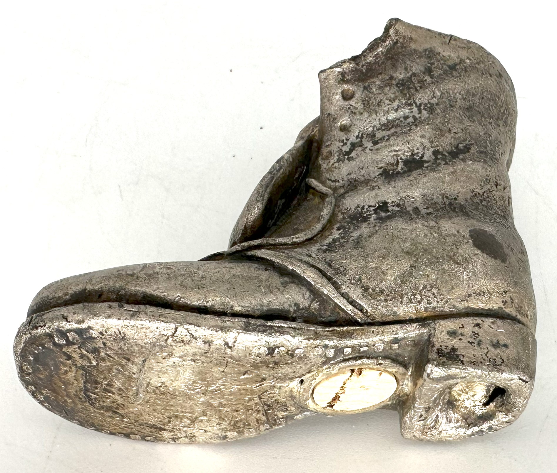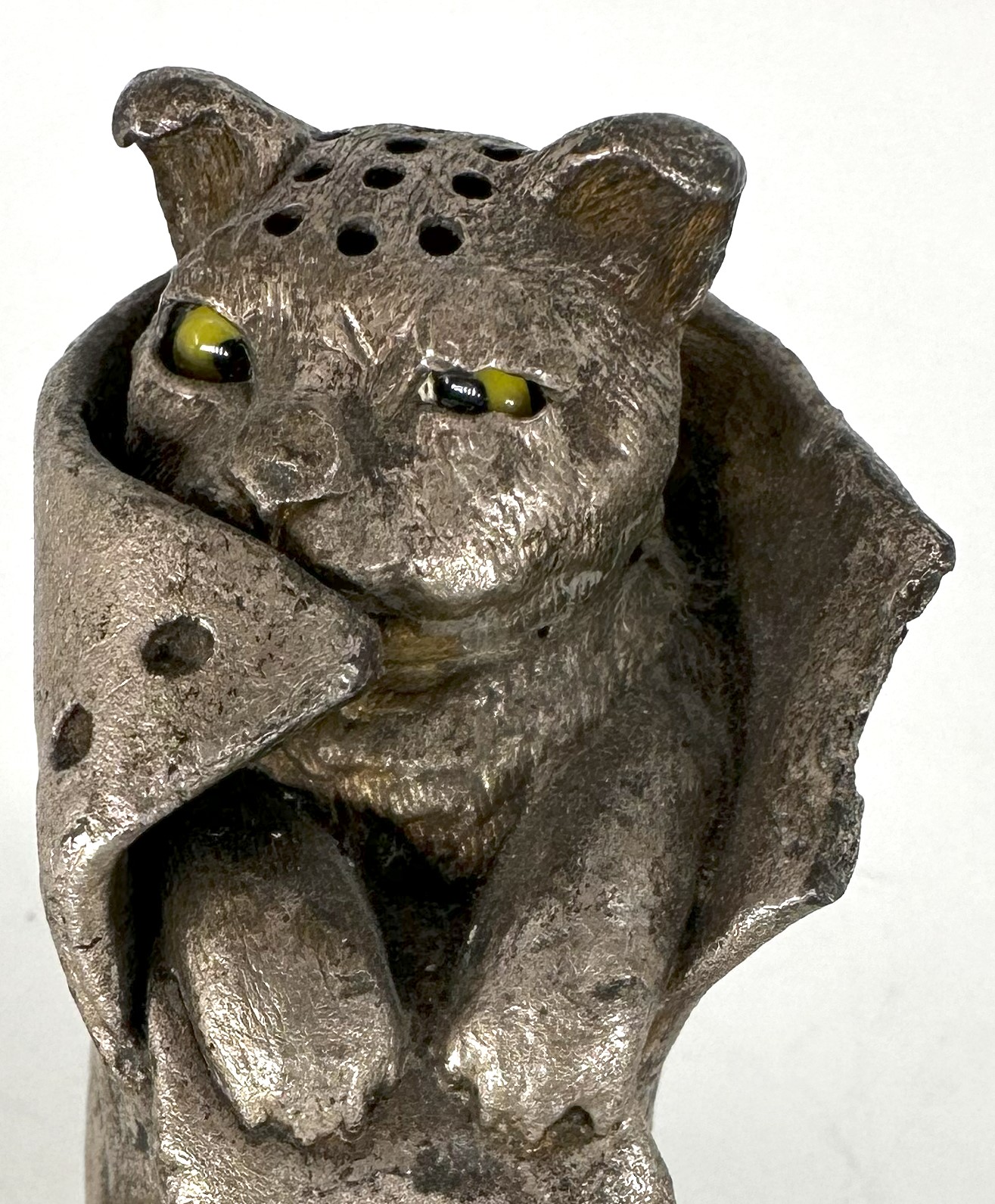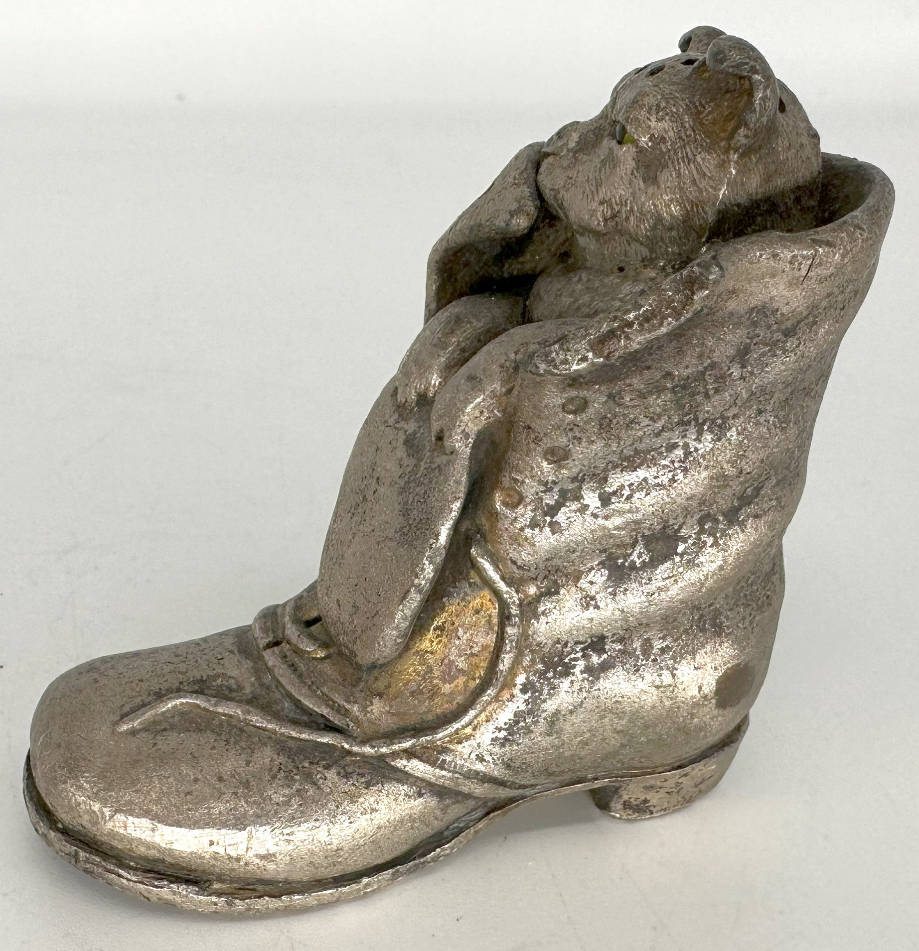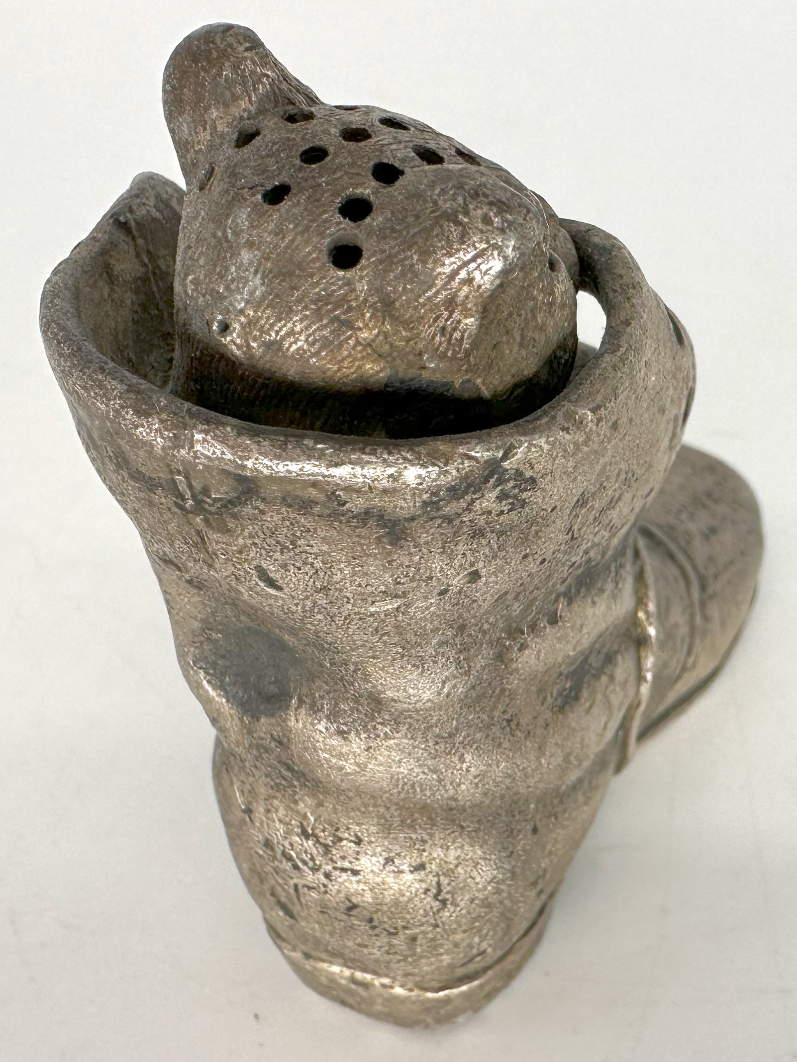 Pounce pot / ink sander in the form of a sweet cat sitting in a boot. The cat has a soft expression, glass eyes (look closely and you will see them) and has its front paws holding onto the boot. Originally silverplated, some silver is gone, but all the wonderful detail remains.