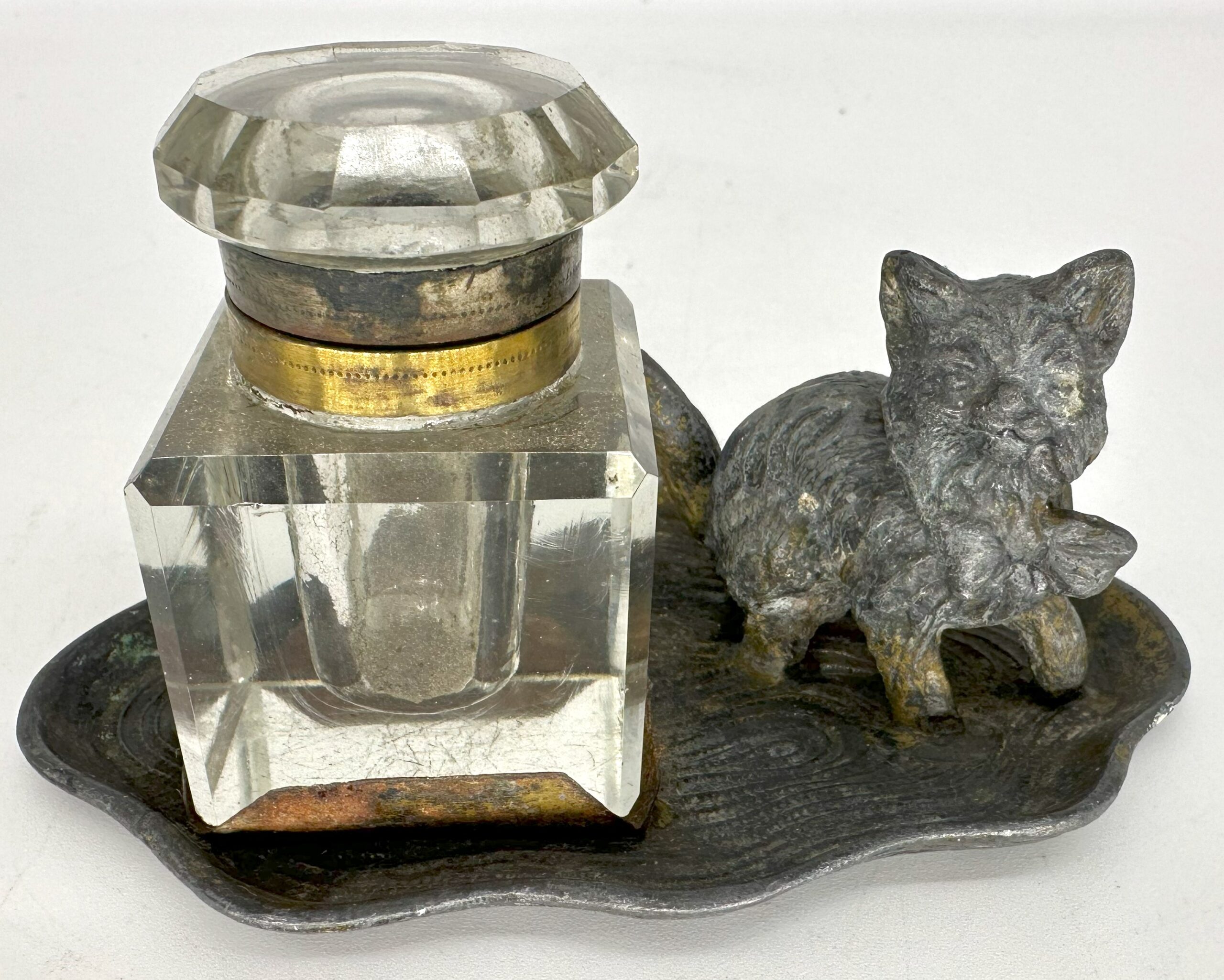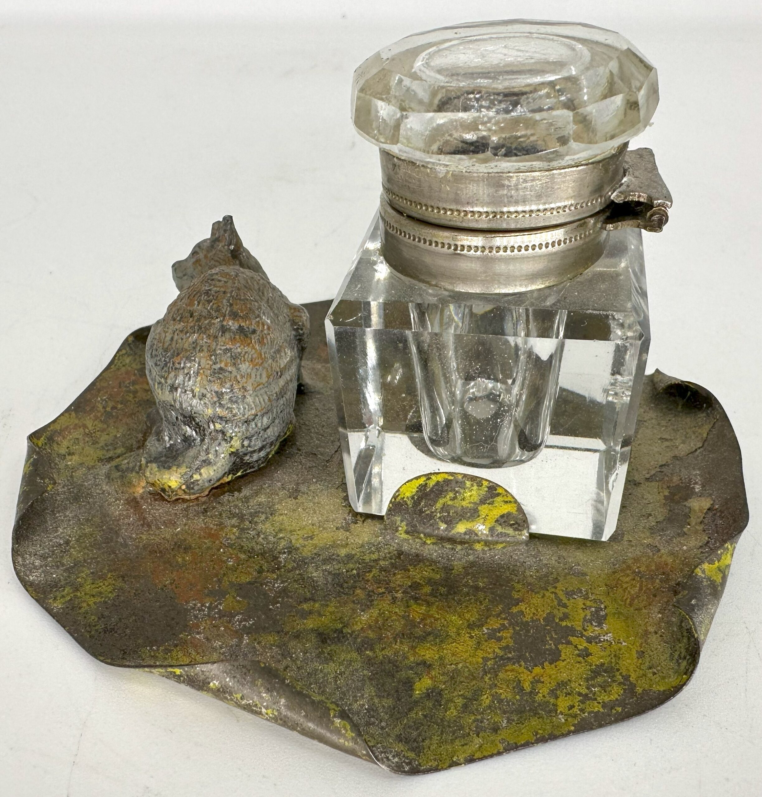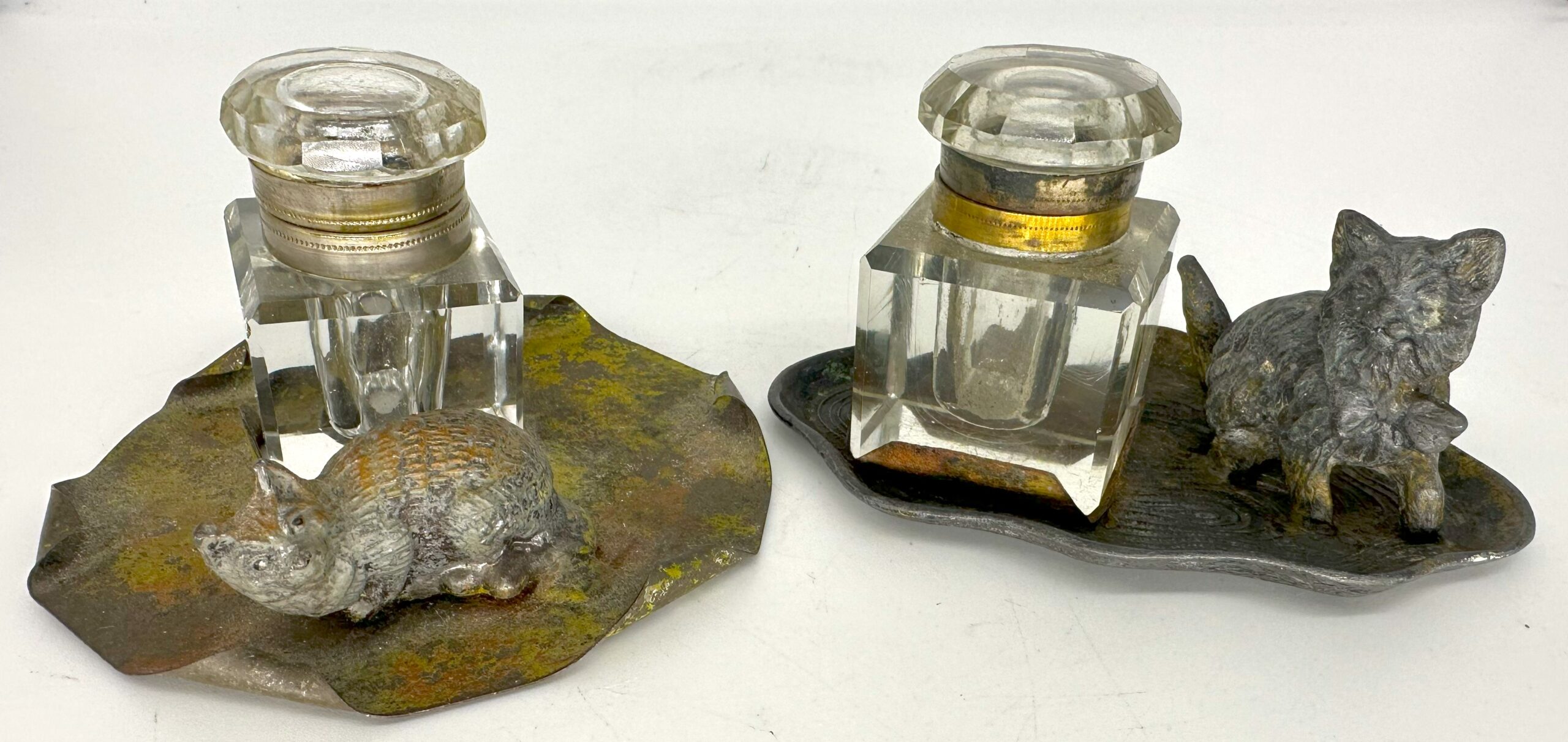 These two pieces are similar. Each cat (made from pot metal and hand-painted) is next to a glass inkwell with a hinged lid. One cat is crouched, ready to hunt. The other cat, wearing a bow around her neck, has her tail up and looks ready to explore.