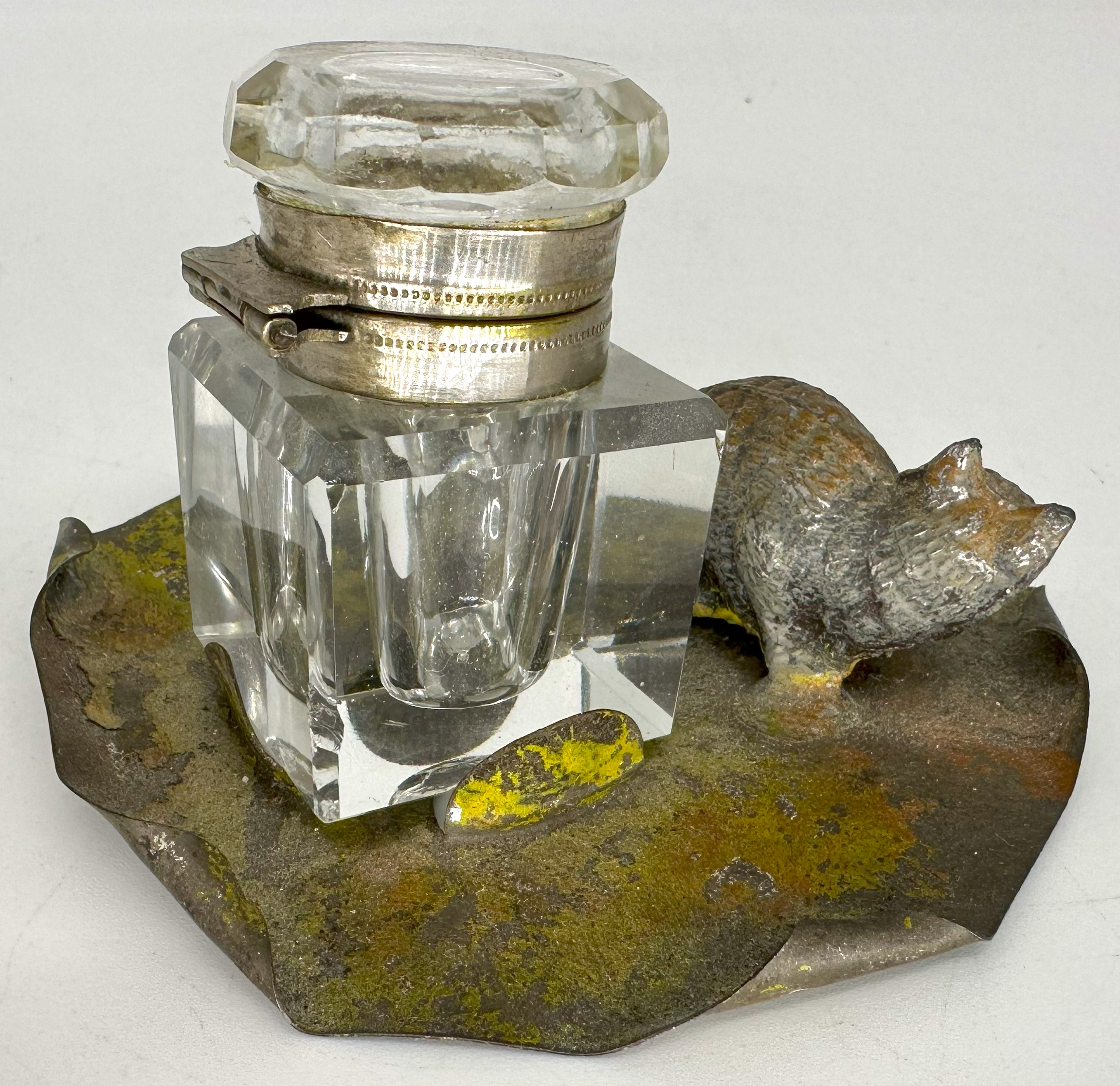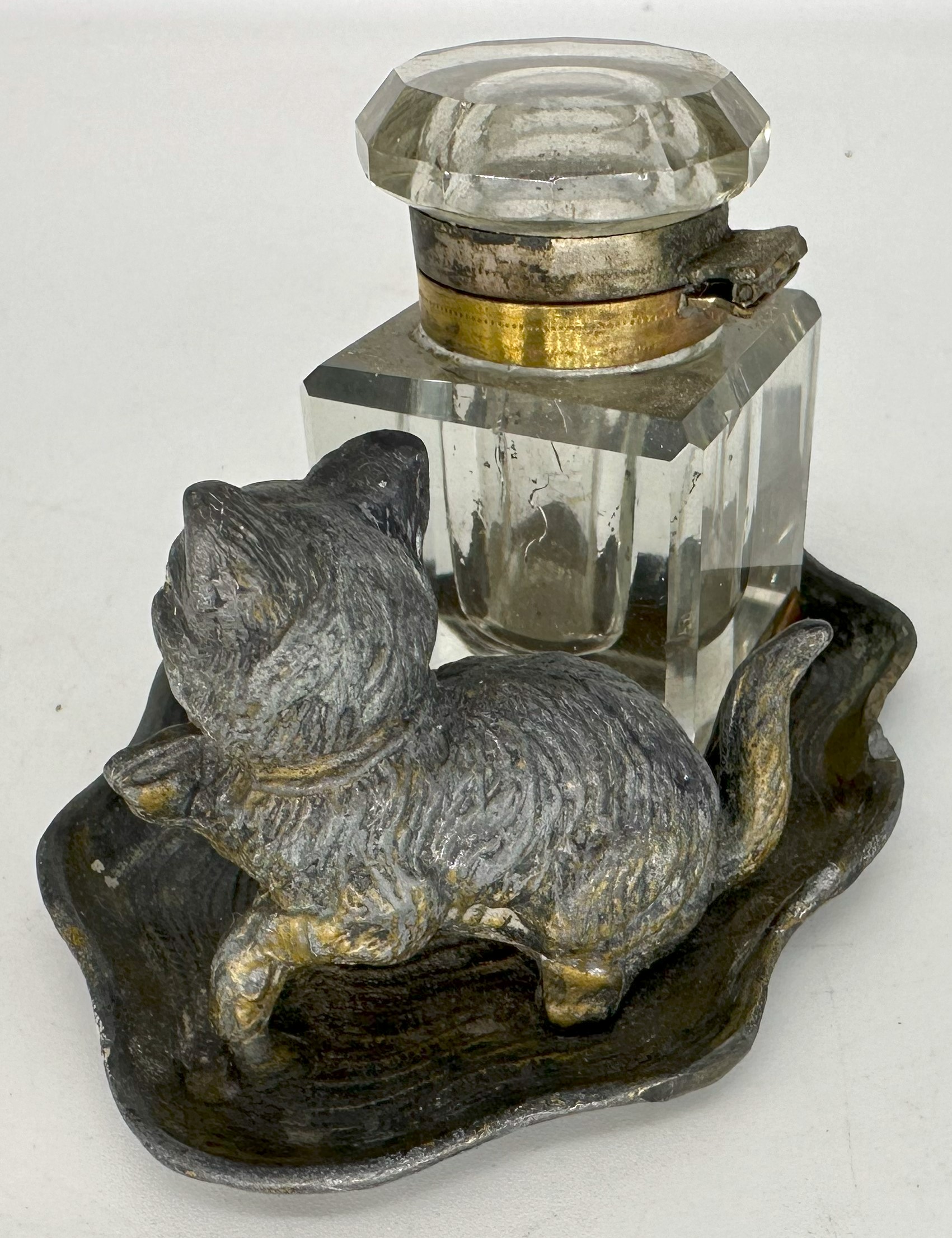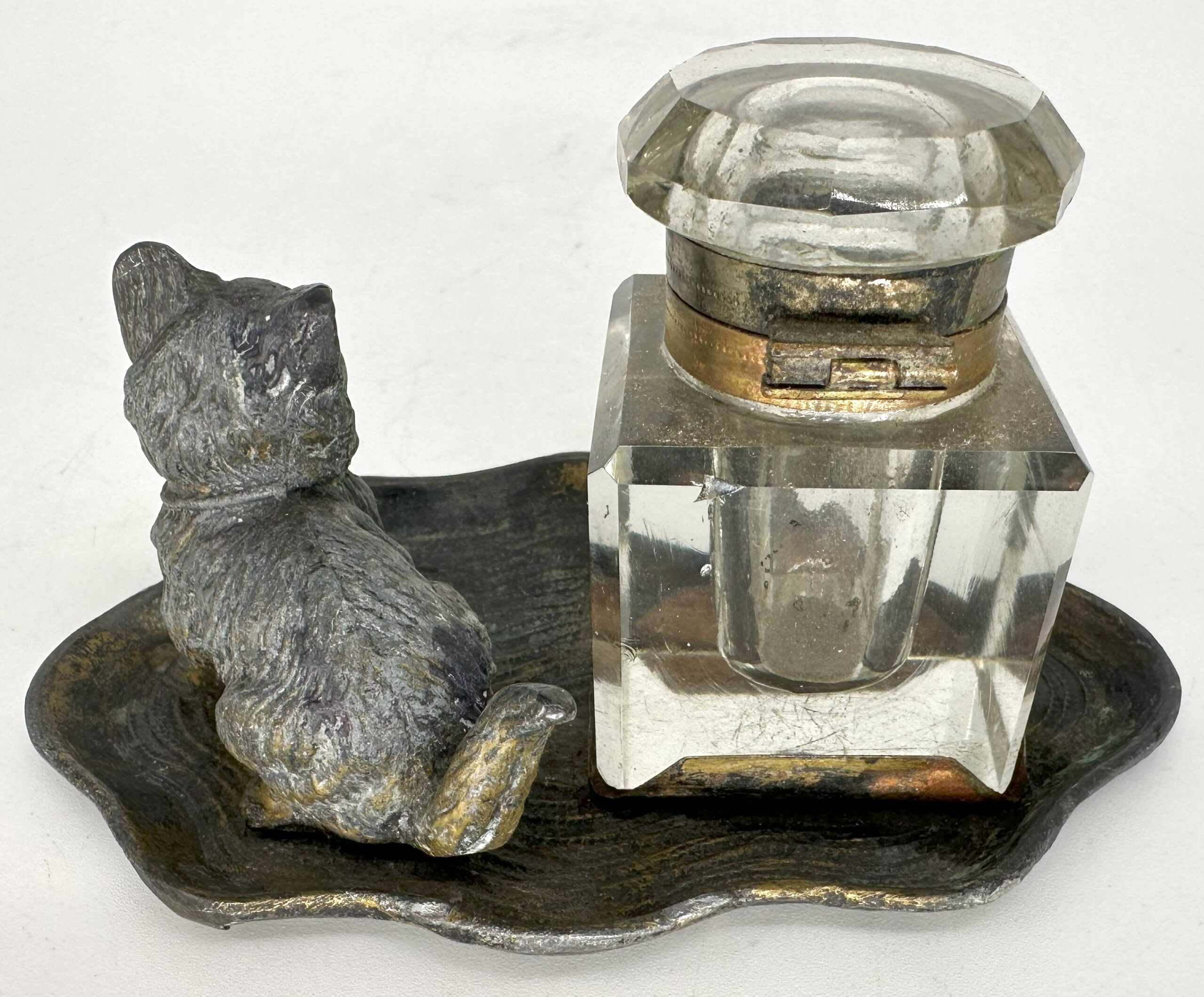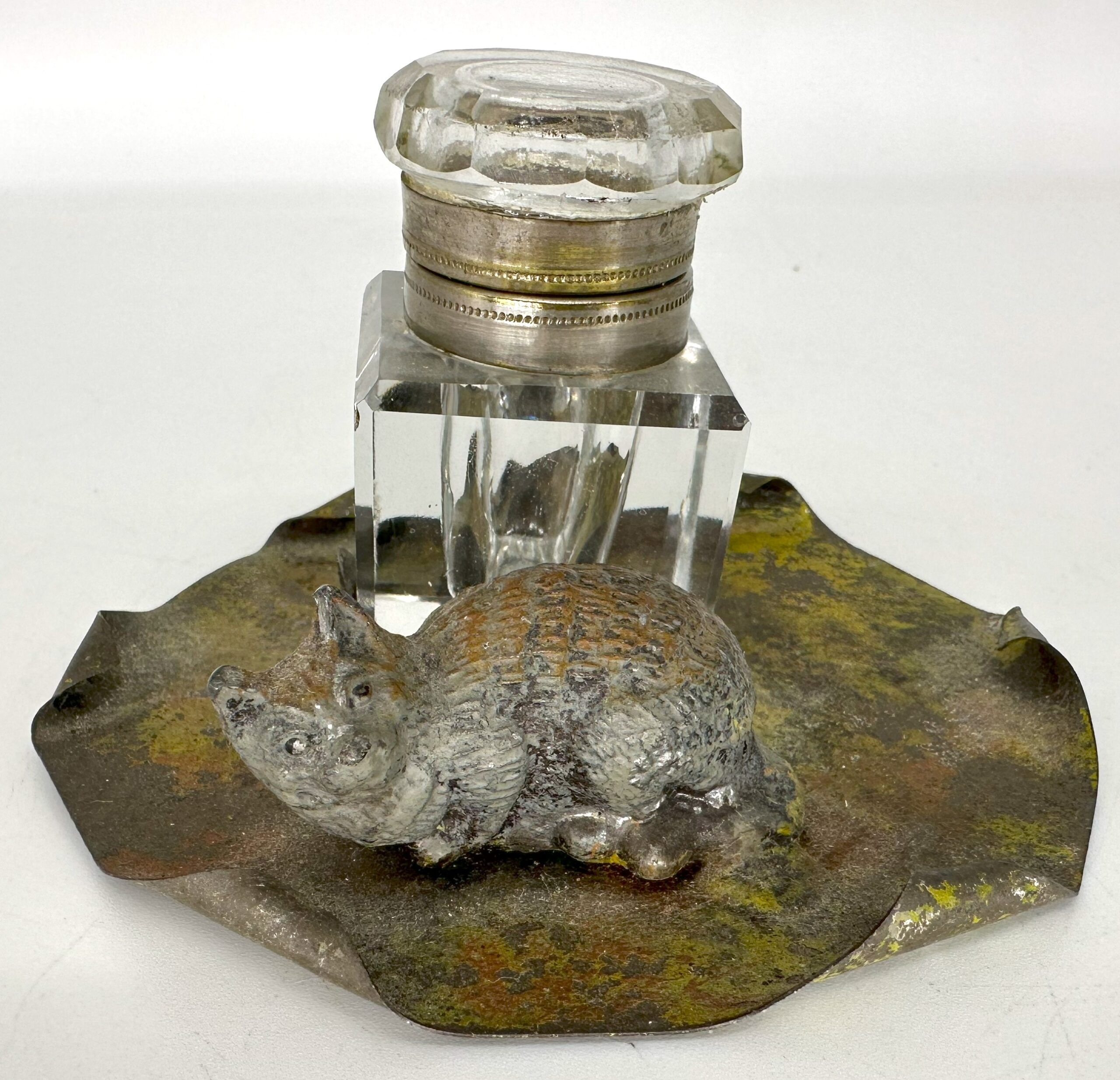 These two pieces are similar. Each cat (made from pot metal and hand-painted) is next to a glass inkwell with a hinged lid. One cat is crouched, ready to hunt. The other cat, wearing a bow around her neck, has her tail up and looks ready to explore.