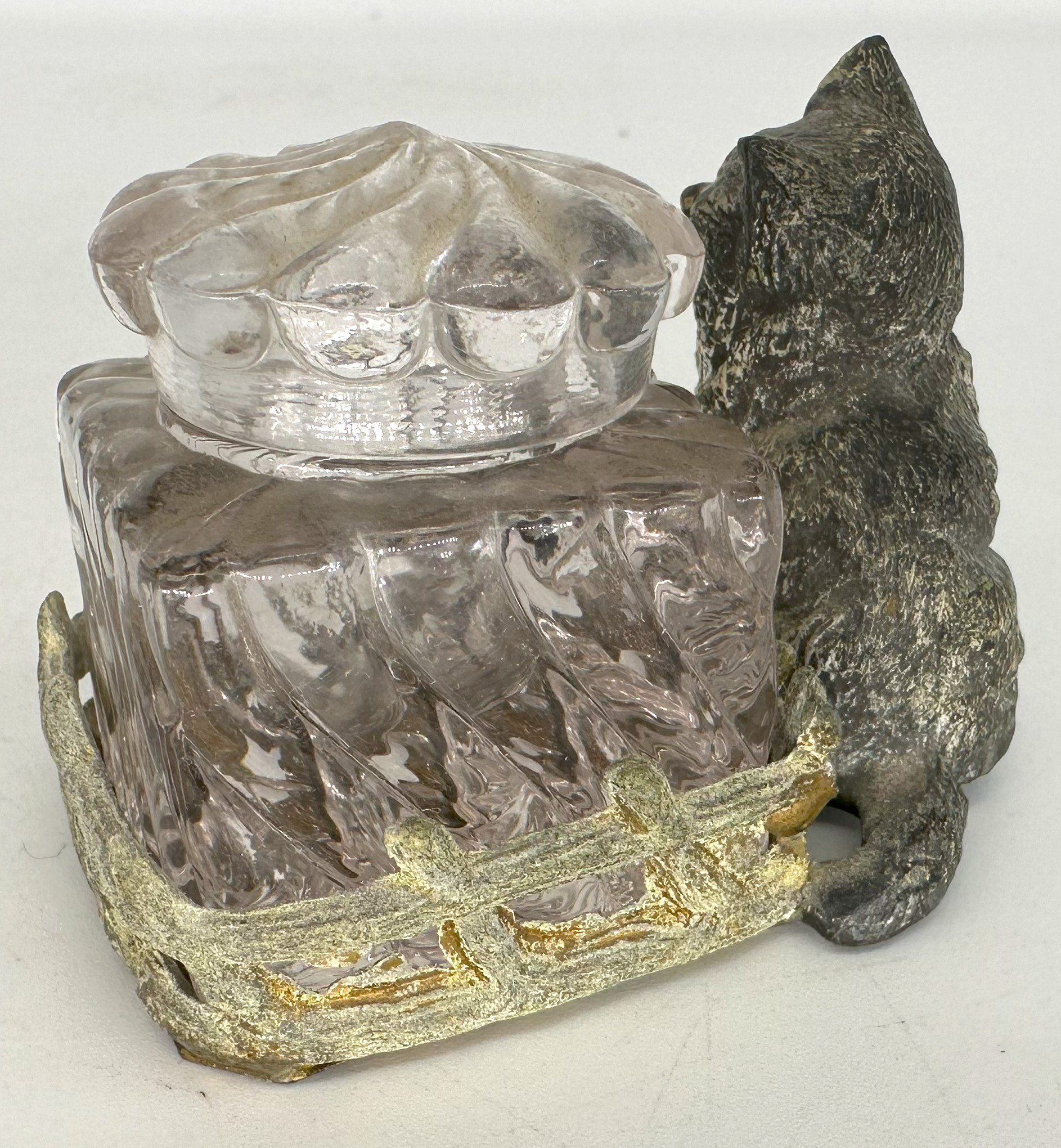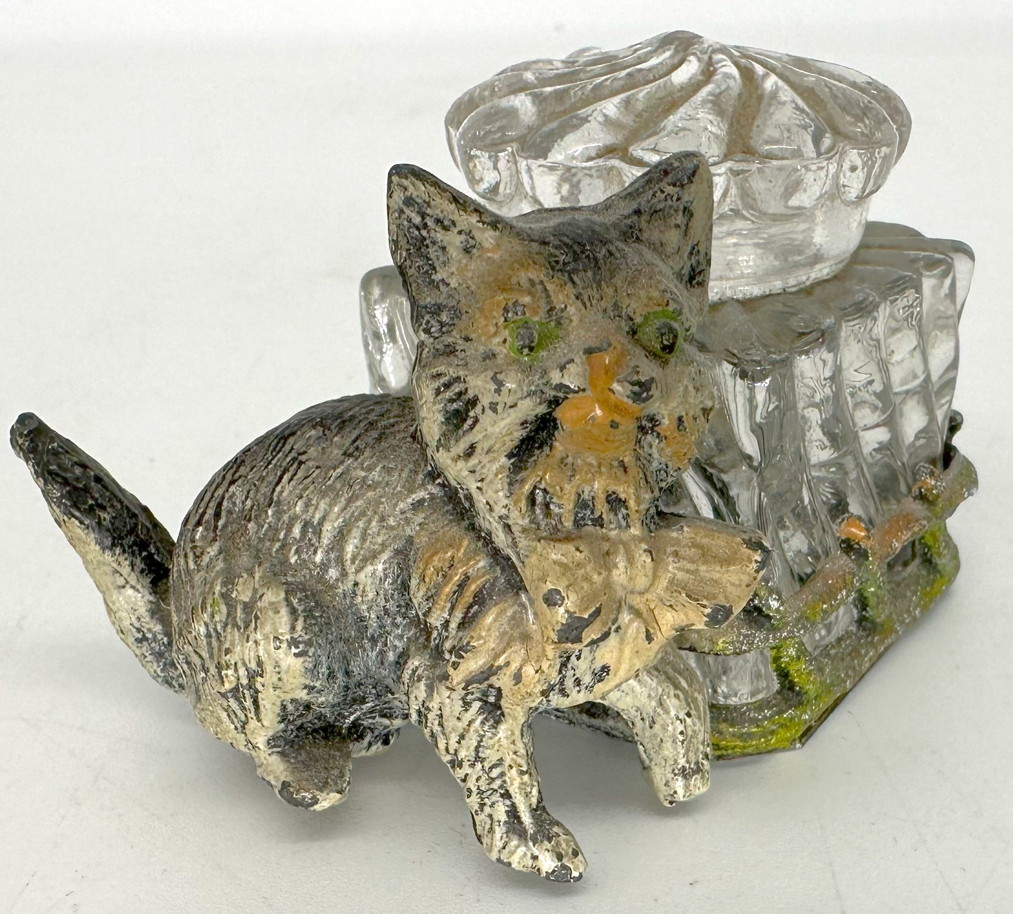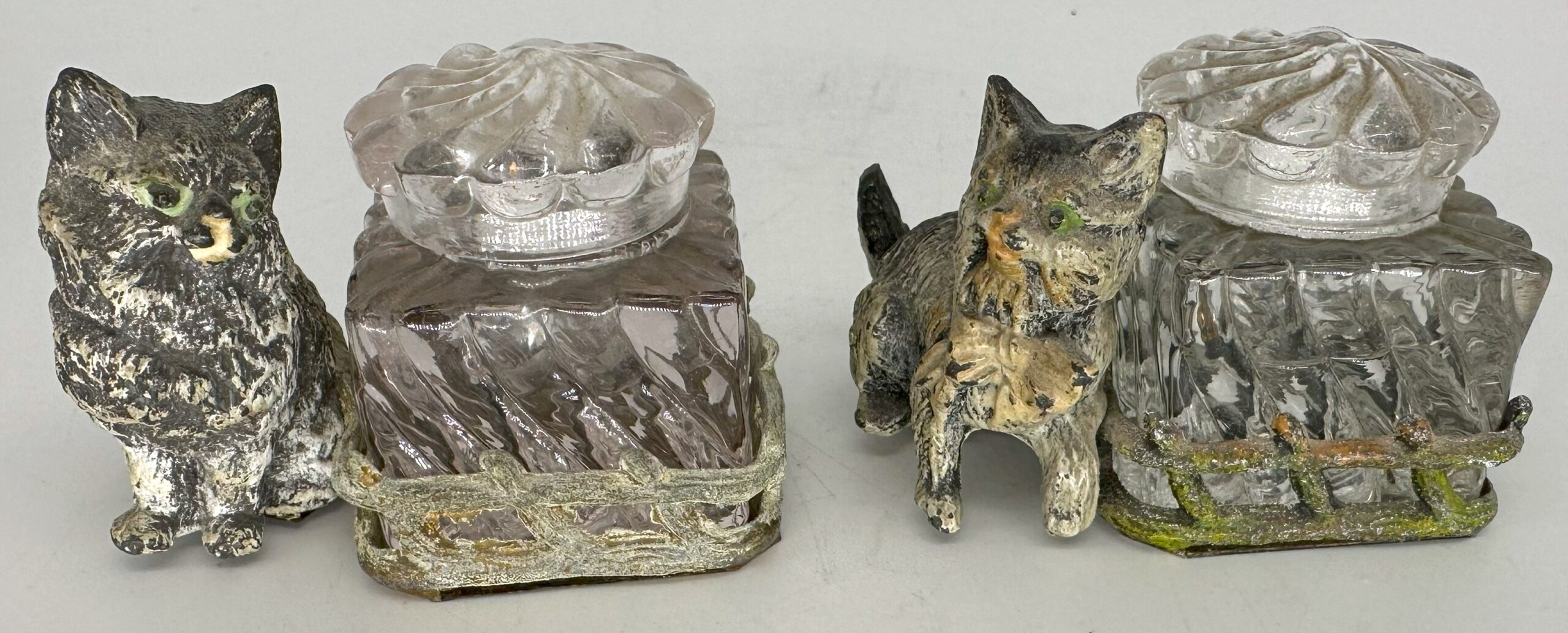 These two pieces are similar. Each cat (made from pot metal and hand-painted) is next to a swirl glass inkwell with a loose cover, fitted inside an open rail fence. One cat is sitting. The other cat, wearing a bow around her neck, has her tail up and looks ready to explore.