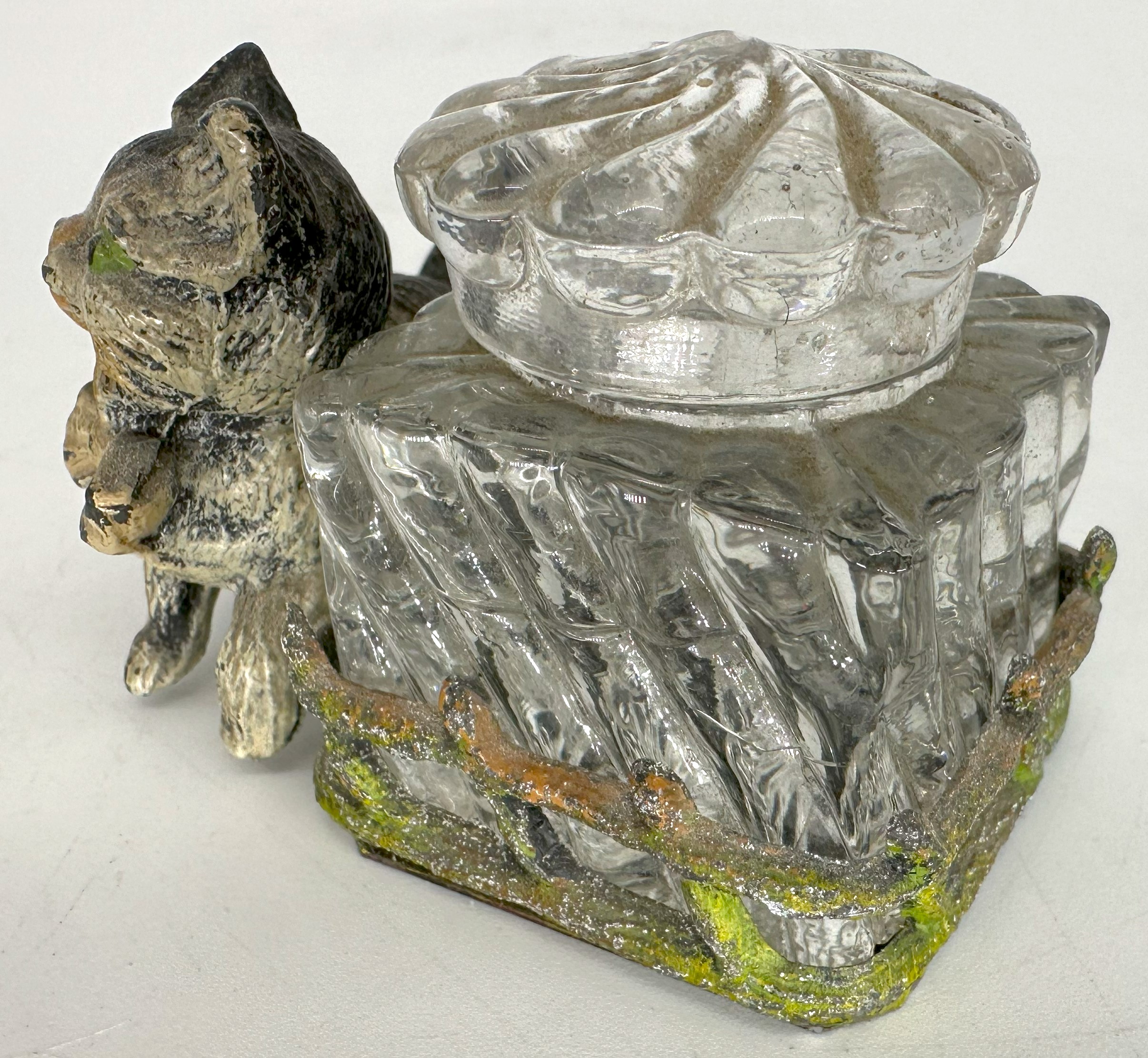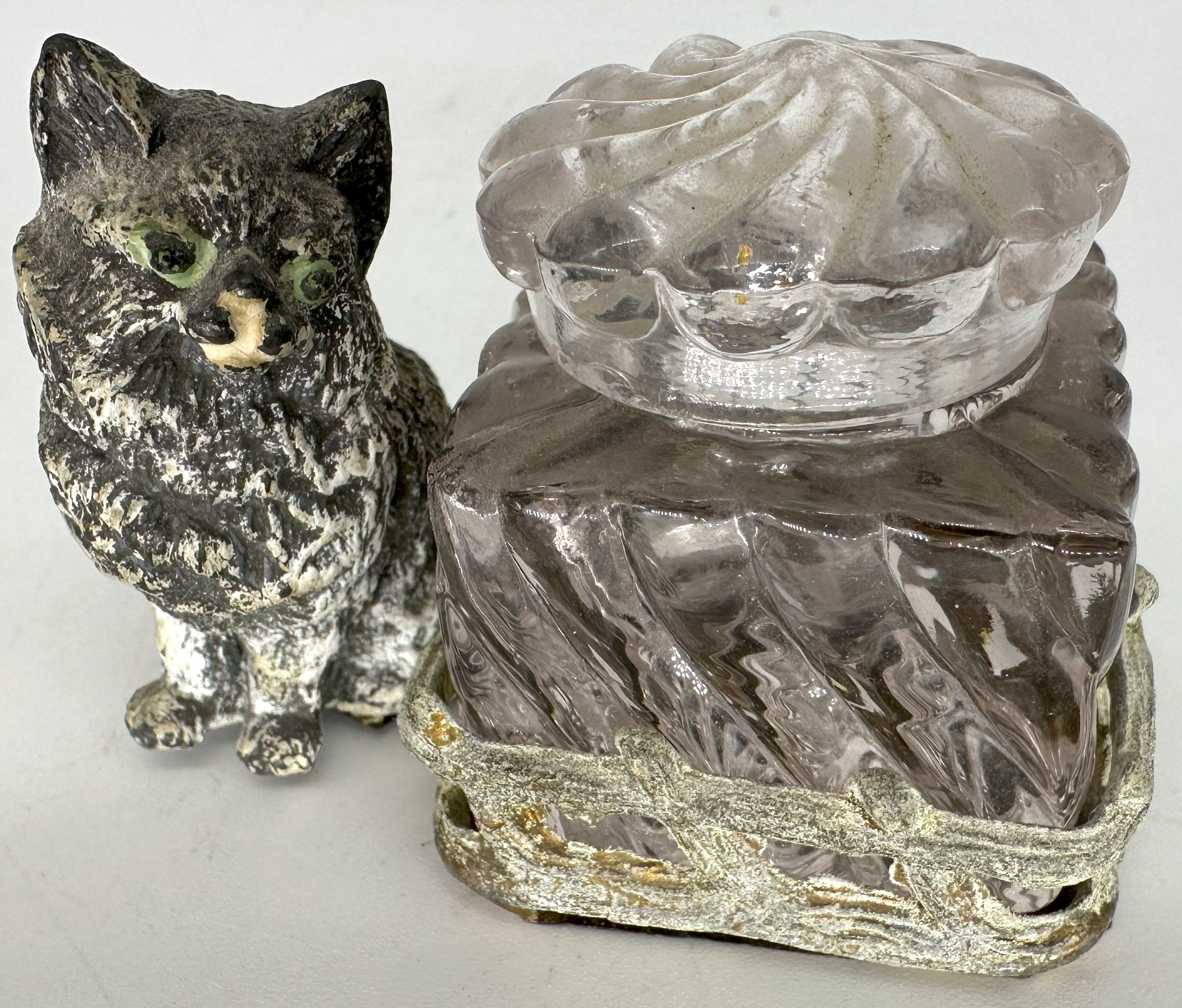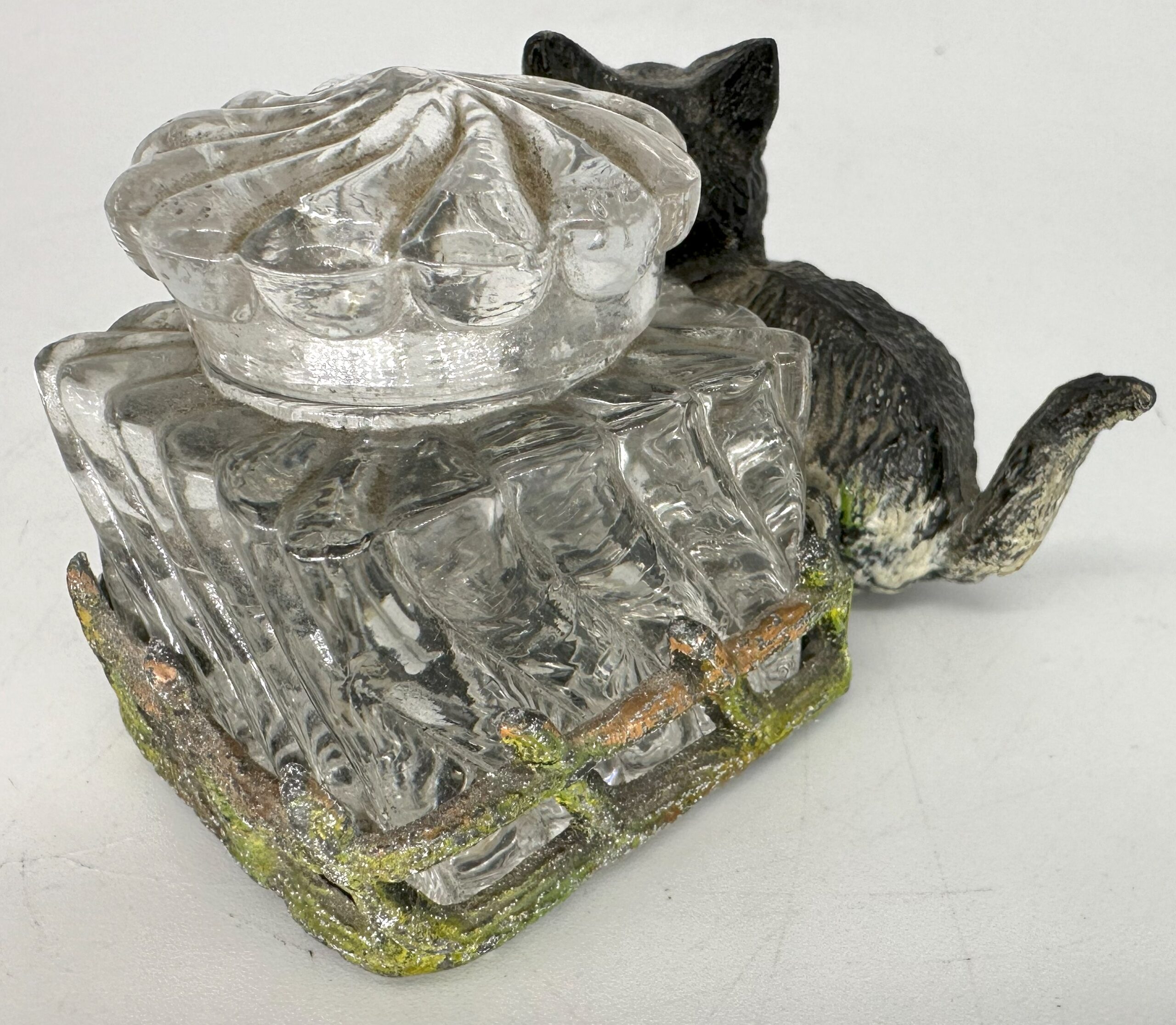 These two pieces are similar. Each cat (made from pot metal and hand-painted) is next to a swirl glass inkwell with a loose cover, fitted inside an open rail fence. One cat is sitting. The other cat, wearing a bow around her neck, has her tail up and looks ready to explore.