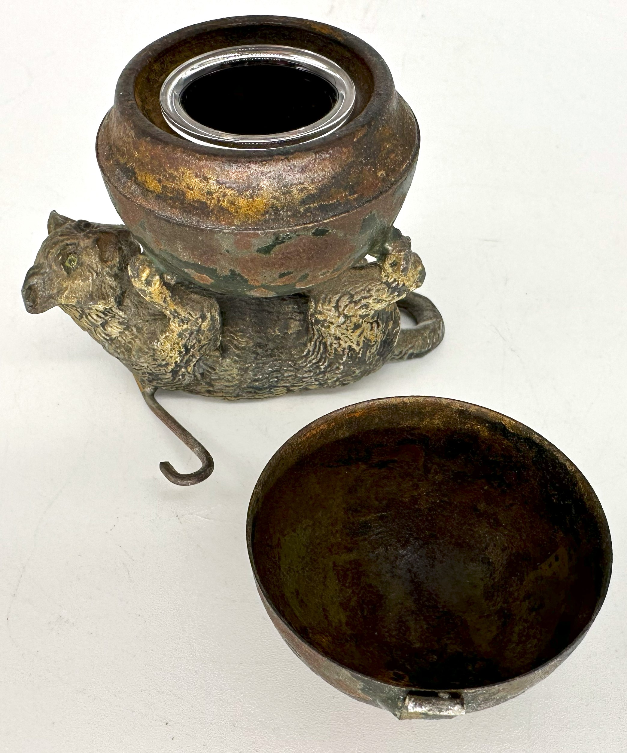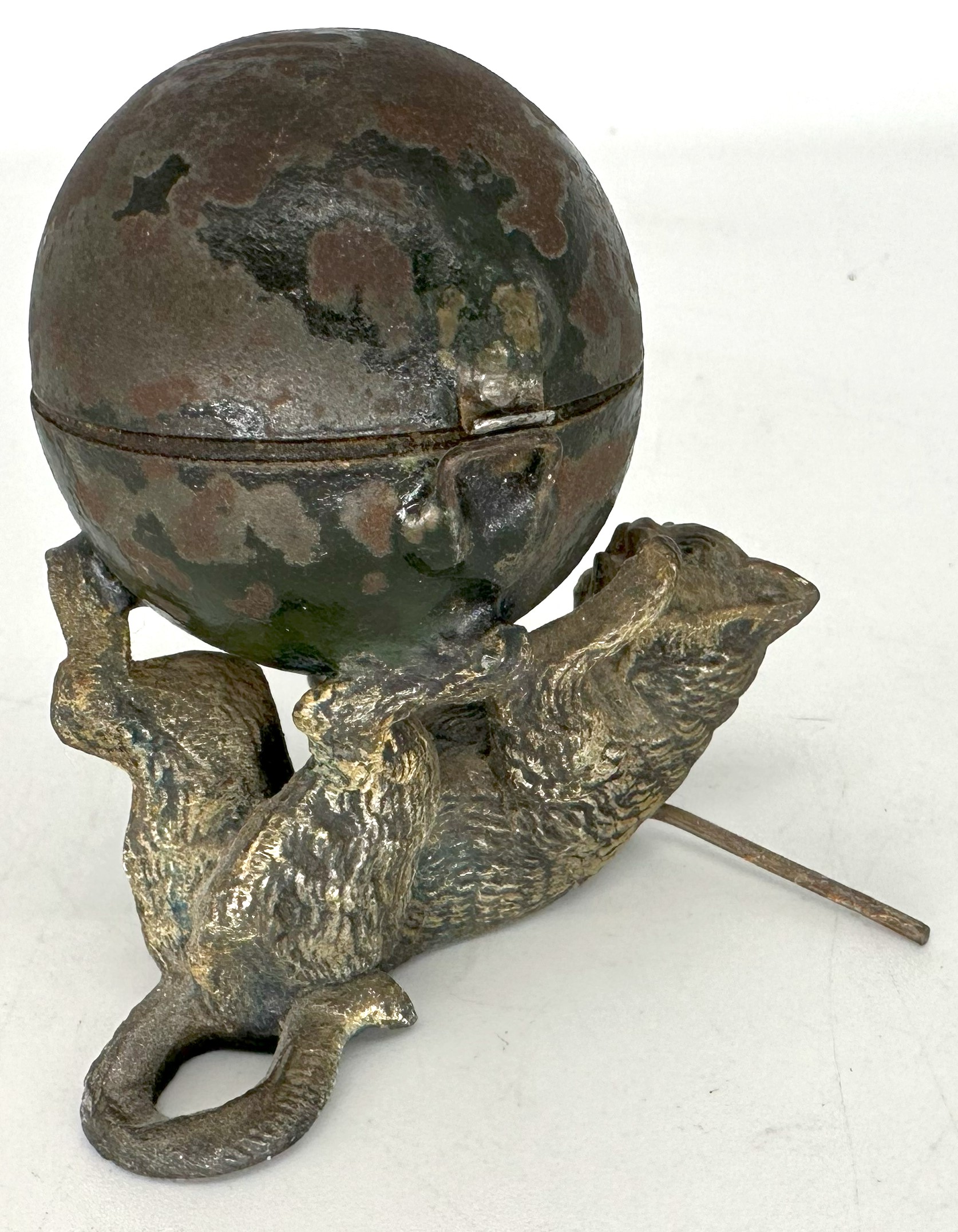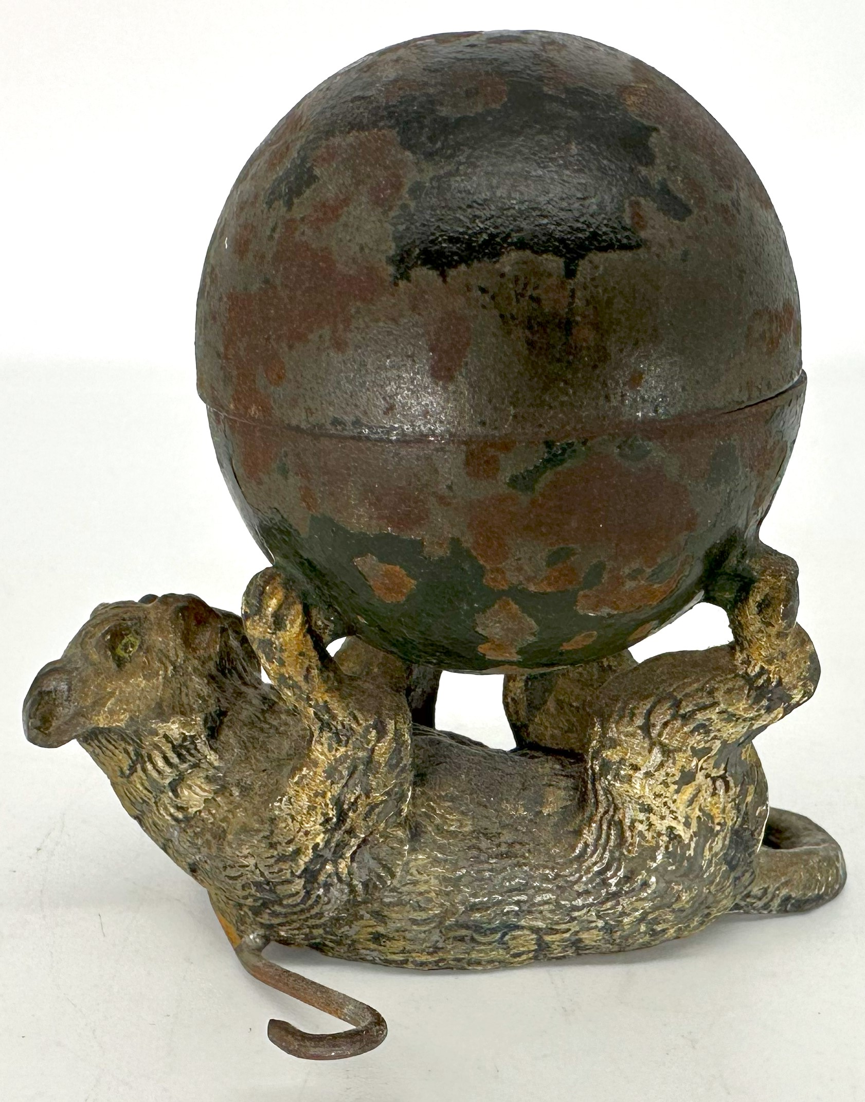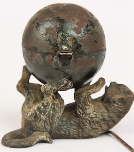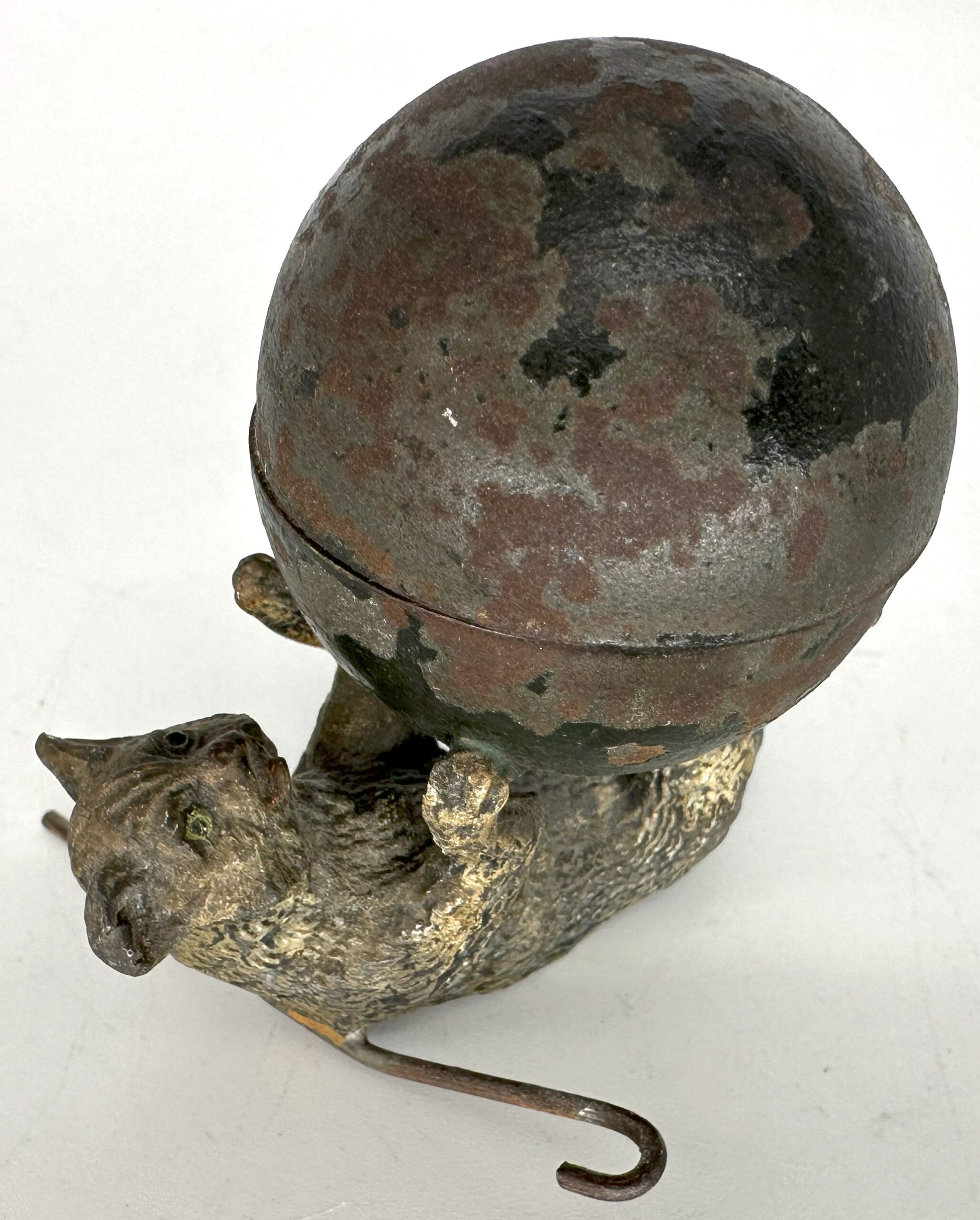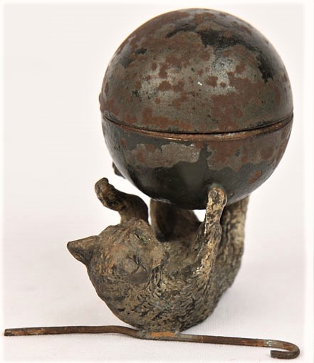 Whimsical cat on his back, playing with a large ball (the inkwell). There is paint loss and a broken hinge. The cat is lying on a cane (to stabilize).
